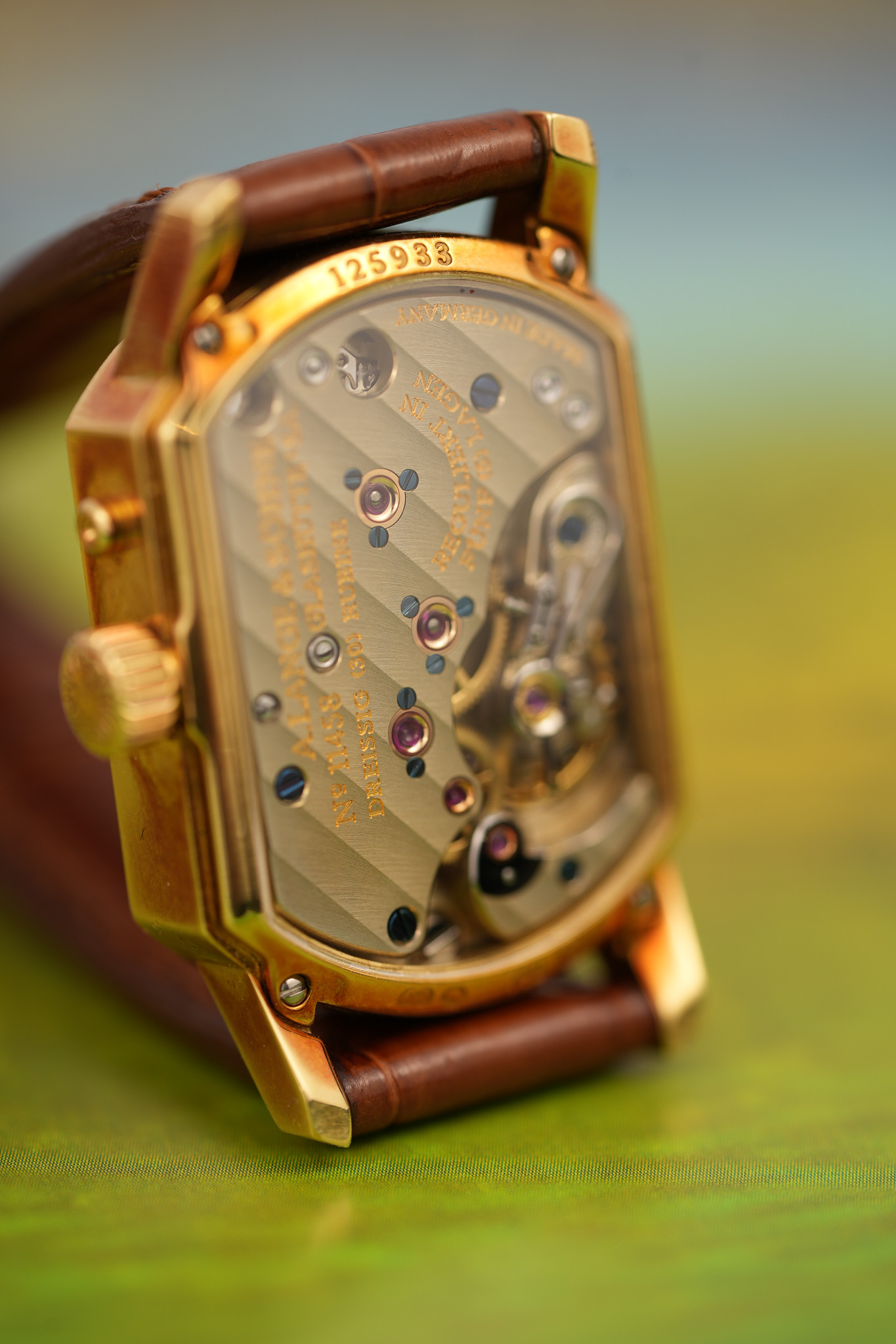 Flip it over, and you’re greeted with one of Lange’s greatest party tricks: a sapphire caseback that reveals the L911 movement in all its glory. It’s hand-finished in the same style as their grande complications — Glashütte stripes, hand-engraved balance cock, and gold chatons held by blued screws. Despite its size, it delivers a full 42-hour power reserve, which is almost cheeky for something this refined.