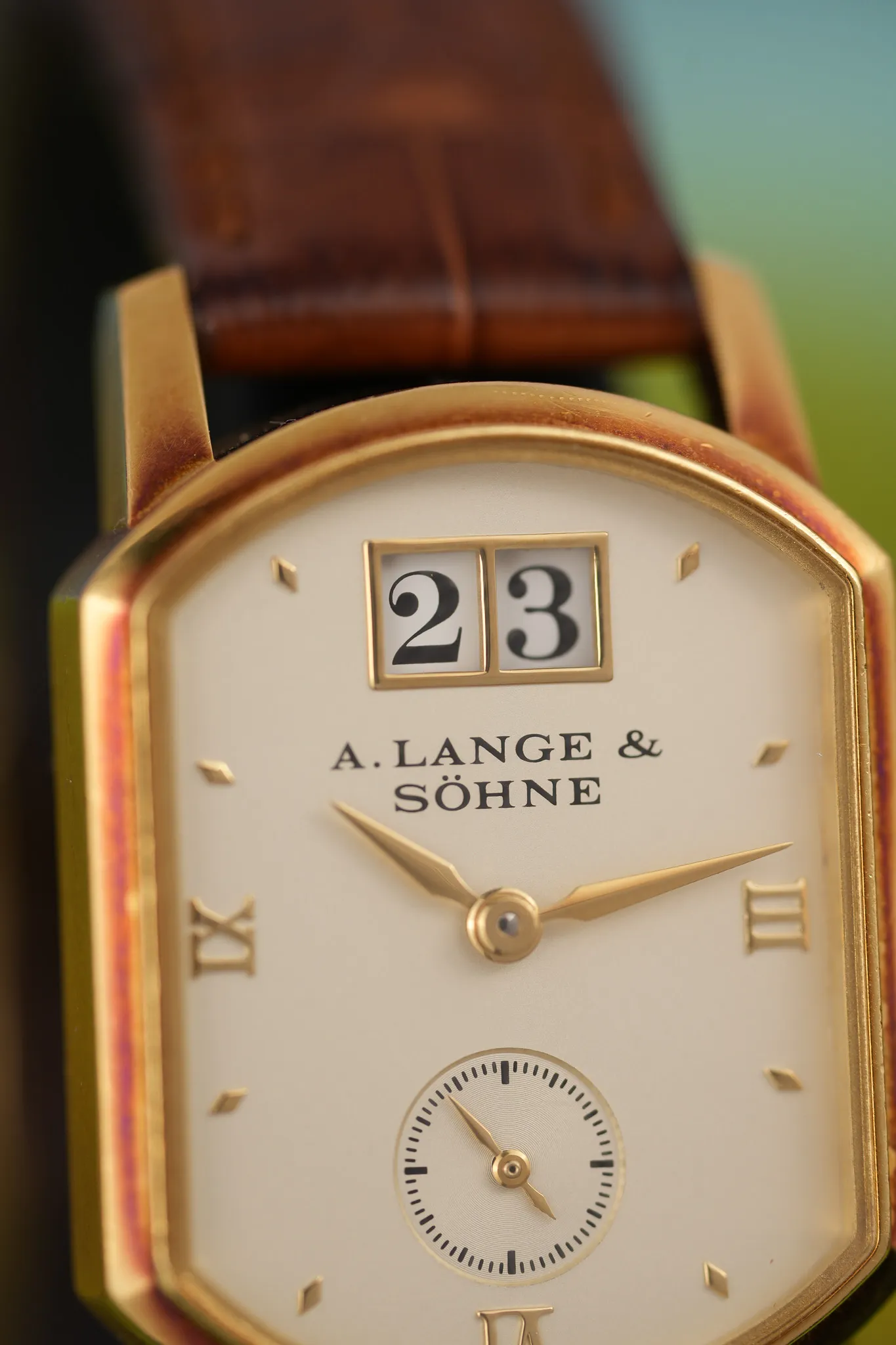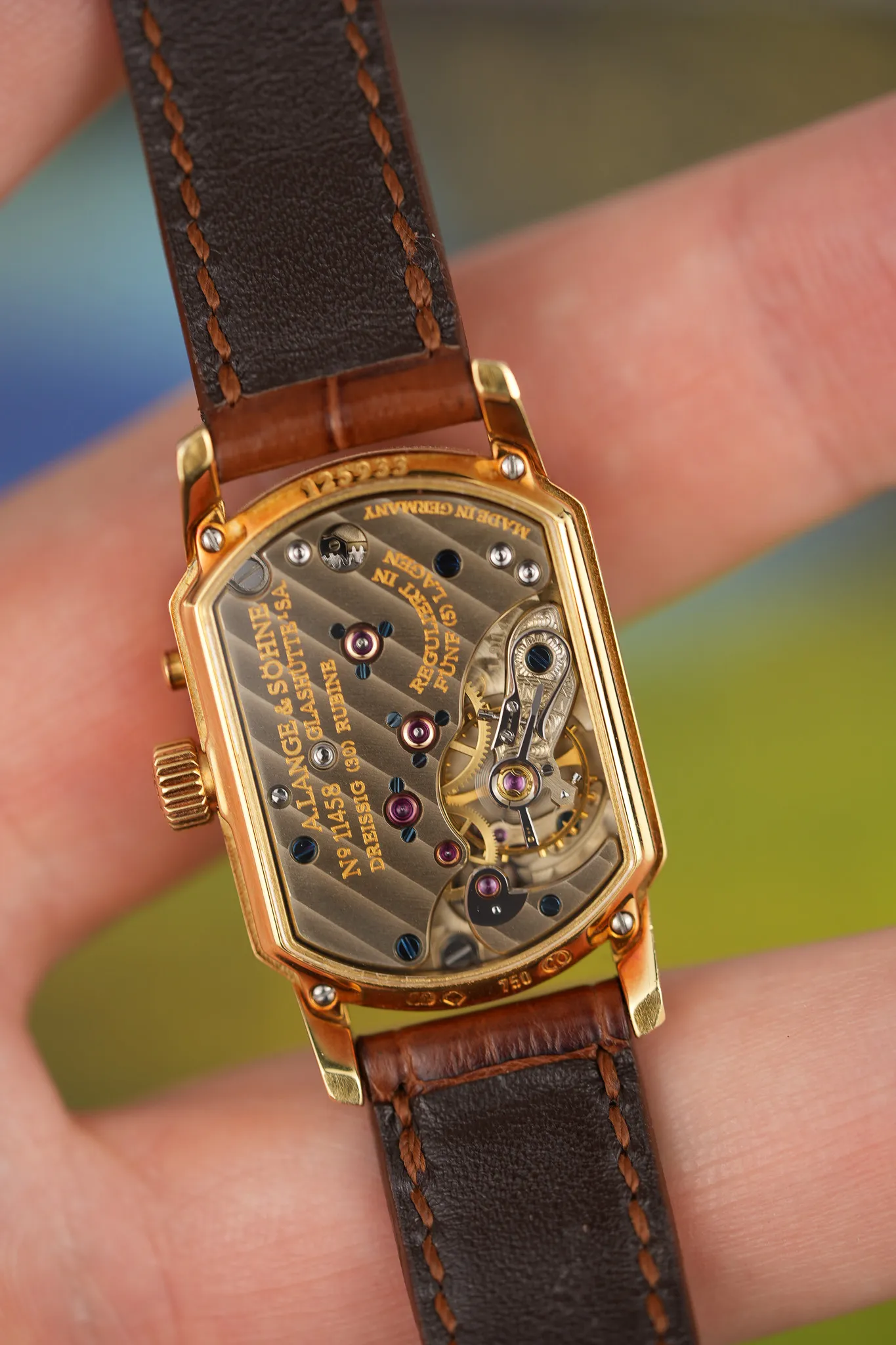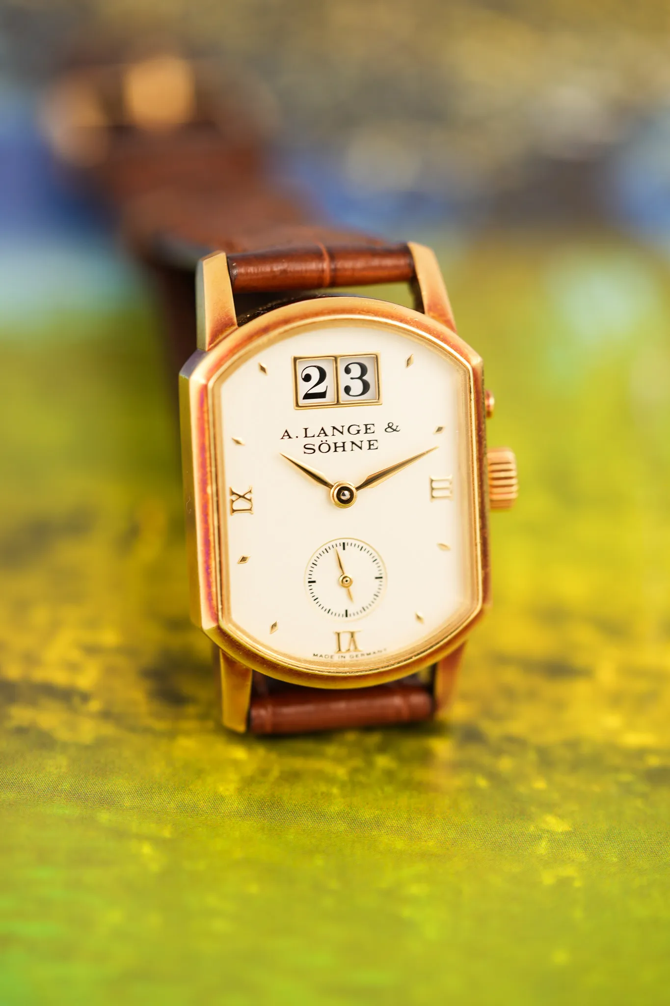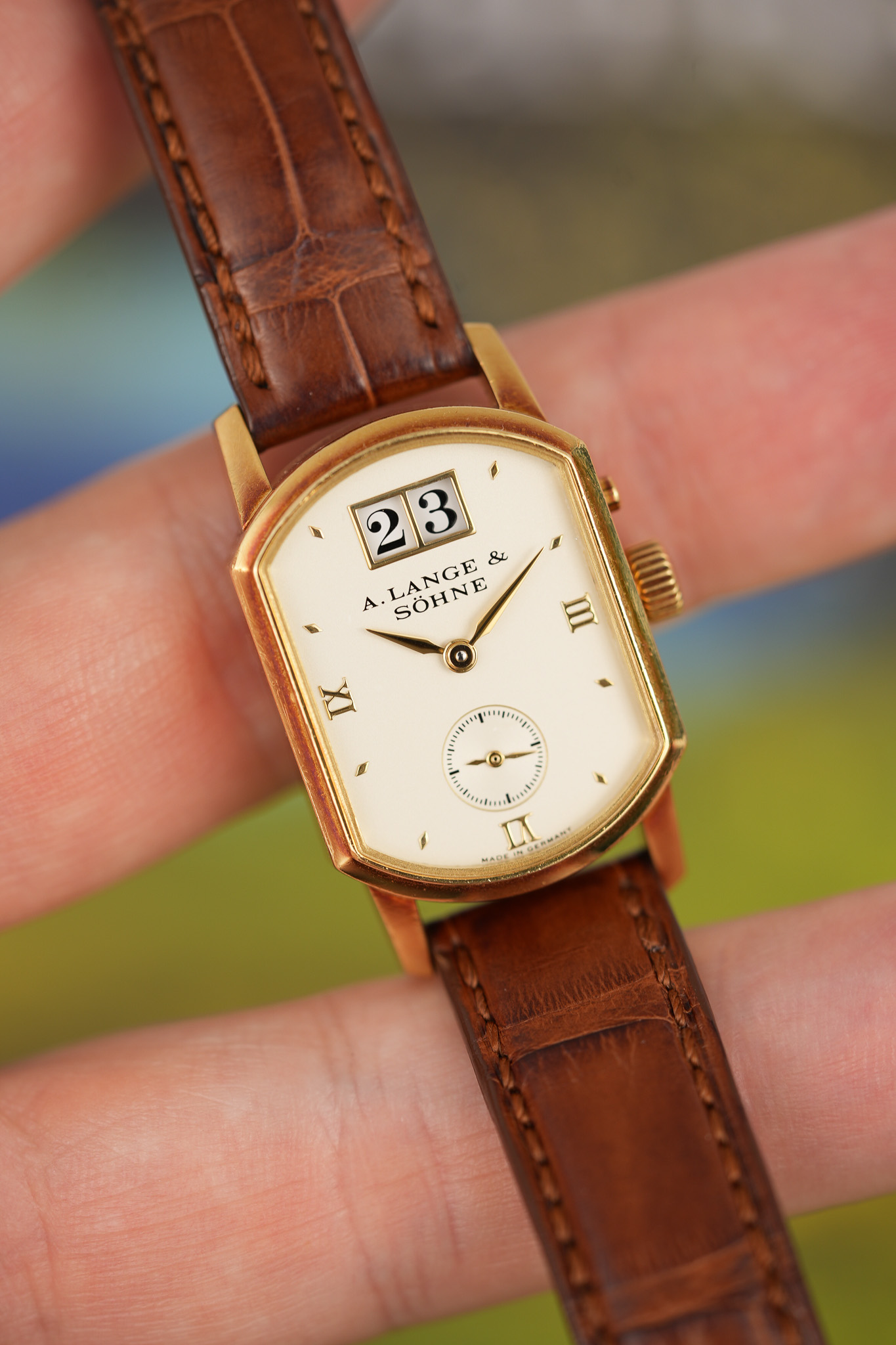 This reference, the 103.021, is the sweet spot of the series — 29 × 22 mm of yellow gold with a white dial that plays just the right amount of warm. The case, almost tonneau but not quite, is said to be inspired by the arcades of Dresden Castle — or, if you prefer, the arched walkways of Bologna (yes, the Italians will argue for credit). The slender, faceted lugs slope neatly downward, letting the watch sit close to the wrist.