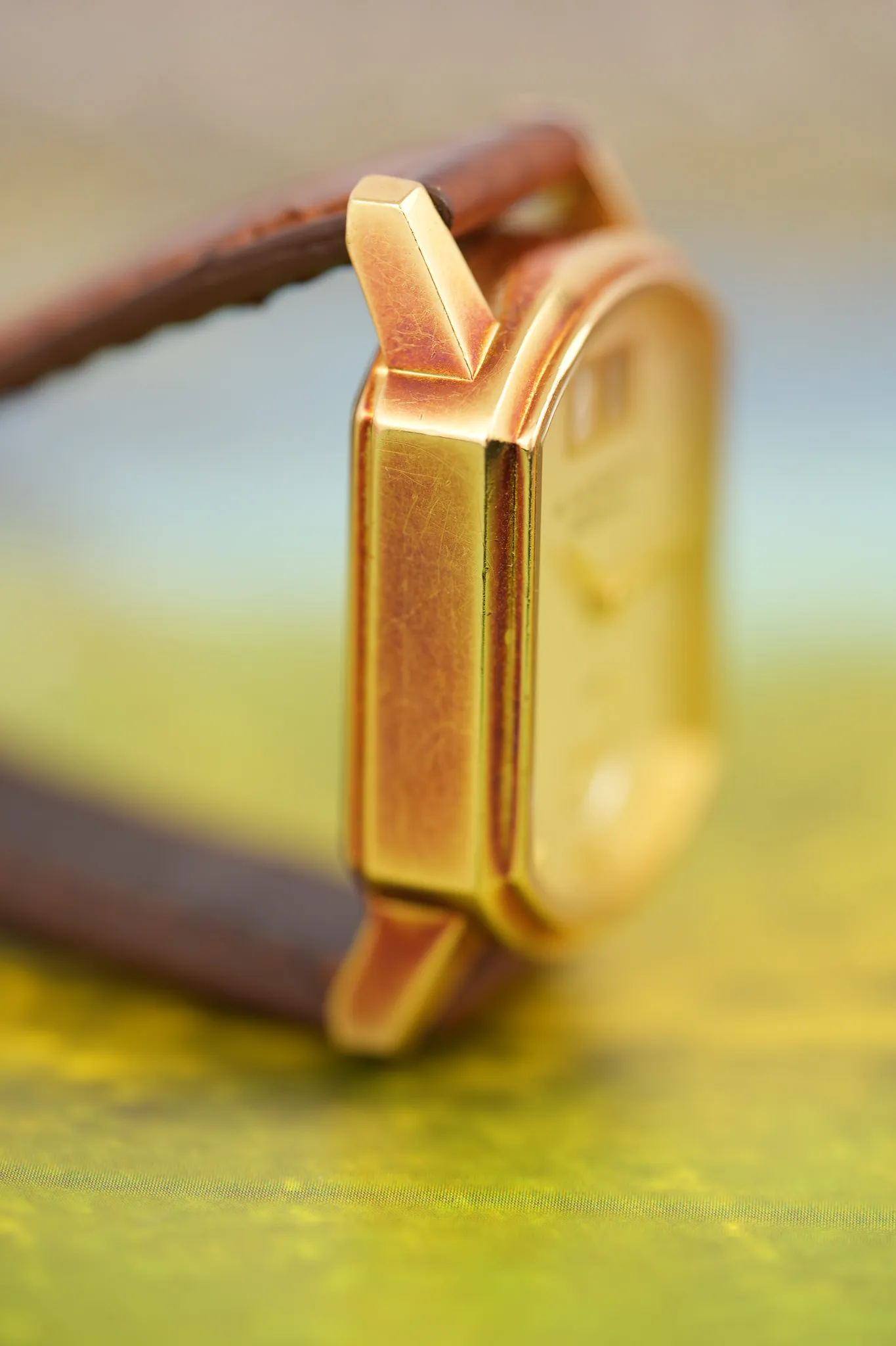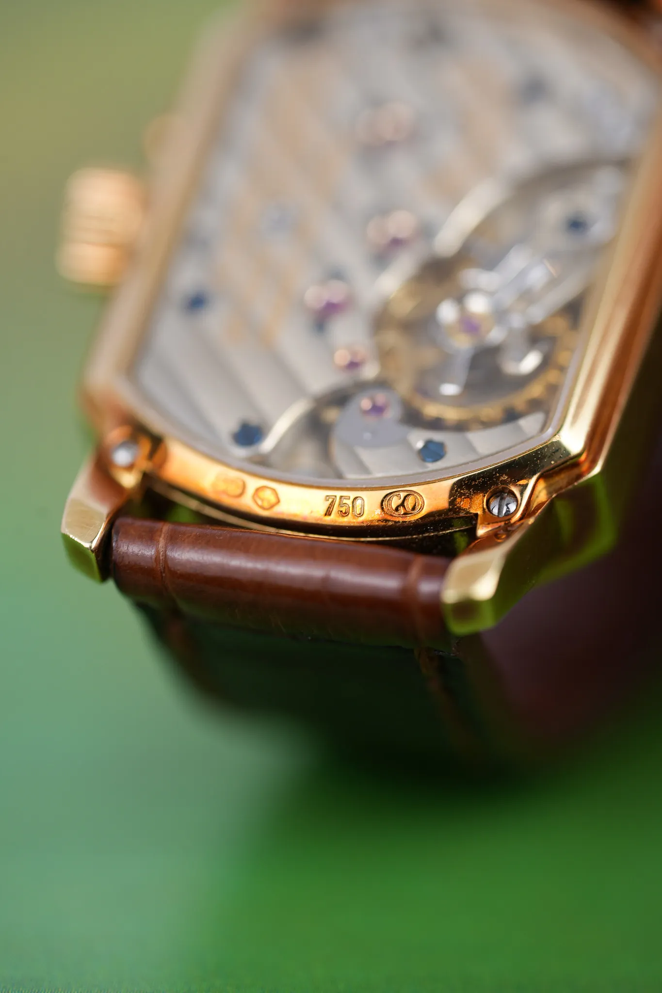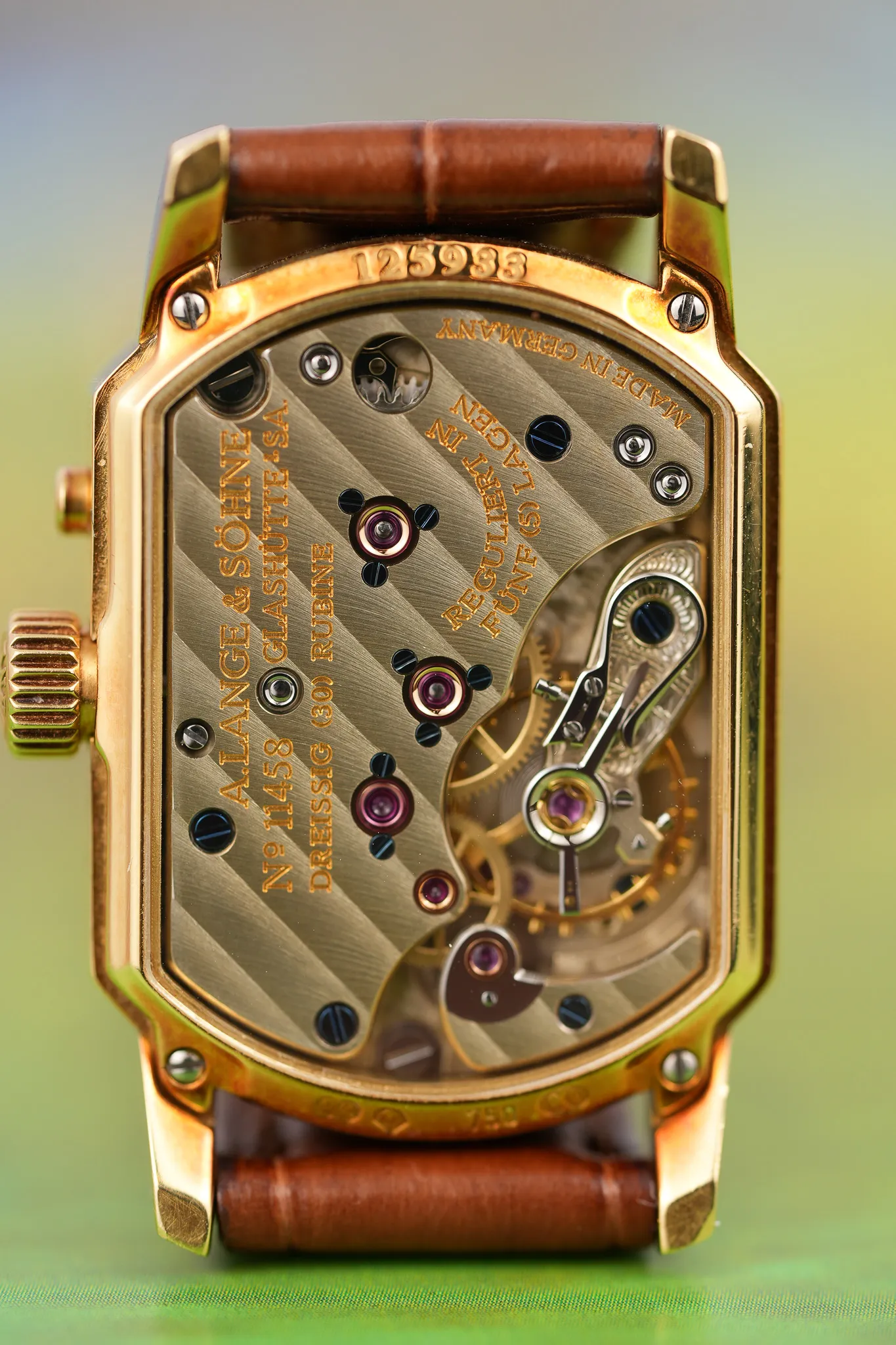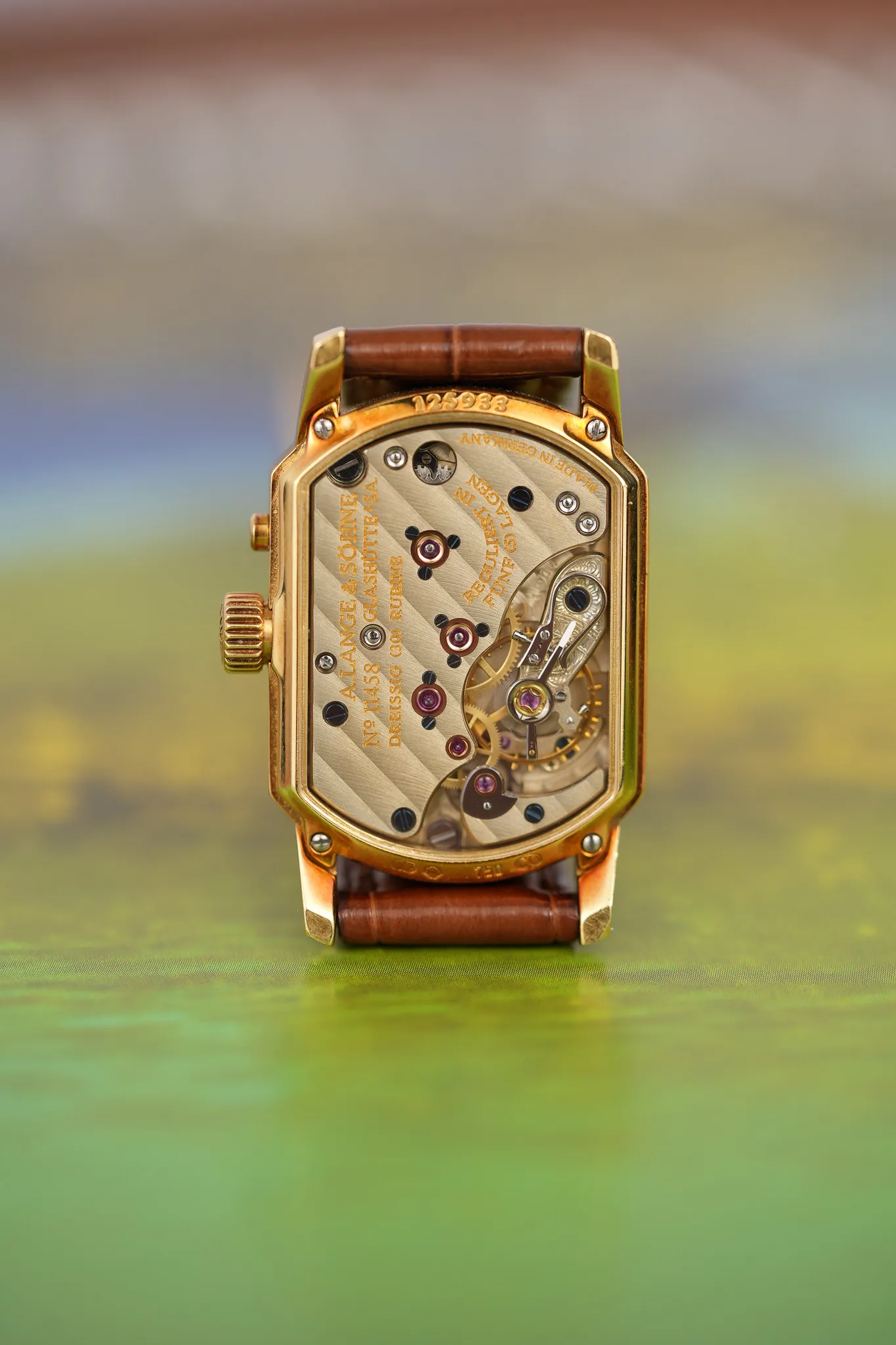 This reference, the 103.021, is the sweet spot of the series — 29 × 22 mm of yellow gold with a white dial that plays just the right amount of warm. The case, almost tonneau but not quite, is said to be inspired by the arcades of Dresden Castle — or, if you prefer, the arched walkways of Bologna (yes, the Italians will argue for credit). The slender, faceted lugs slope neatly downward, letting the watch sit close to the wrist.