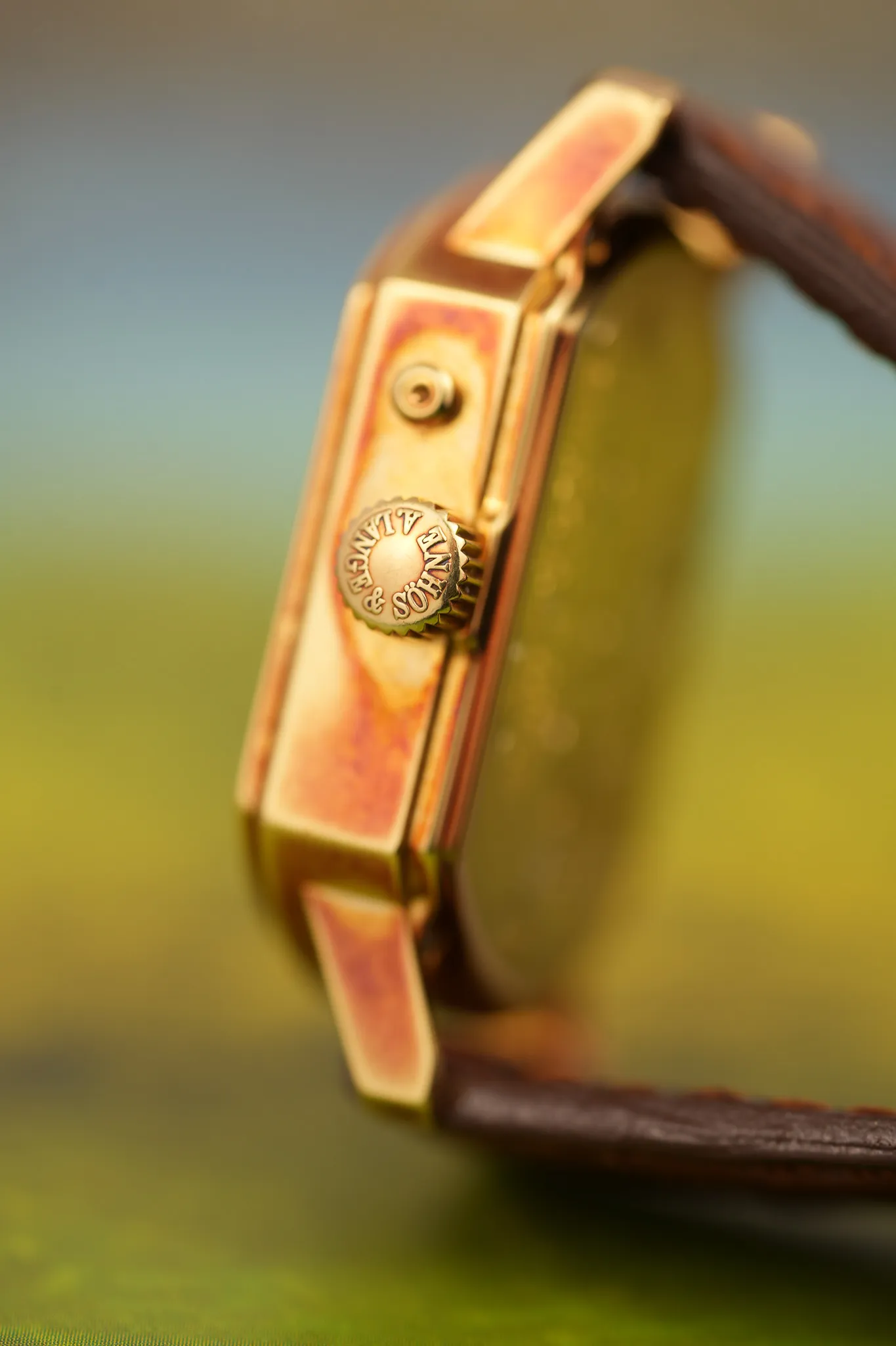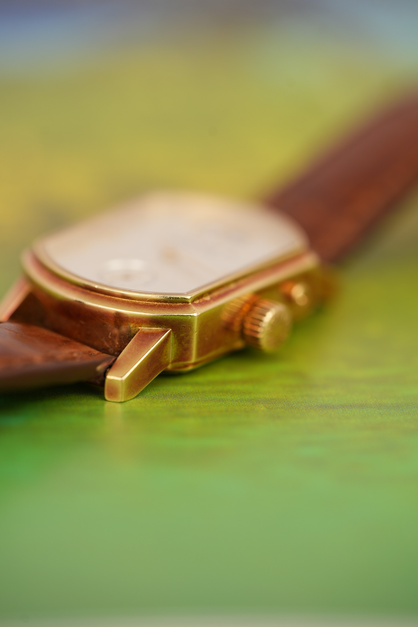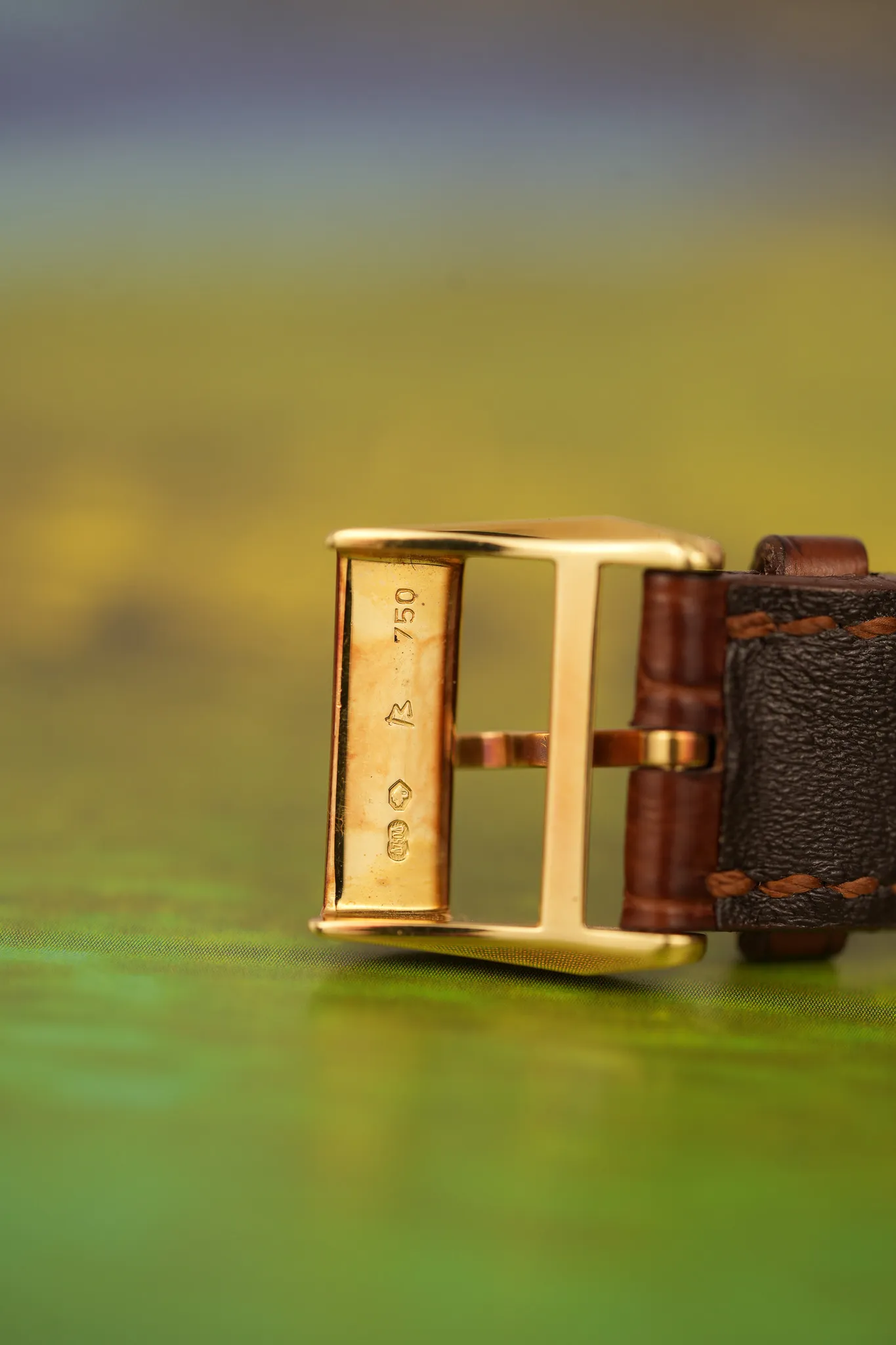 This one’s particularly charming thanks to its patina — the yellow gold case has mellowed into a warm, almost honeyed hue, especially along the bezel edges and lugs. The champagne dial has stayed wonderfully clean, which keeps the contrast sharp and crisp. Paired with its original Lange strap and matching 18k buckle, it’s a complete little package that feels as much like a design object as a watch.
