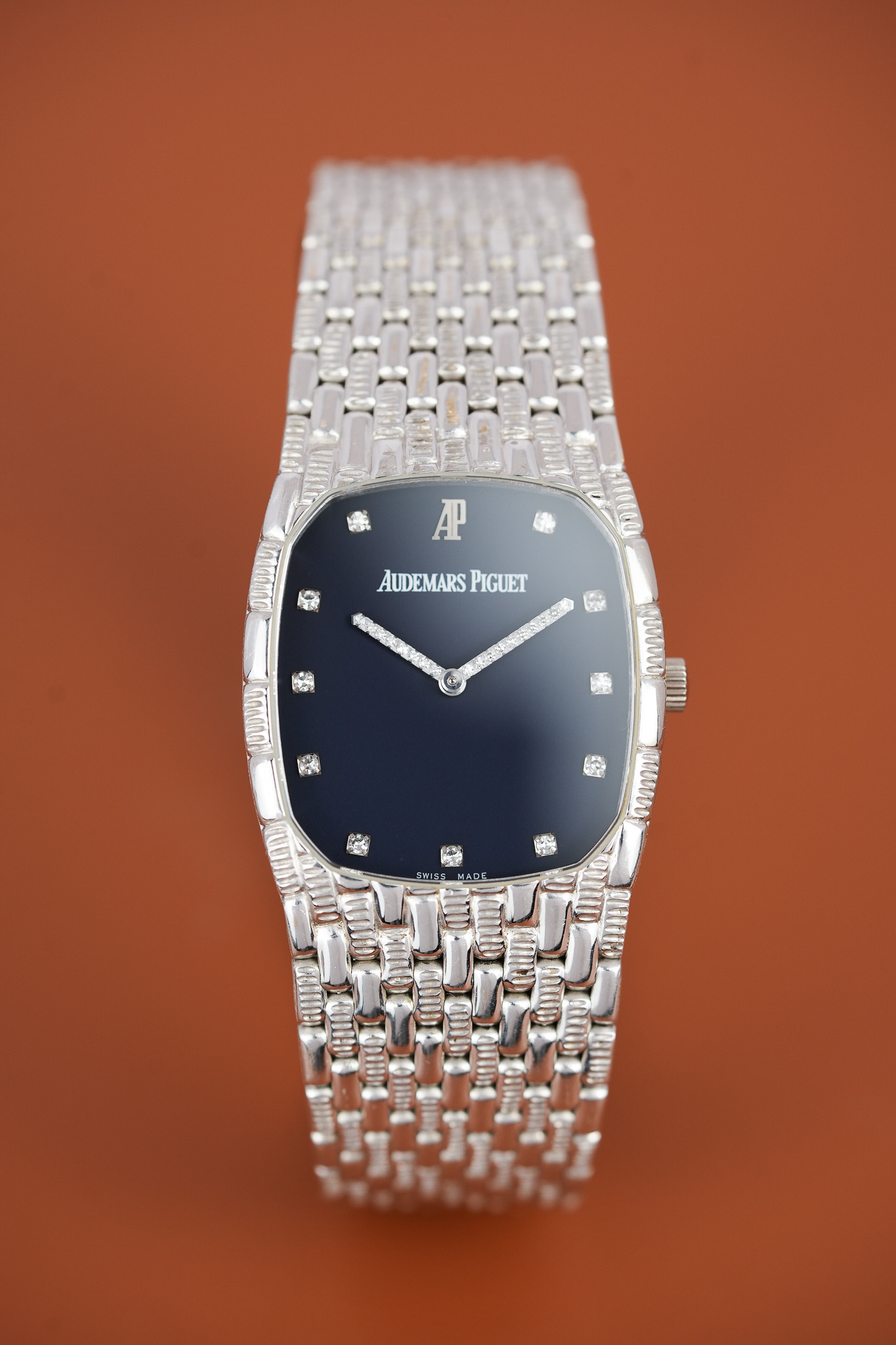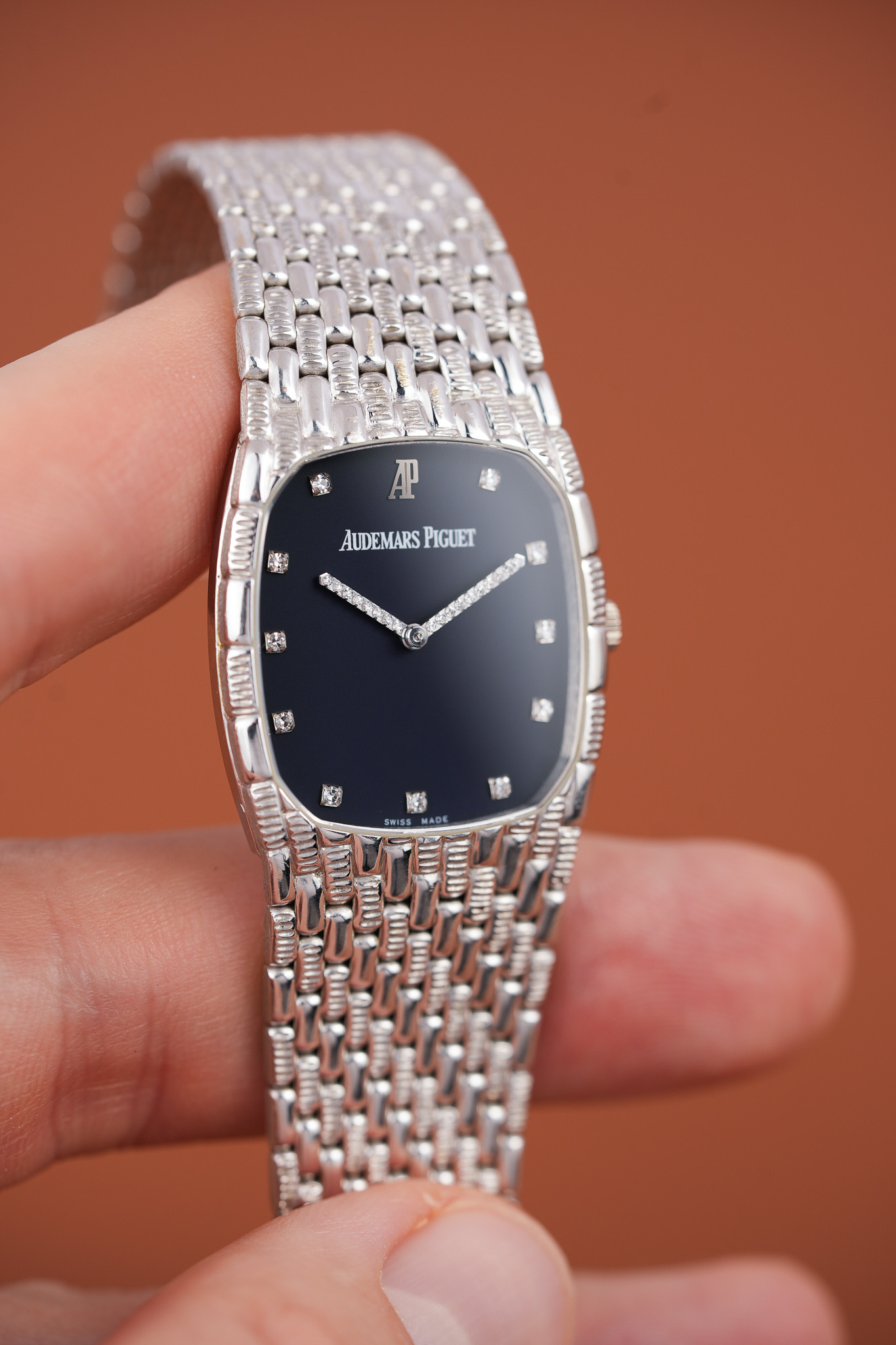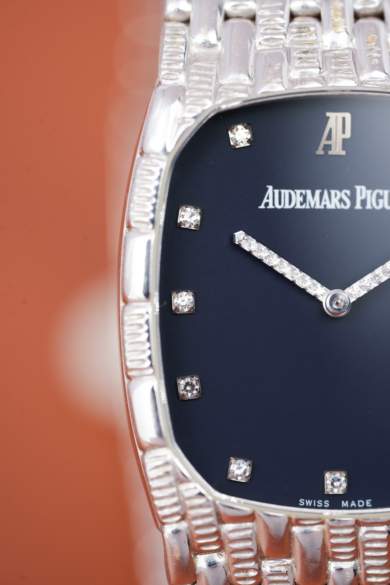 Then you meet the hands. AP set them with diamonds in tight little blocks, almost like a pixel game frozen in motion. The hour markers follow that same energy. Each bright point sits against a deep blue dial that anchors all the sparkle without competing with it. The white printed signature and the white gold double AP emblem mark this as the last generation of the vintage Cobras.