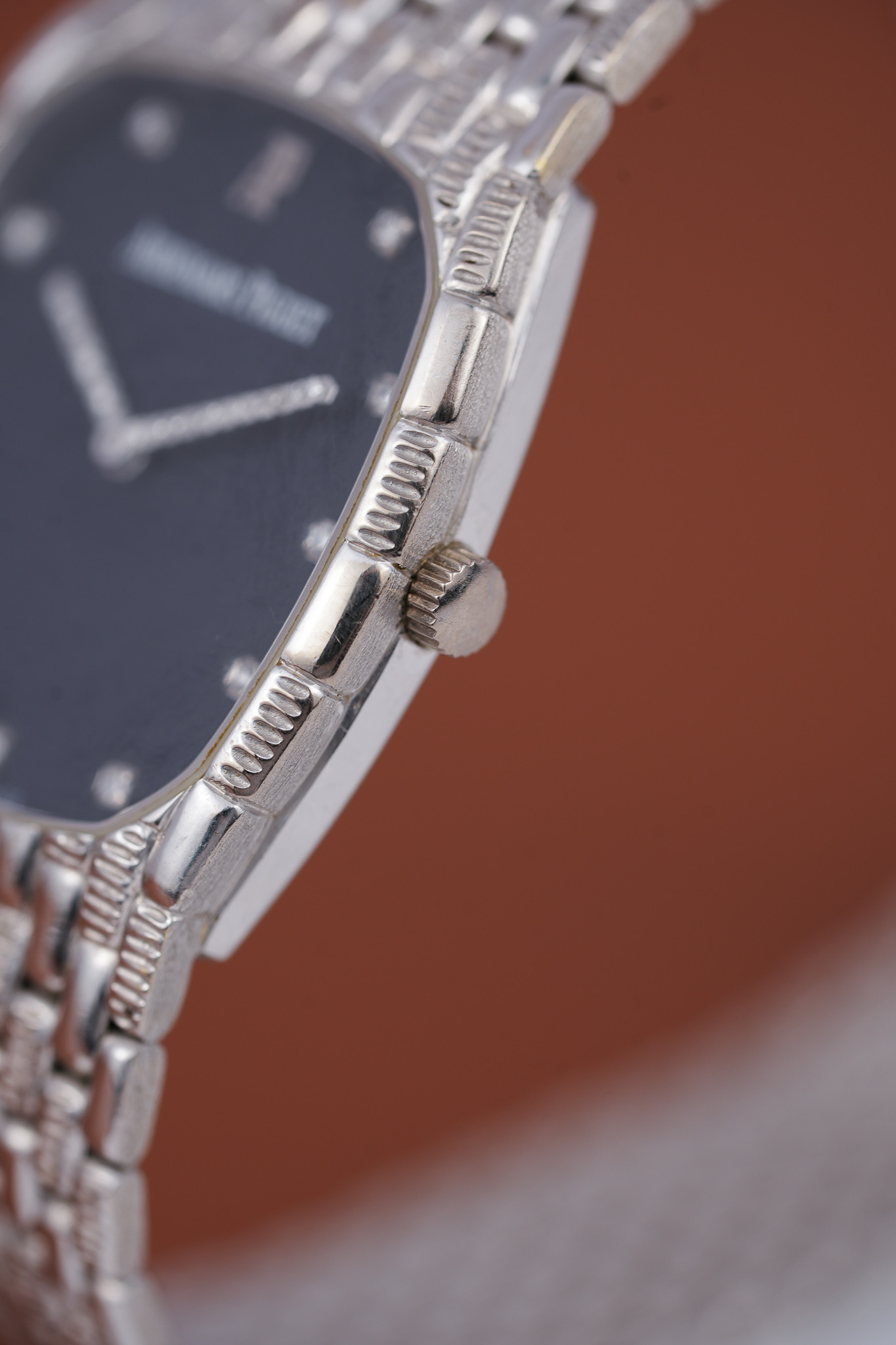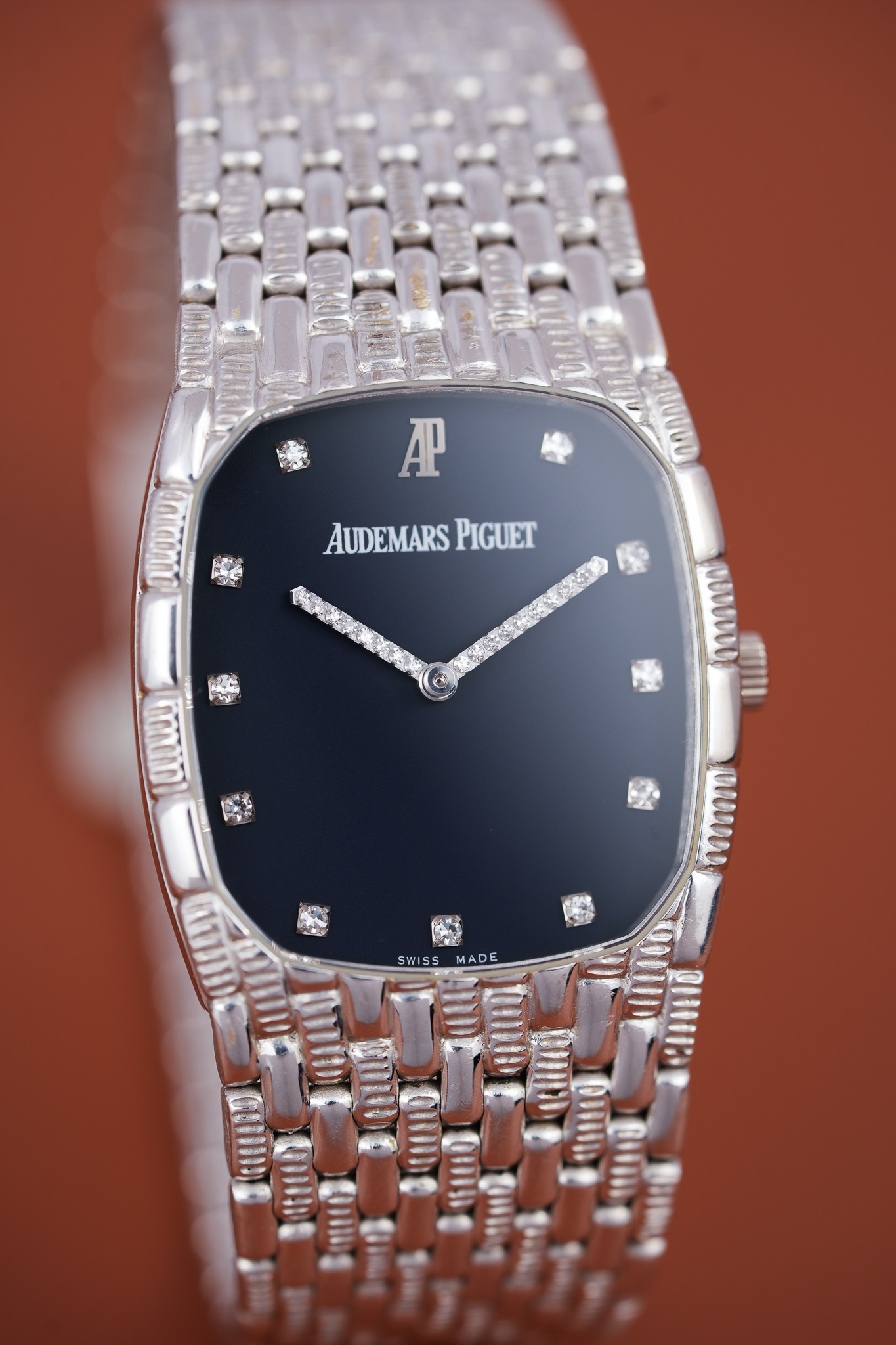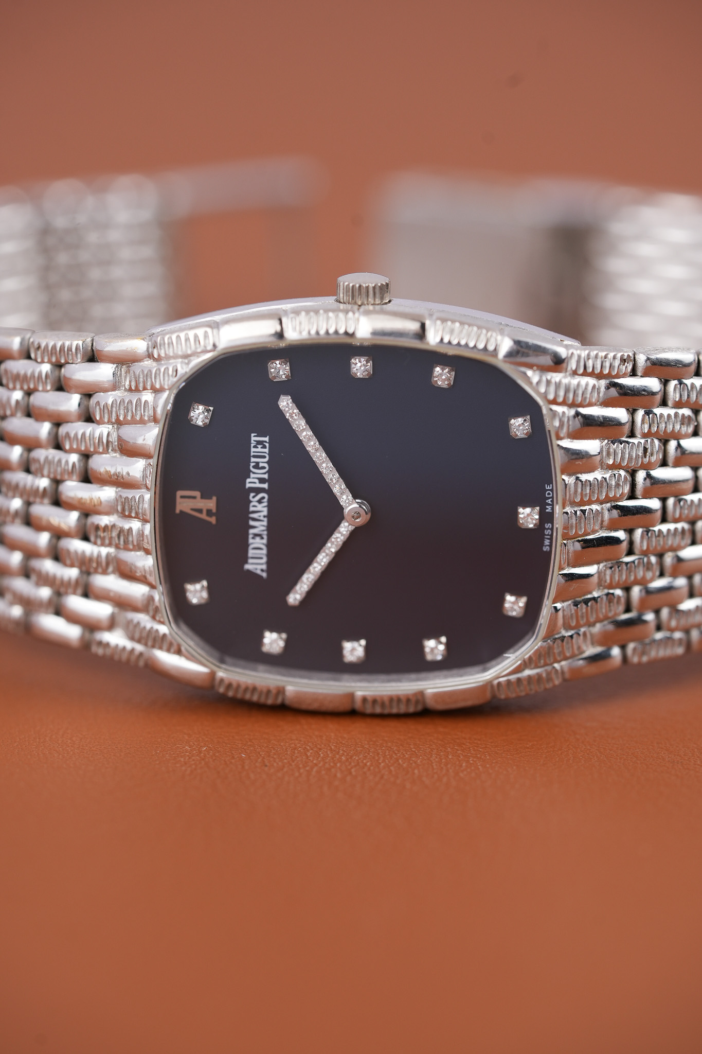 Then you meet the hands. AP set them with diamonds in tight little blocks, almost like a pixel game frozen in motion. The hour markers follow that same energy. Each bright point sits against a deep blue dial that anchors all the sparkle without competing with it. The white printed signature and the white gold double AP emblem mark this as the last generation of the vintage Cobras.