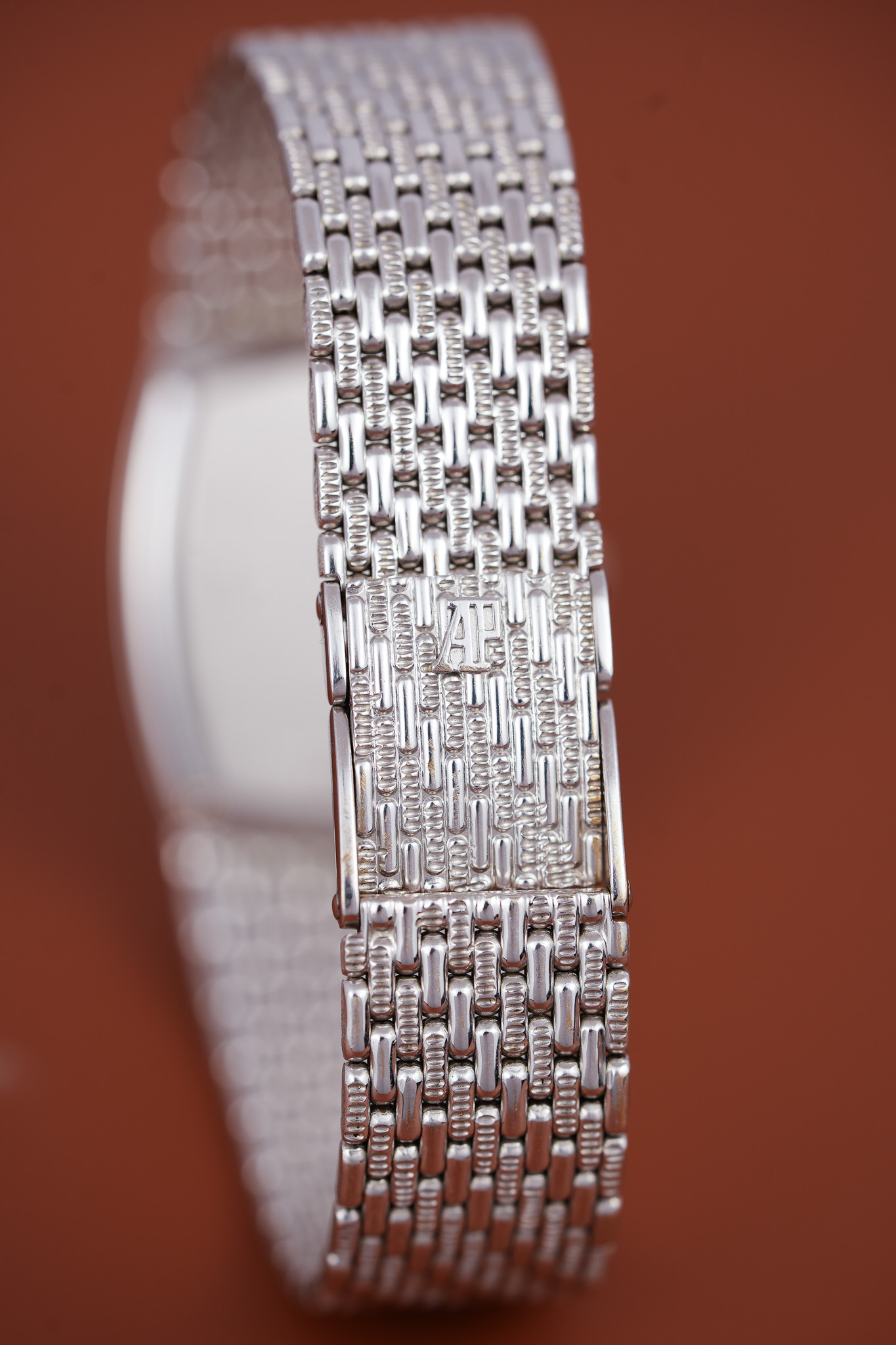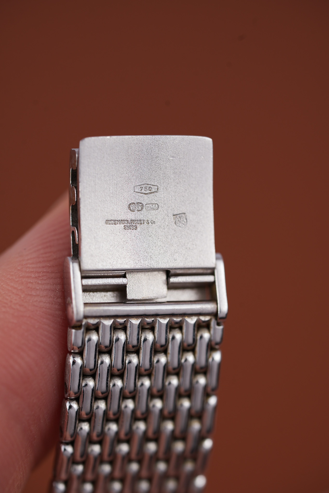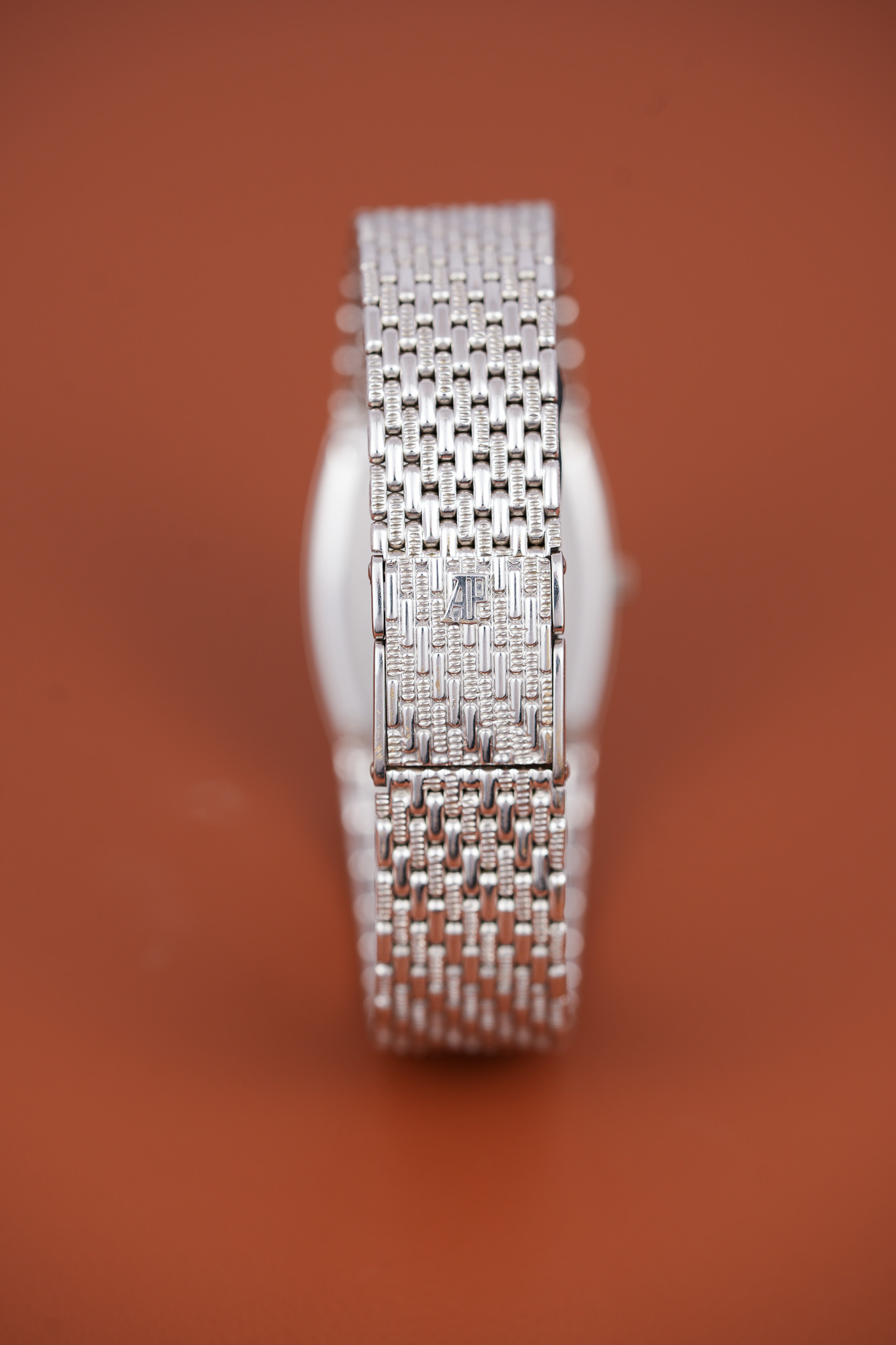 The bracelet itself reads like someone at Le Brassus had too much fun with textures. Each link has a pill-shaped form with opposing ridges that catch light in unpredictable ways. The clasp carries the AP emblem and offers three microadjust positions, which is extremely polite for a watch that otherwise enjoys being dramatic.