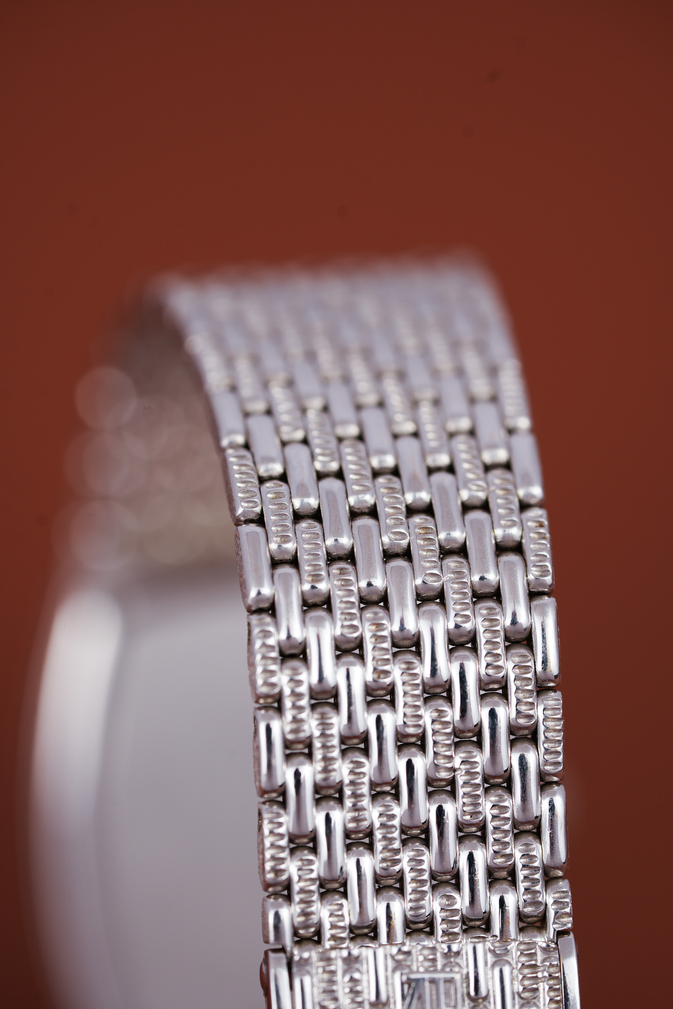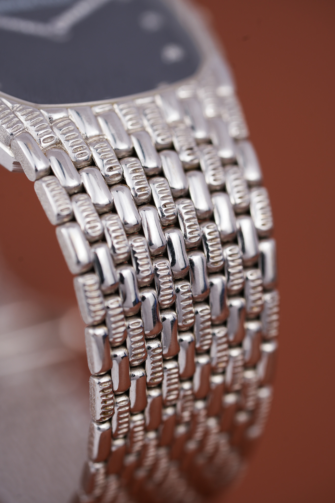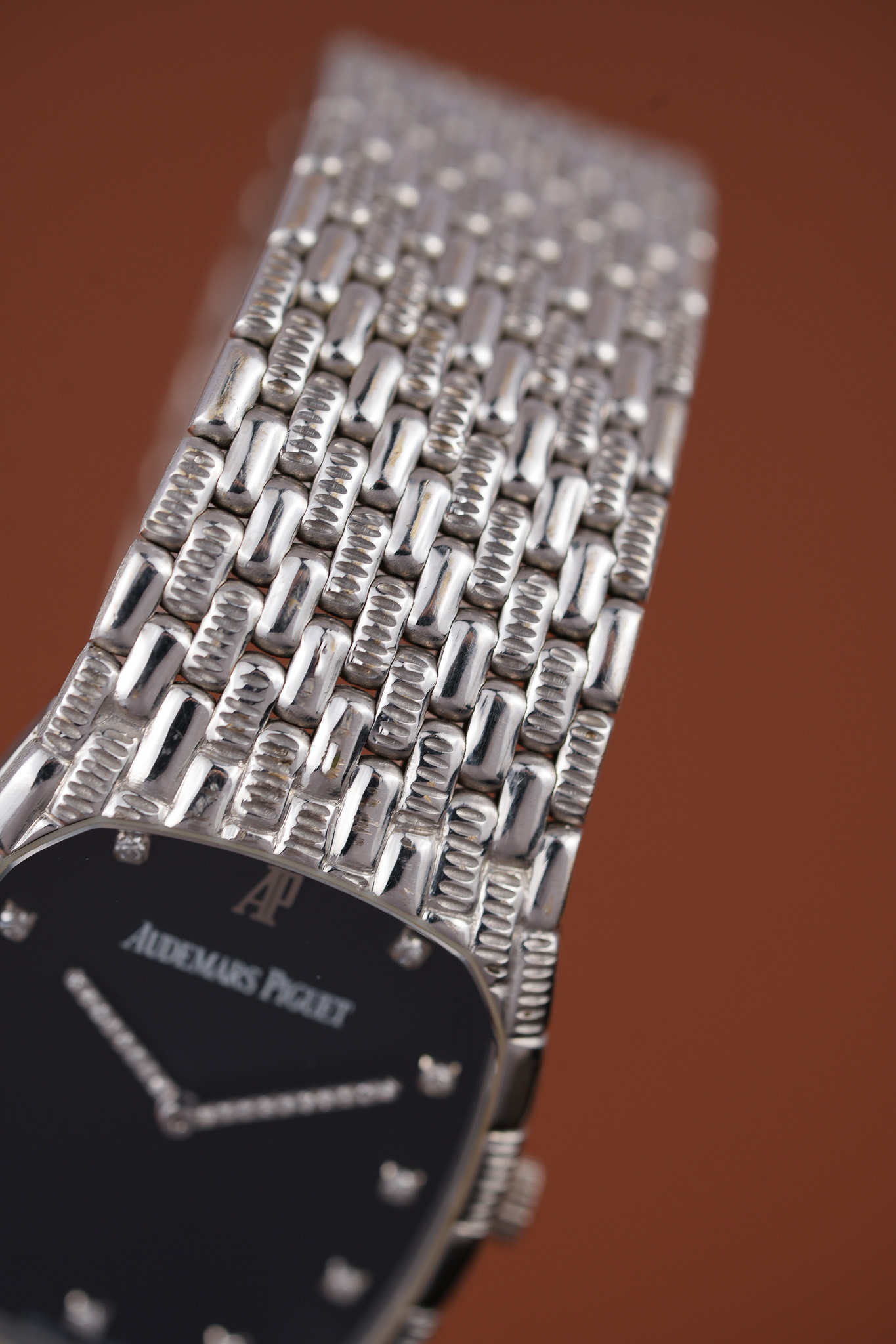 The bracelet itself reads like someone at Le Brassus had too much fun with textures. Each link has a pill-shaped form with opposing ridges that catch light in unpredictable ways. The clasp carries the AP emblem and offers three microadjust positions, which is extremely polite for a watch that otherwise enjoys being dramatic.