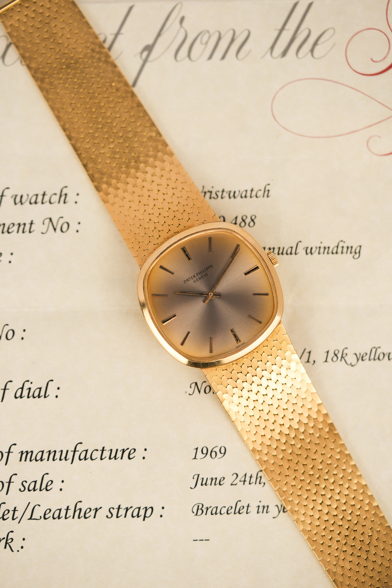 Flowing seamlessly from the case is a woven 18K gold bracelet, made by none other than Jean-Pierre Ecoffey — a name whispered reverently among bracelet connoisseurs. Ecoffey’s work for Patek Philippe, Vacheron Constantin, and Audemars Piguet remains unmatched, and here his signature JPE hallmark hides inside the clasp. The pattern is tight, textured, and almost reptilian — the kind of detail you catch yourself staring at during idle moments.