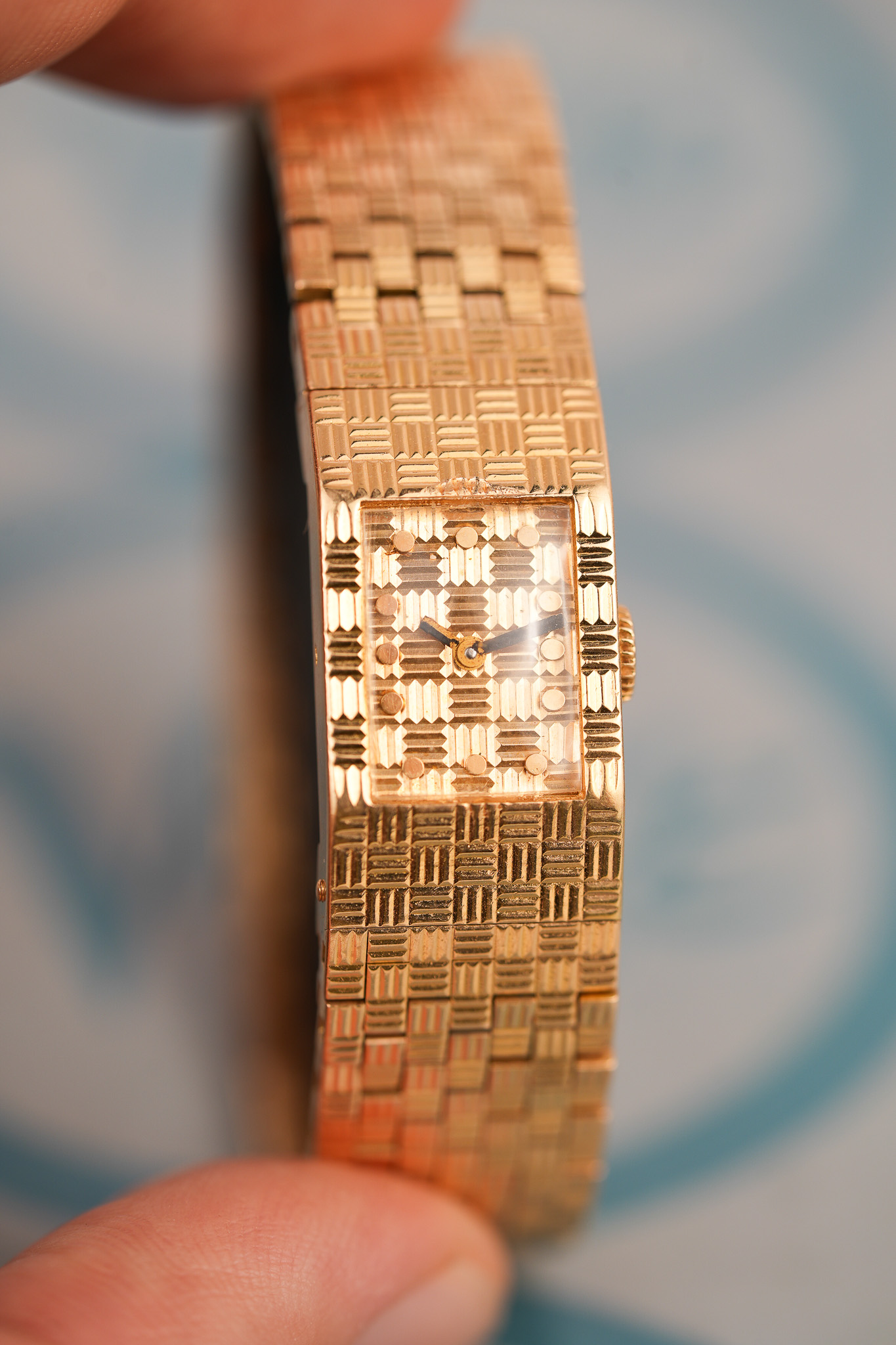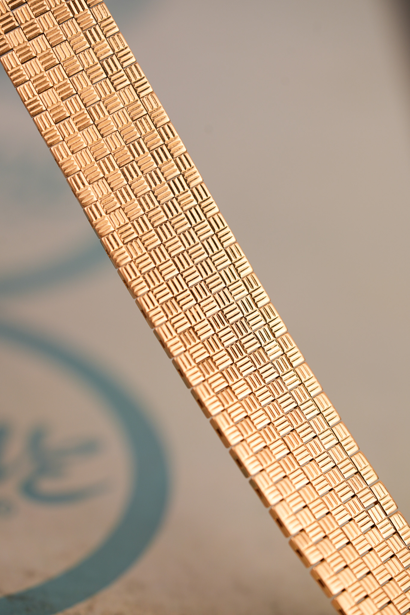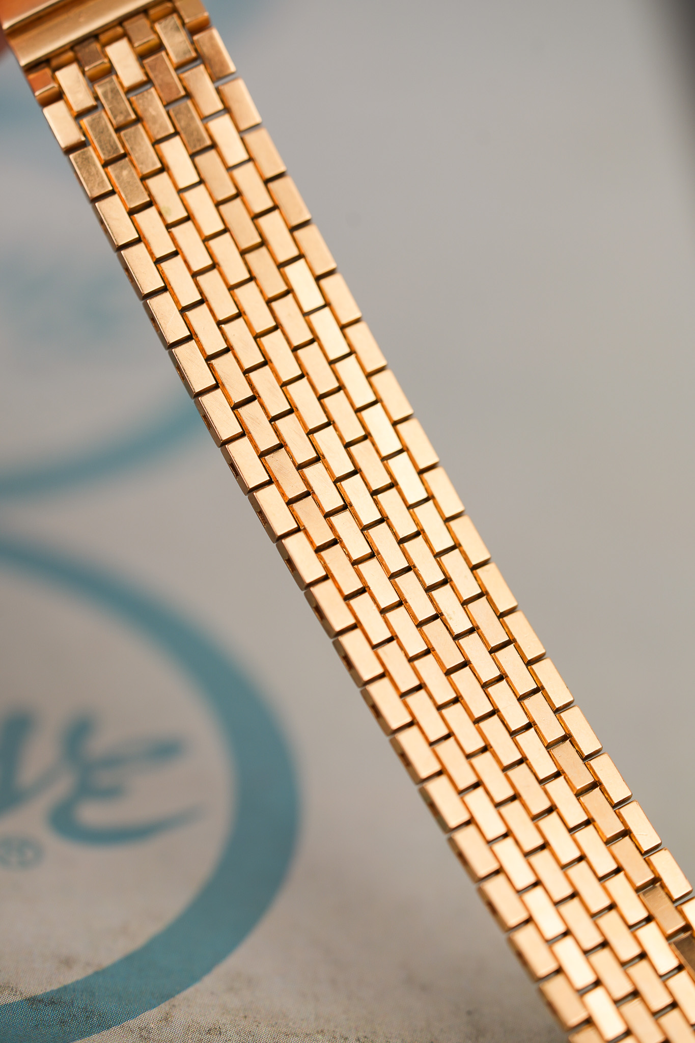 The texture is the real story here. A hobnail-style finish made of tiny, alternating directional lines inside embossed gold cubes, covering everything: the bracelet, case, and even the dial. It’s one of those rare surfaces that looks simple at a glance, but the closer you look, the more it rewards you. Even the hour indices switch it up—circles instead of more squares, just to keep your brain slightly off balance. And the hands? A subtle stroke of black to guide you through the maze.