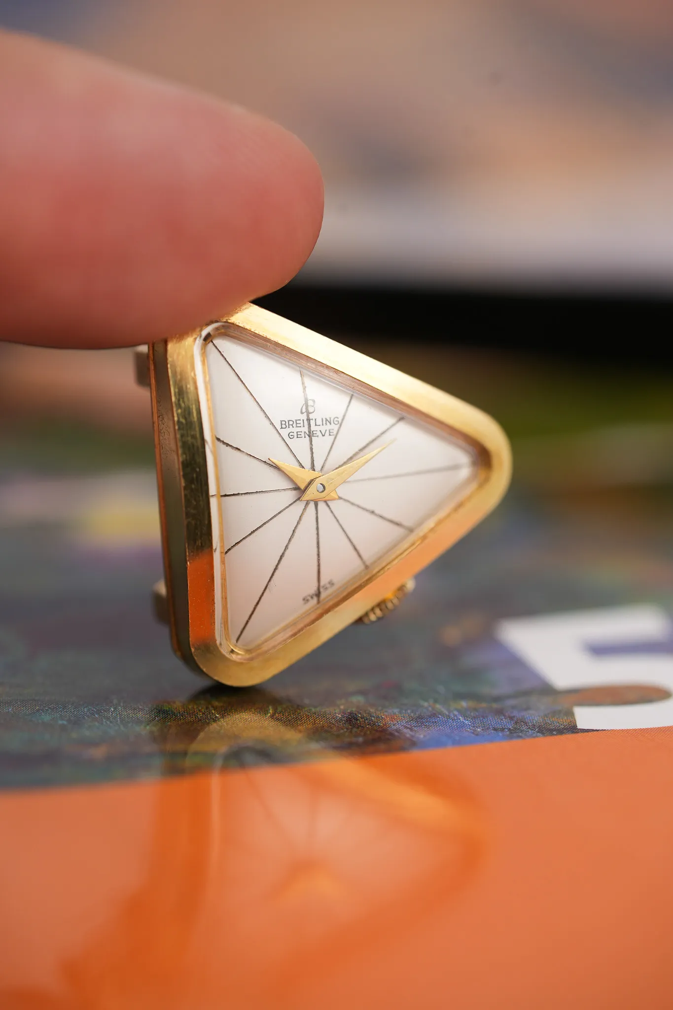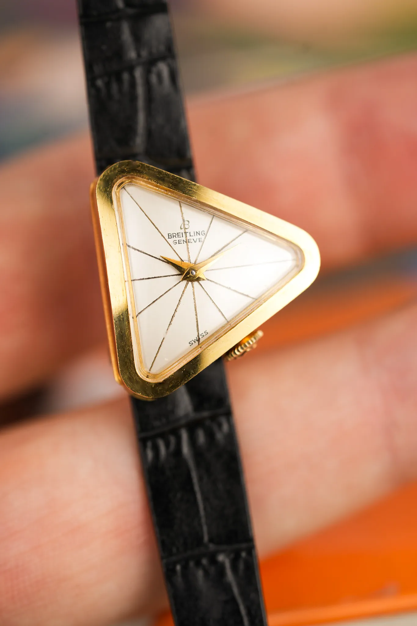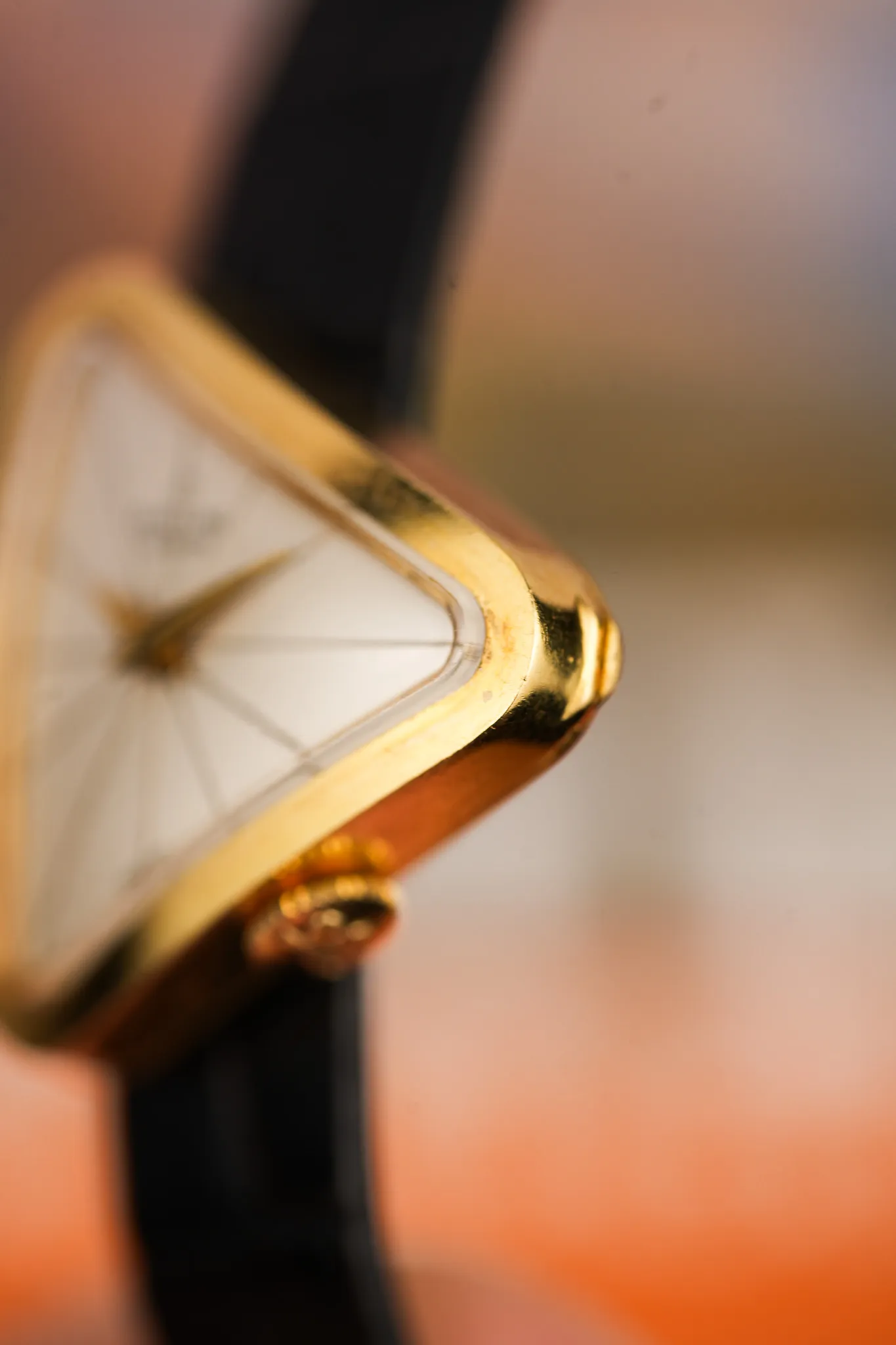 The case is 18k yellow gold, softly worn in the way only decades can accomplish. The crown sits in an unexpected position, reinforcing the sense that this watch was never meant to play it safe. Even the strap attachment feels intentional. Instead of conventional lugs, the leather threads through a triangular opening at the back, allowing the case to float and keeping the silhouette uninterrupted. It is a small detail that changes how the watch wears and how it feels on the wrist.