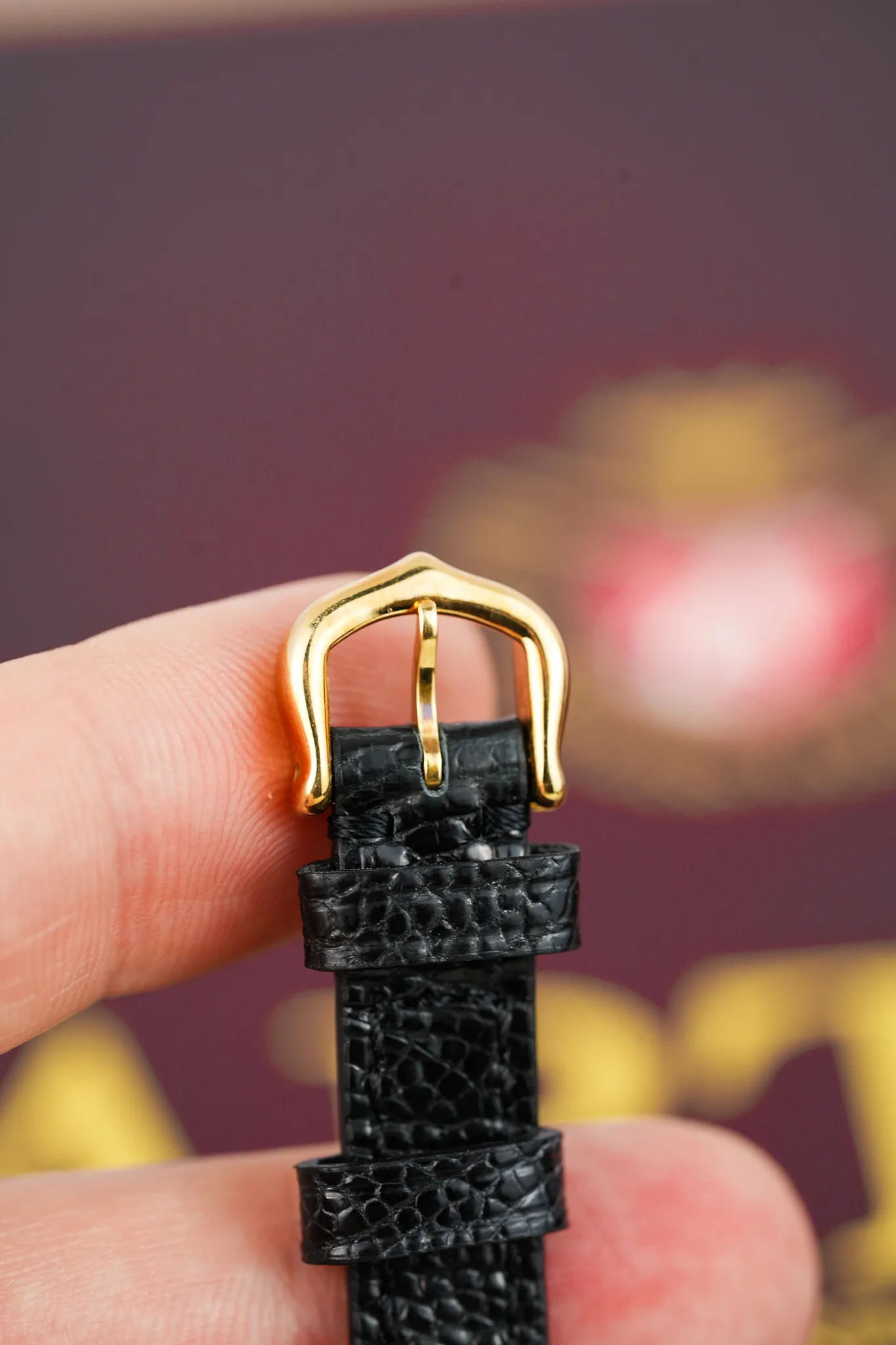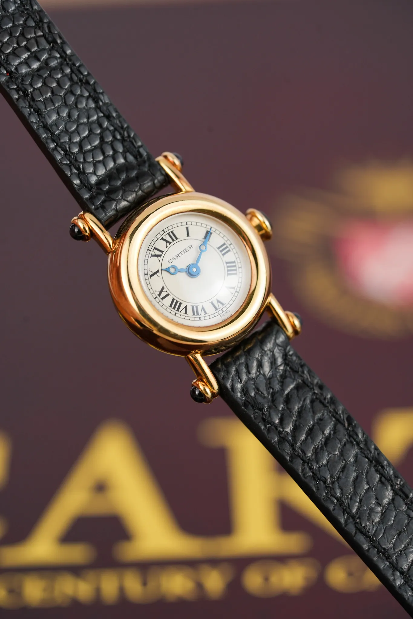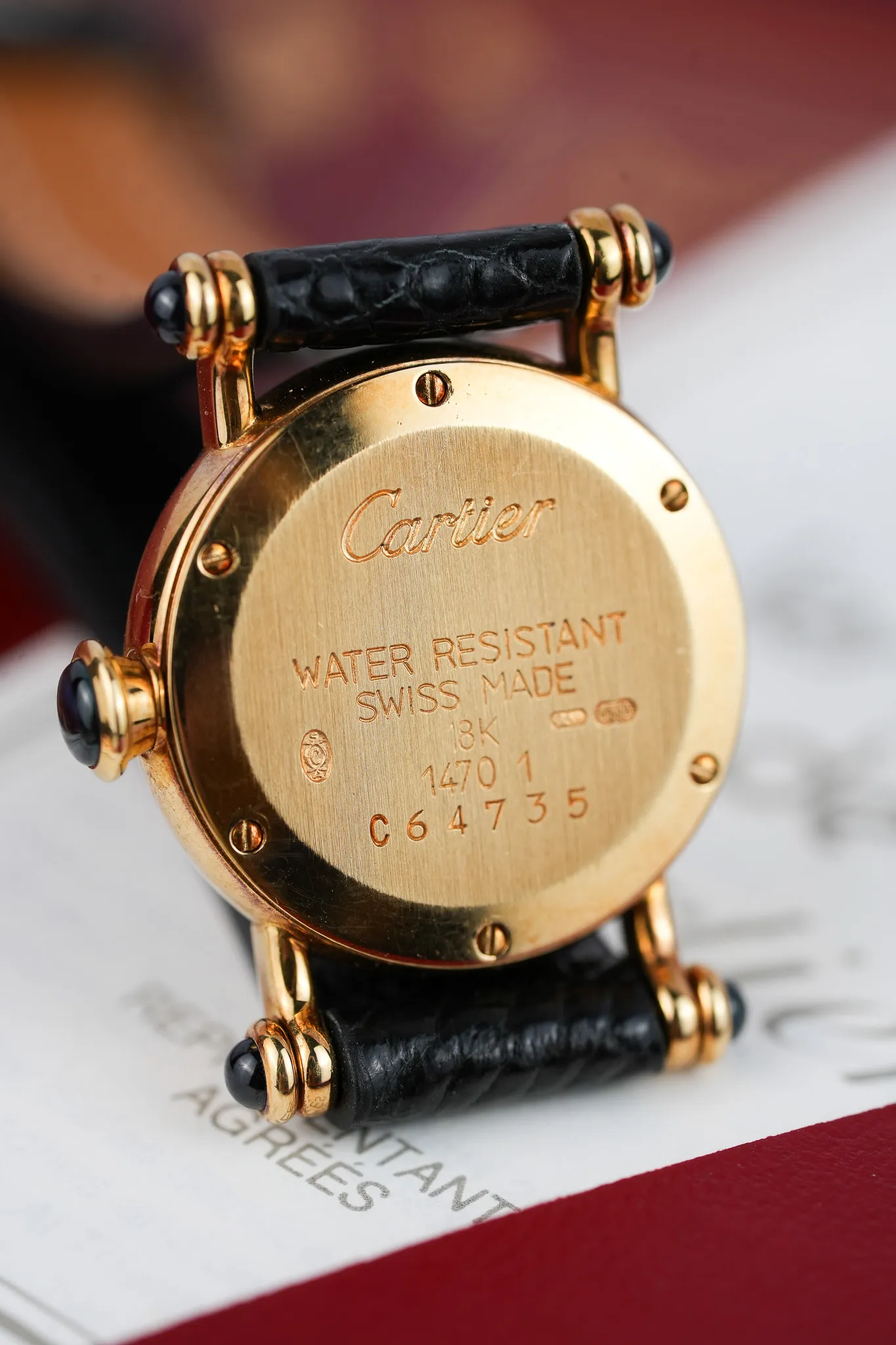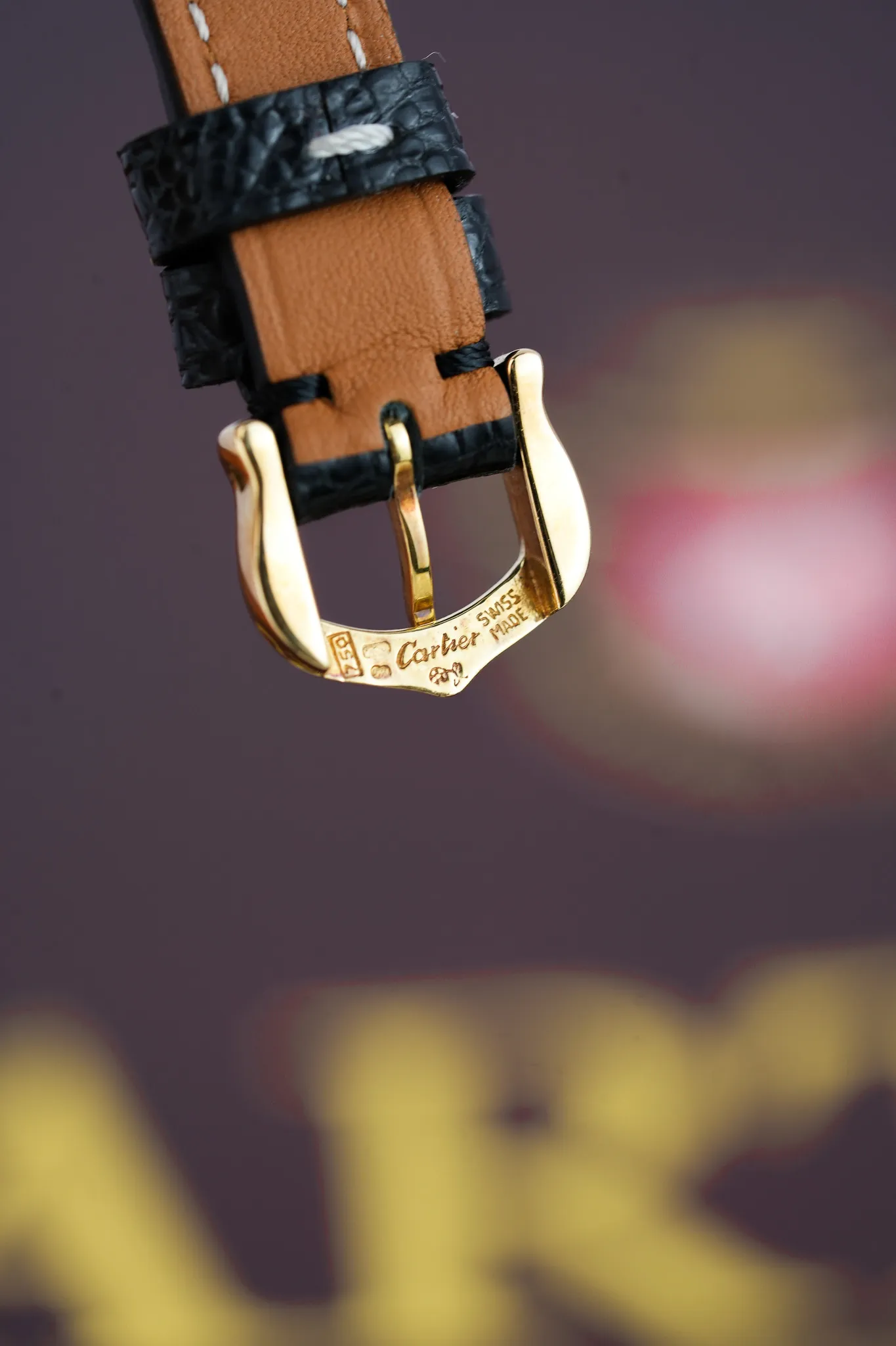 The watch comes with its original papers dated 2000. You also get a brand-new black lizard strap and the original Cartier 18K yellow gold buckle, which feels like a little victory lap.