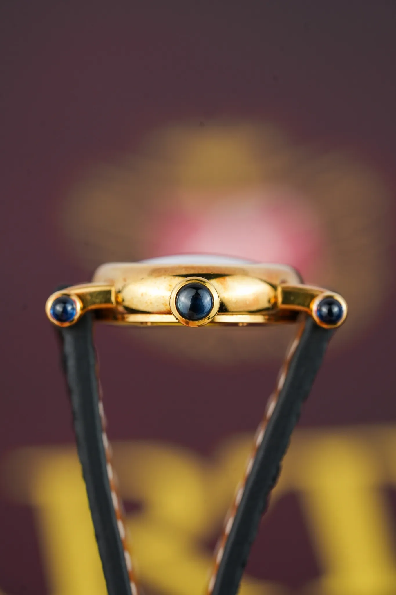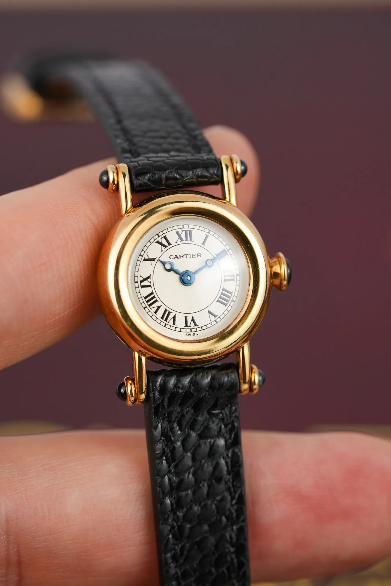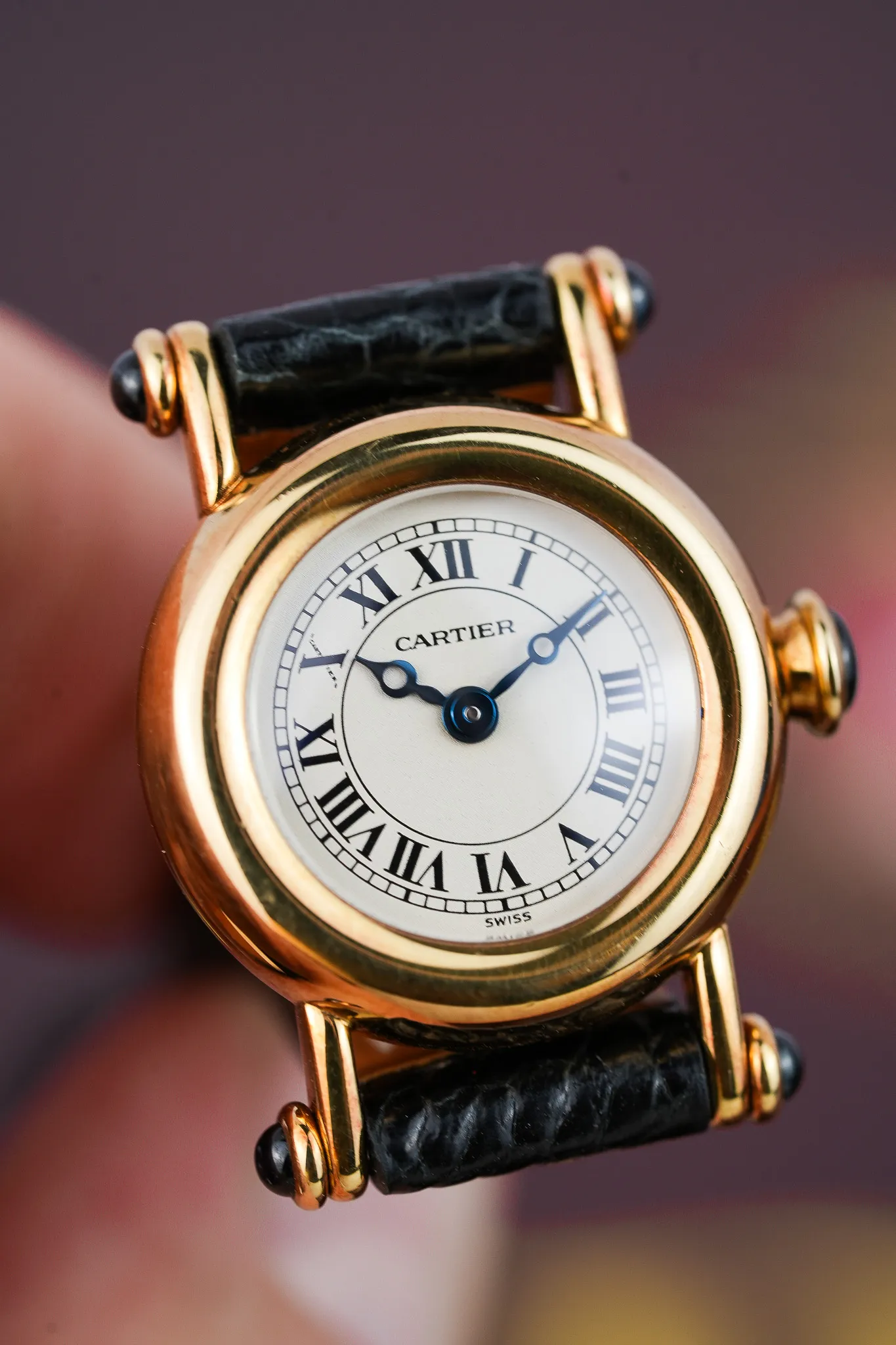 This is the mini version, a 21 millimeter burst of personality that proves tiny watches can carry the biggest attitude. Cartier even ran a 1992 ad calling it “the art of being unique.” You sense that energy right away in the round gold case anchored by four matching sapphire cabochon bullets. Cartier referred to this lug style as attache Obus, a nod to early 1900s pieces that wore the same little torpedoes. You get the same cabochon treatment on the crown because consistency matters, especially when the watch is this whimsical.
