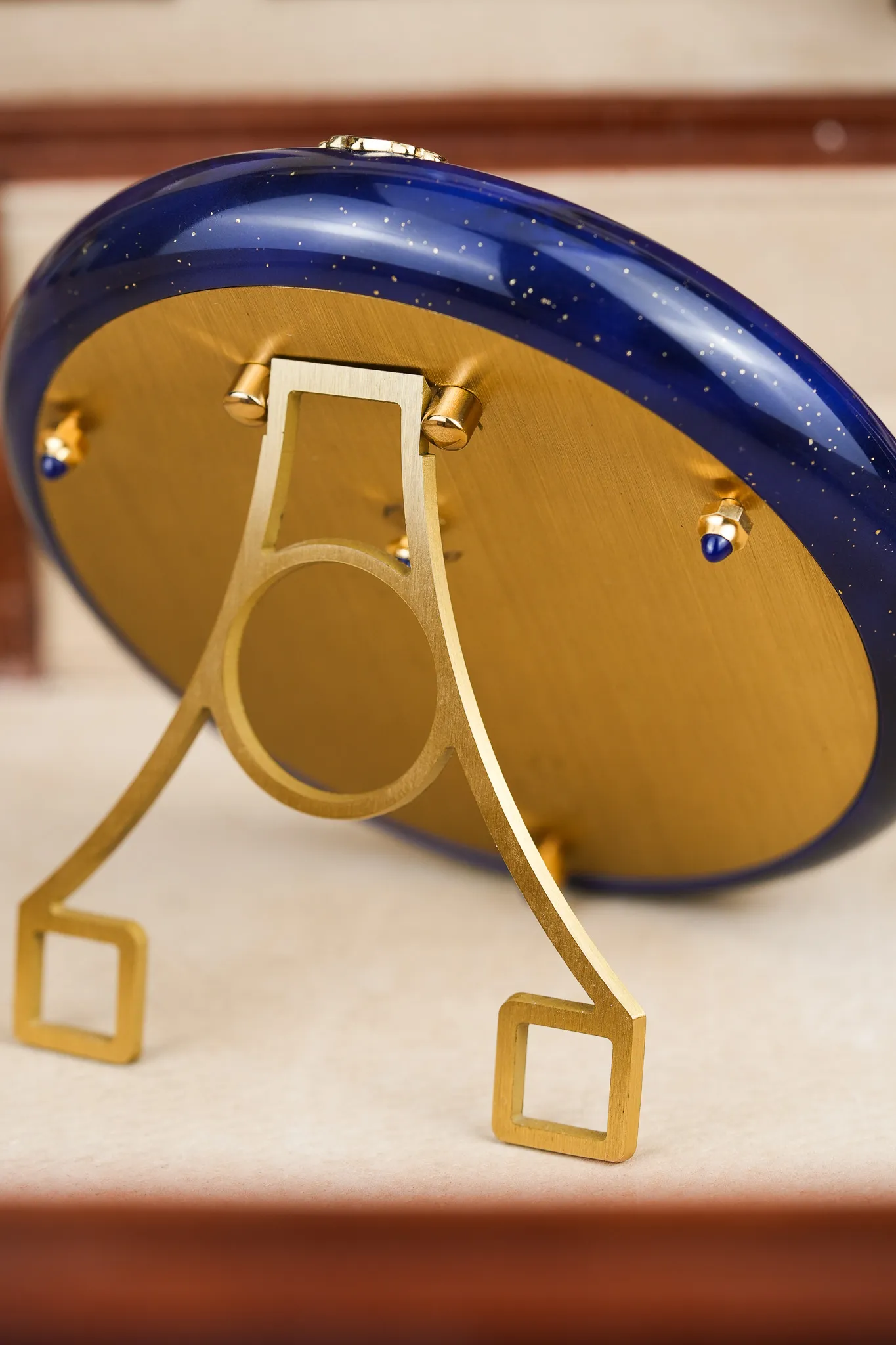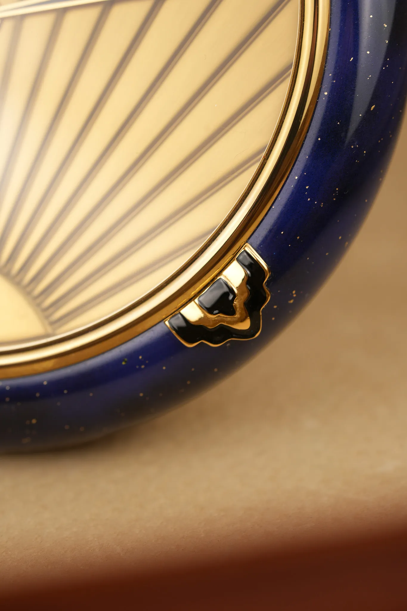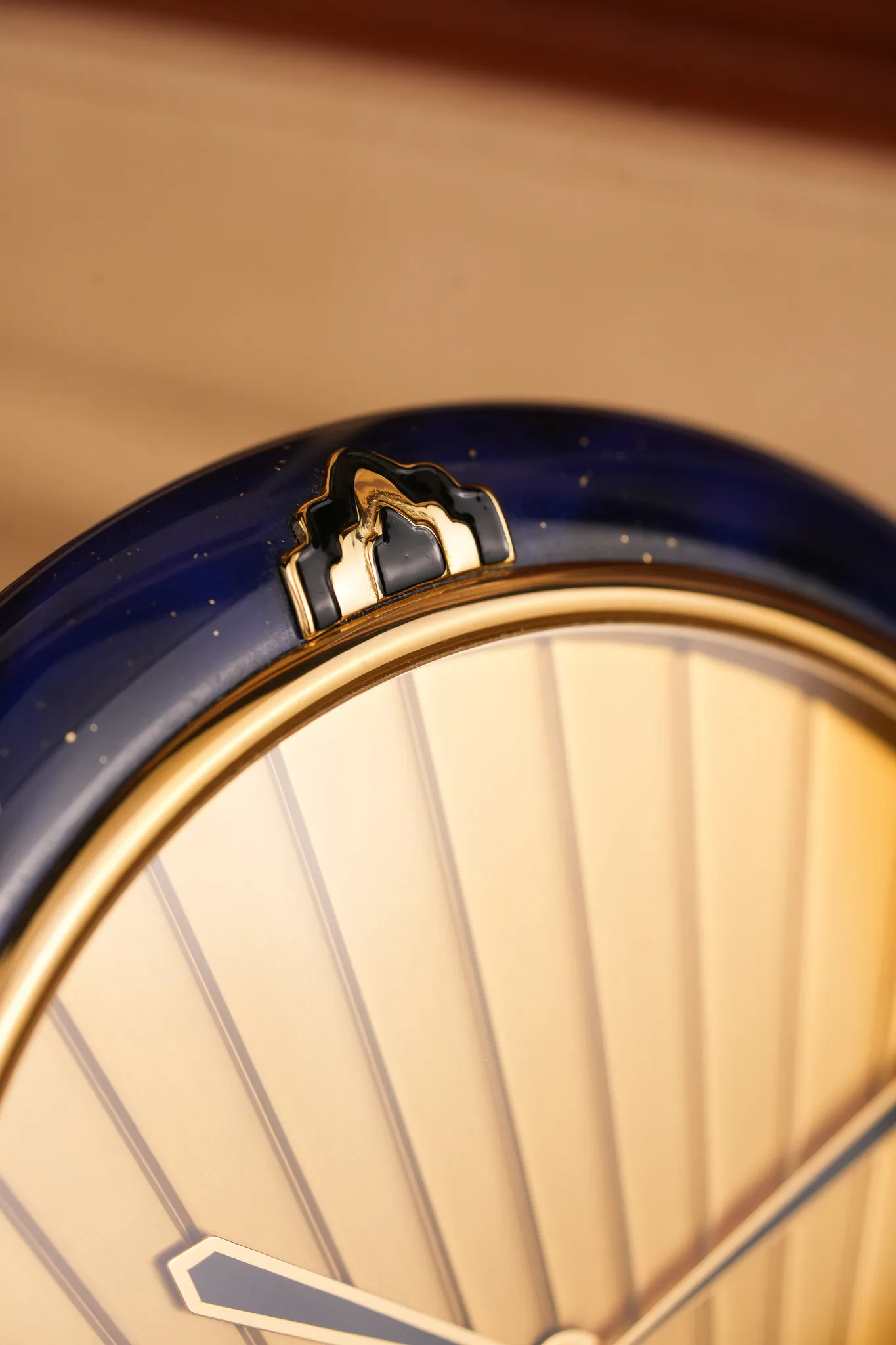 The case is round and substantial in gilt metal, framed by a deep blue enamel bezel designed in the spirit of lapis lazuli. Under light, the blue shifts in tone, revealing tiny gold flecks that mimic natural pyrite. It feels like looking into a night sky just before midnight. Rich. Layered. A little dramatic.