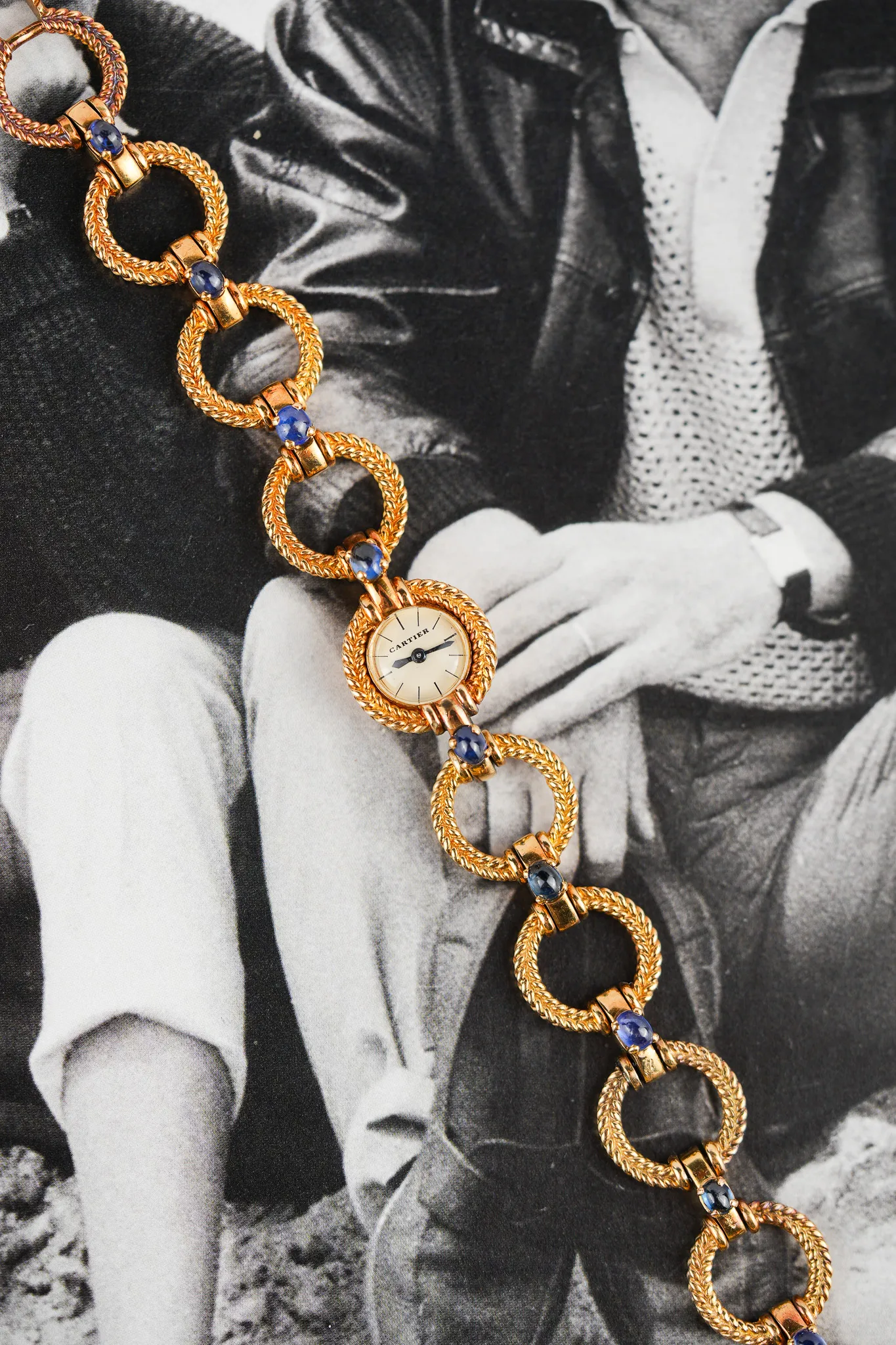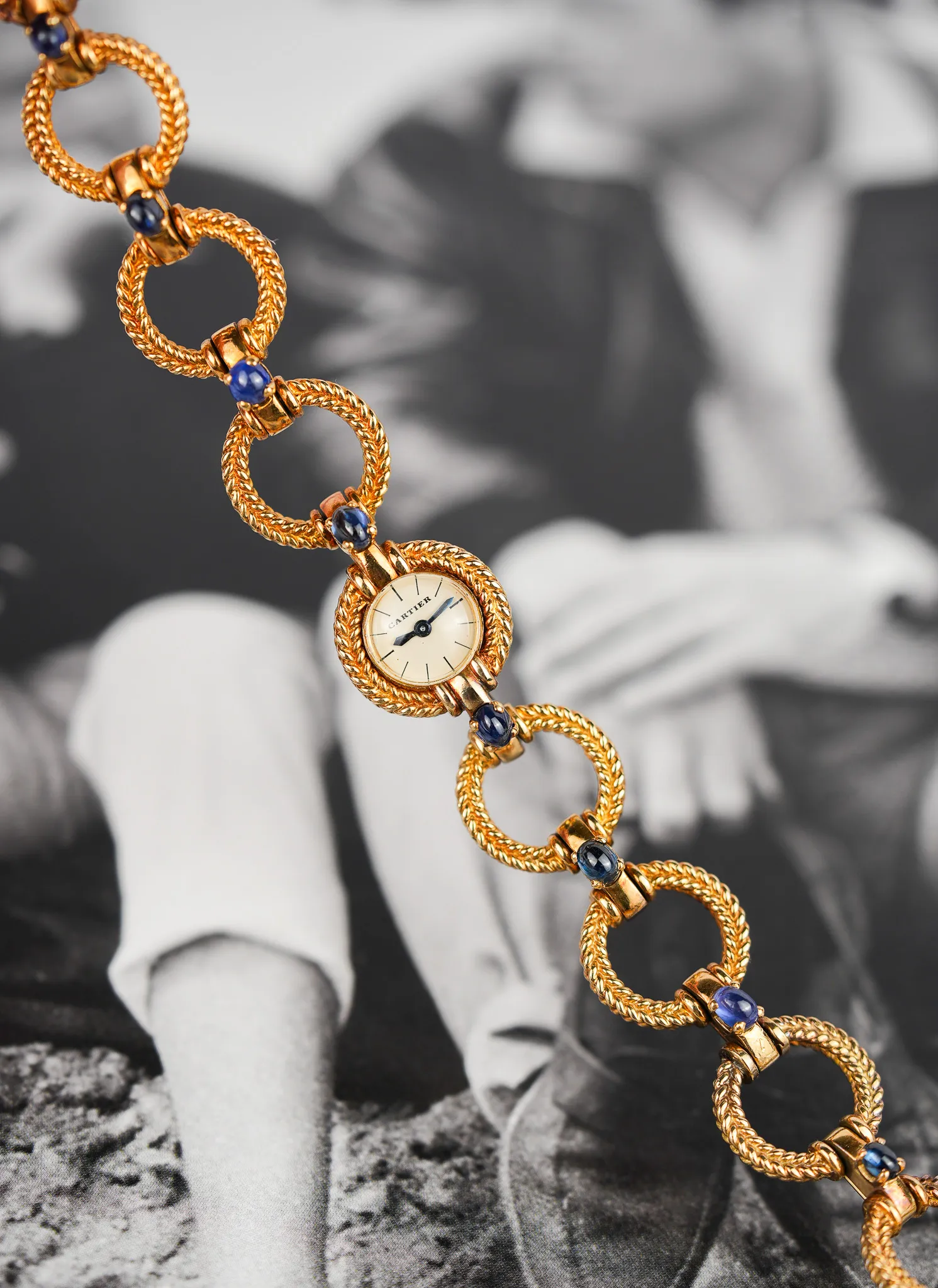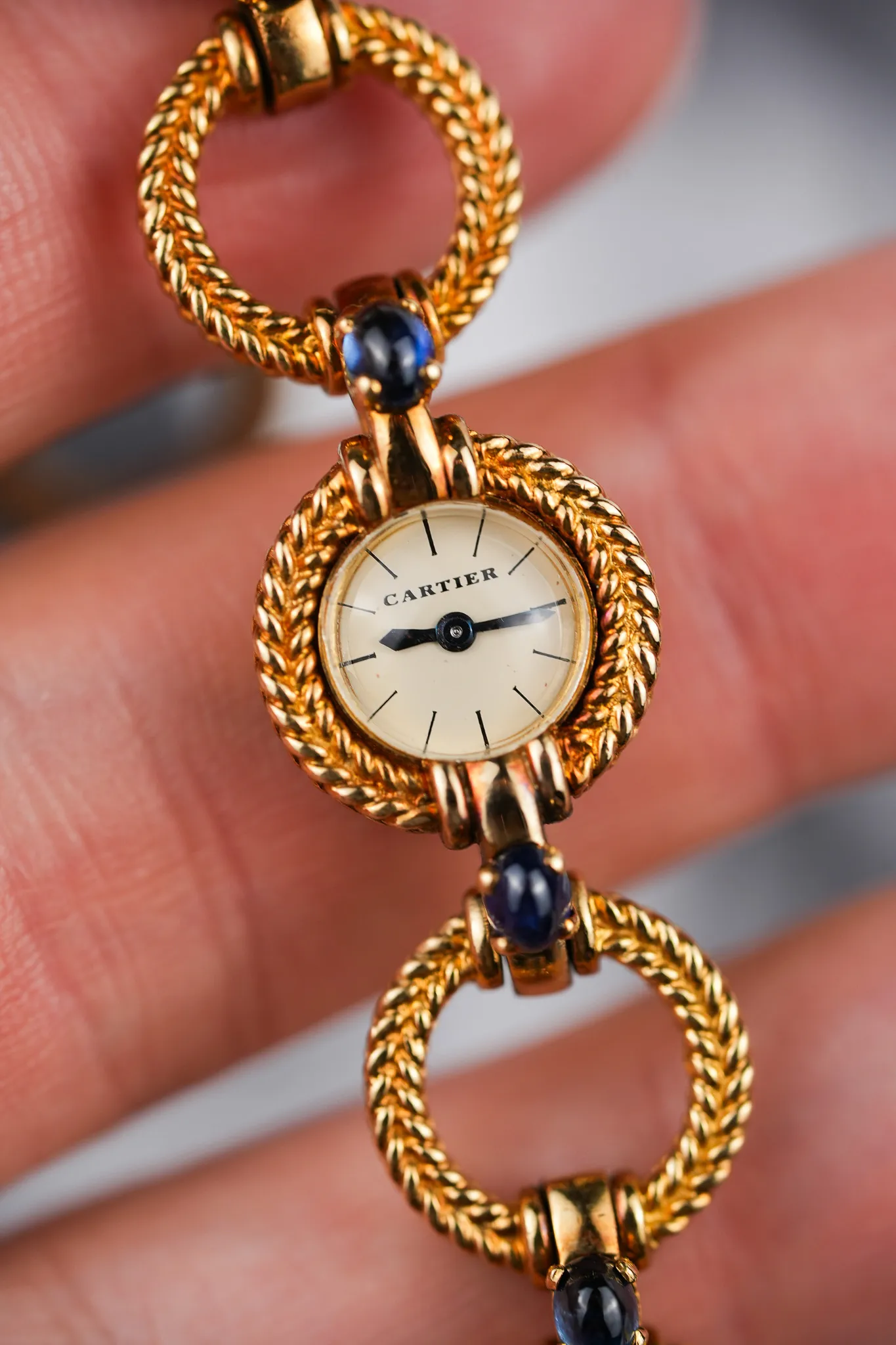 Crafted entirely in 18k yellow gold, this elegant timepiece plays with form and function: alternating twisted gold circles and contrasting polished bridges create a visual rhythm across the wrist. Each joint is punctuated by cabochon sapphires, a signature Cartier flourish typically reserved for crowns—here multiplied in gem-like repetition across the bracelet. It’s a jewel that happens to tell time.