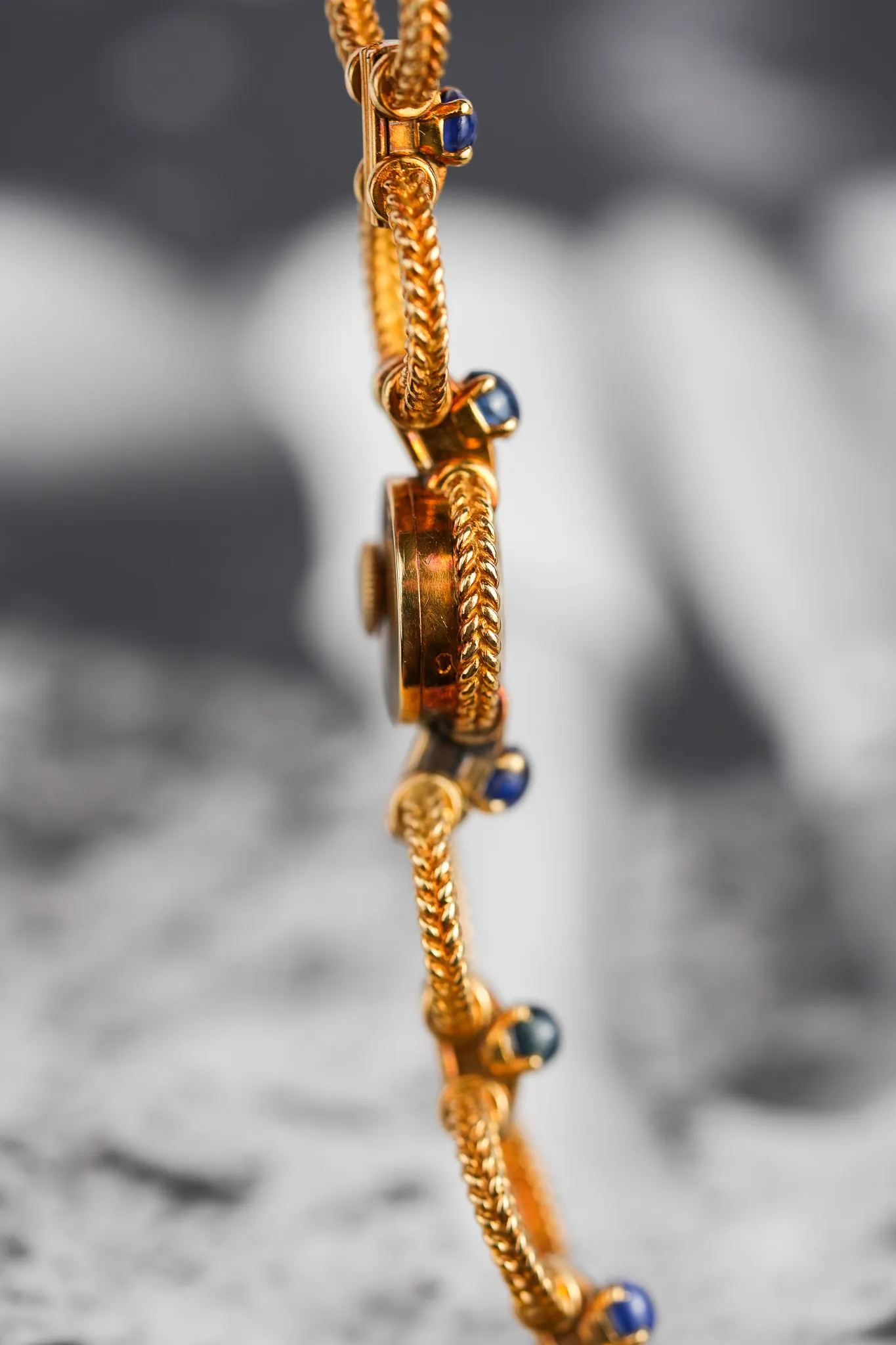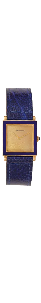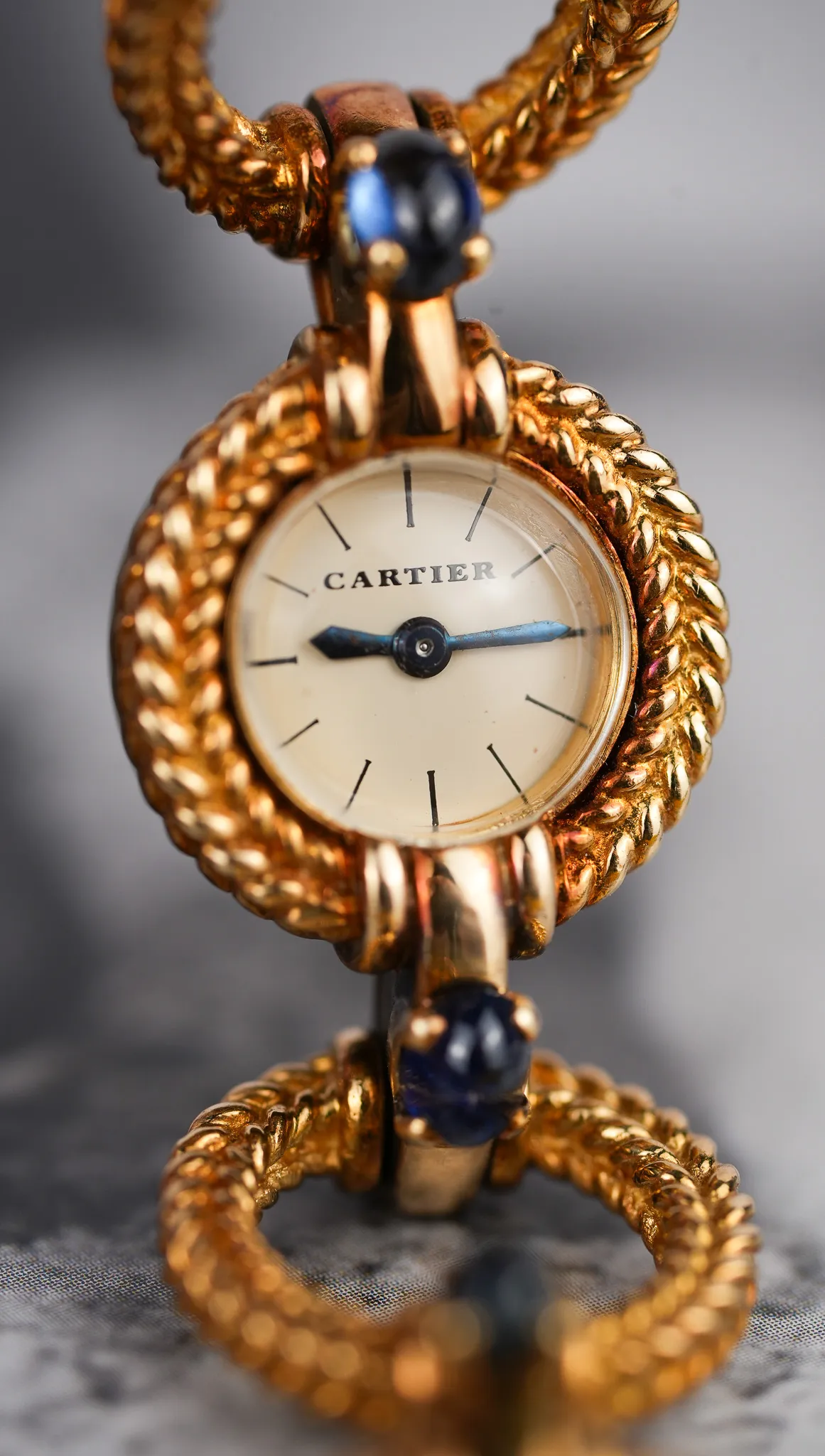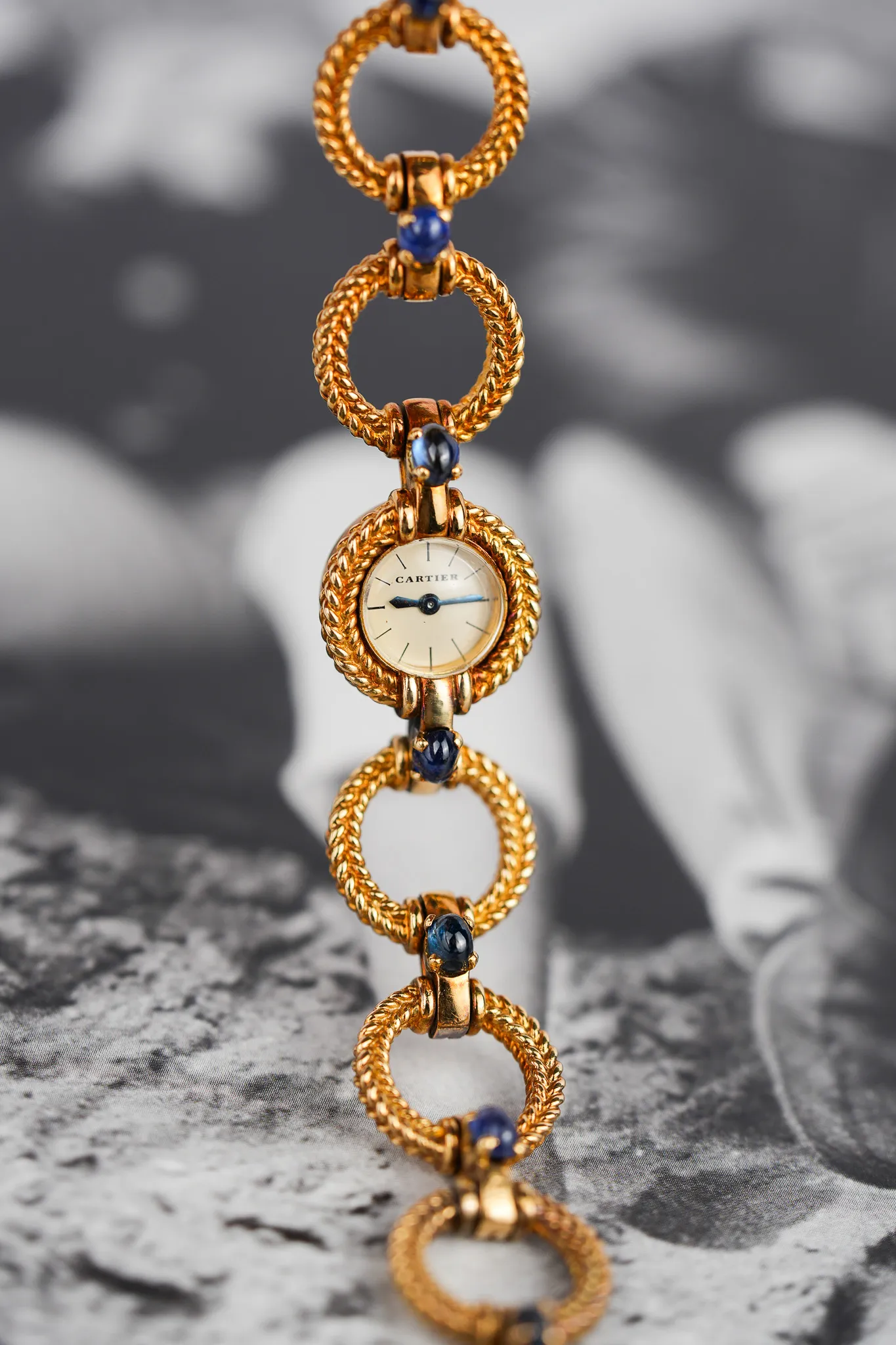 Crafted entirely in 18k yellow gold, this elegant timepiece plays with form and function: alternating twisted gold circles and contrasting polished bridges create a visual rhythm across the wrist. Each joint is punctuated by cabochon sapphires, a signature Cartier flourish typically reserved for crowns—here multiplied in gem-like repetition across the bracelet. It’s a jewel that happens to tell time.