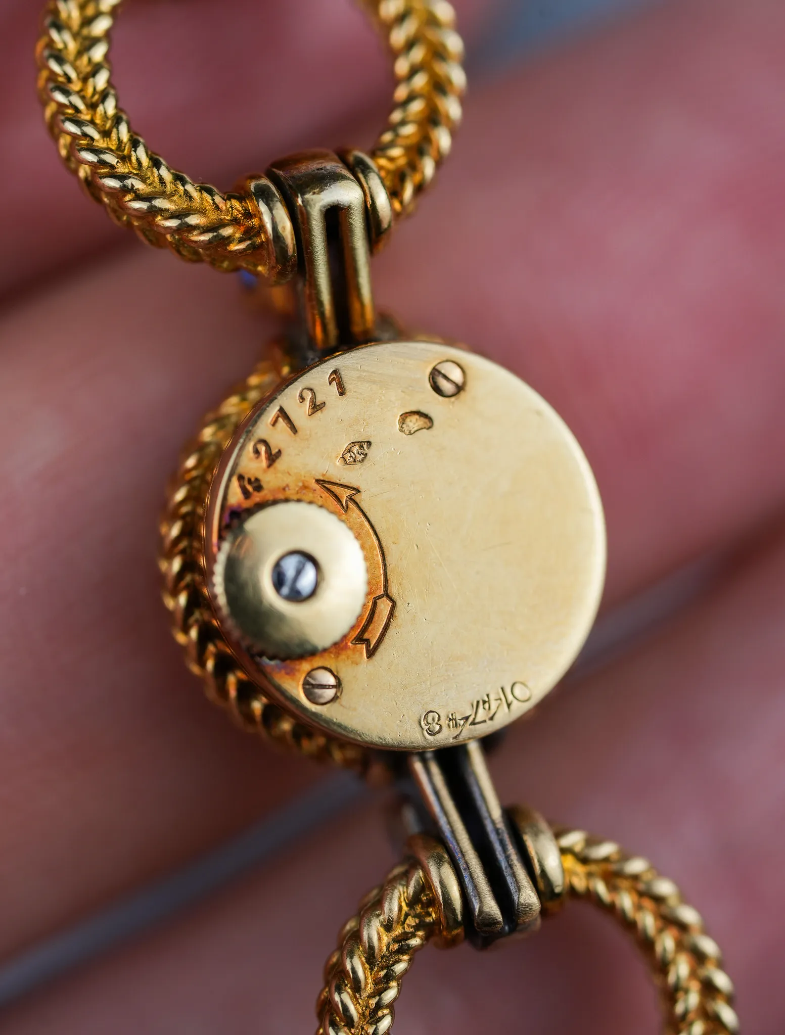Powering this elegant construction is a back-winding movement made by Edmond Jaeger—note the EJ hallmark flanked by the hourglass emblem and French eagle head denoting purity and origin. The movement is signed, numbered, and tucked cleanly into the case for a silhouette uninterrupted by a crown. A hand-engraved Cartier inventory number rests quietly opposite the Jaeger serial, further affirming its bespoke nature.