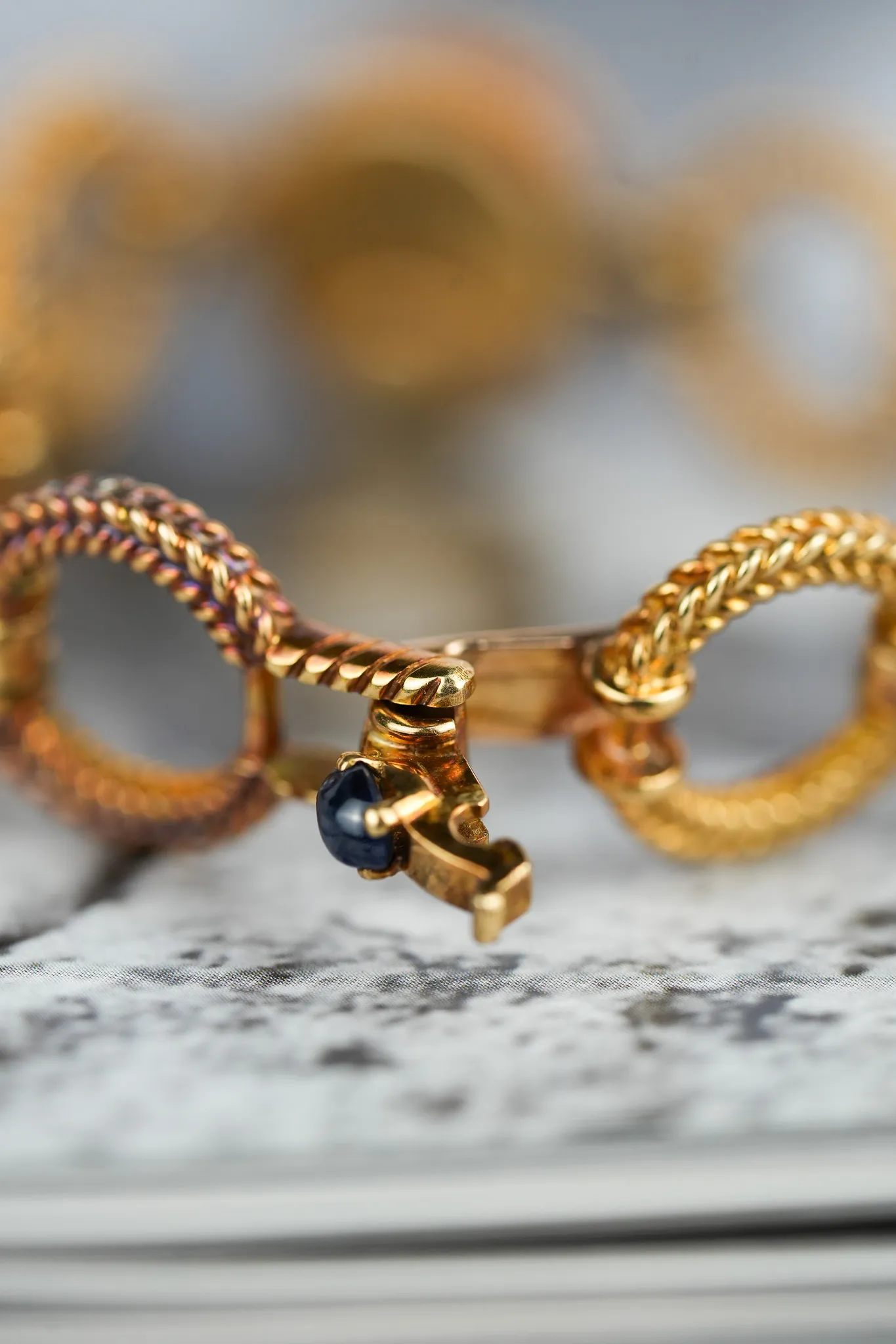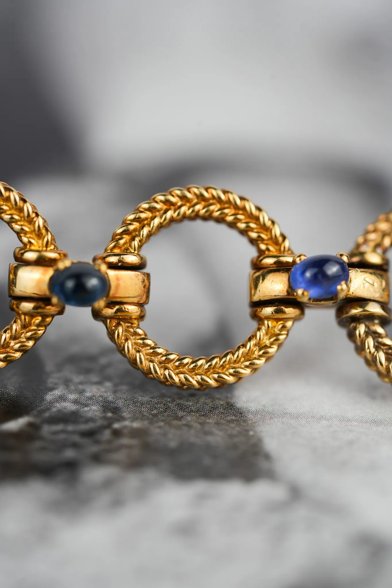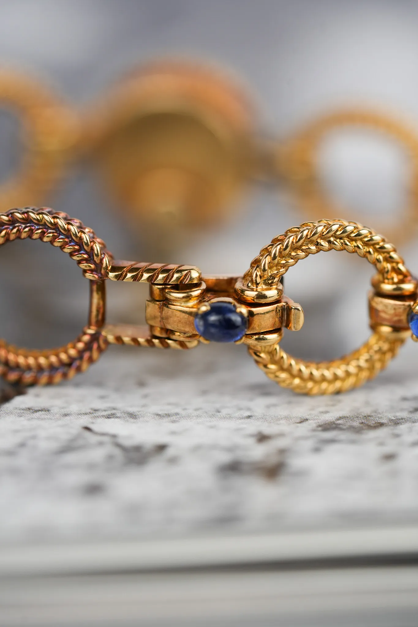 The 18K yellow gold bracelet retains its intricate rope-textured links with only light signs of age.