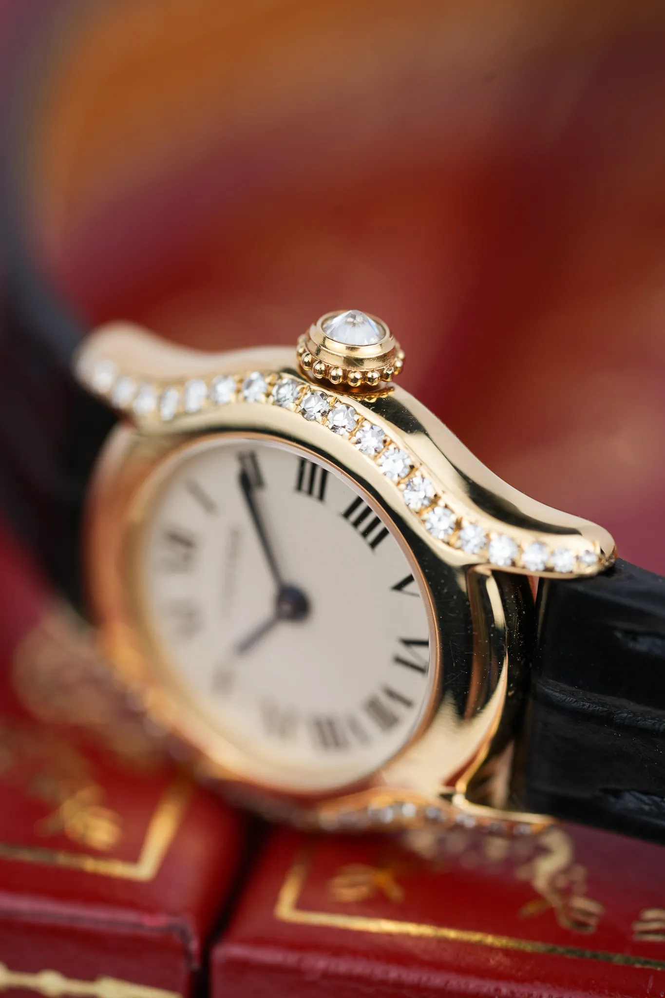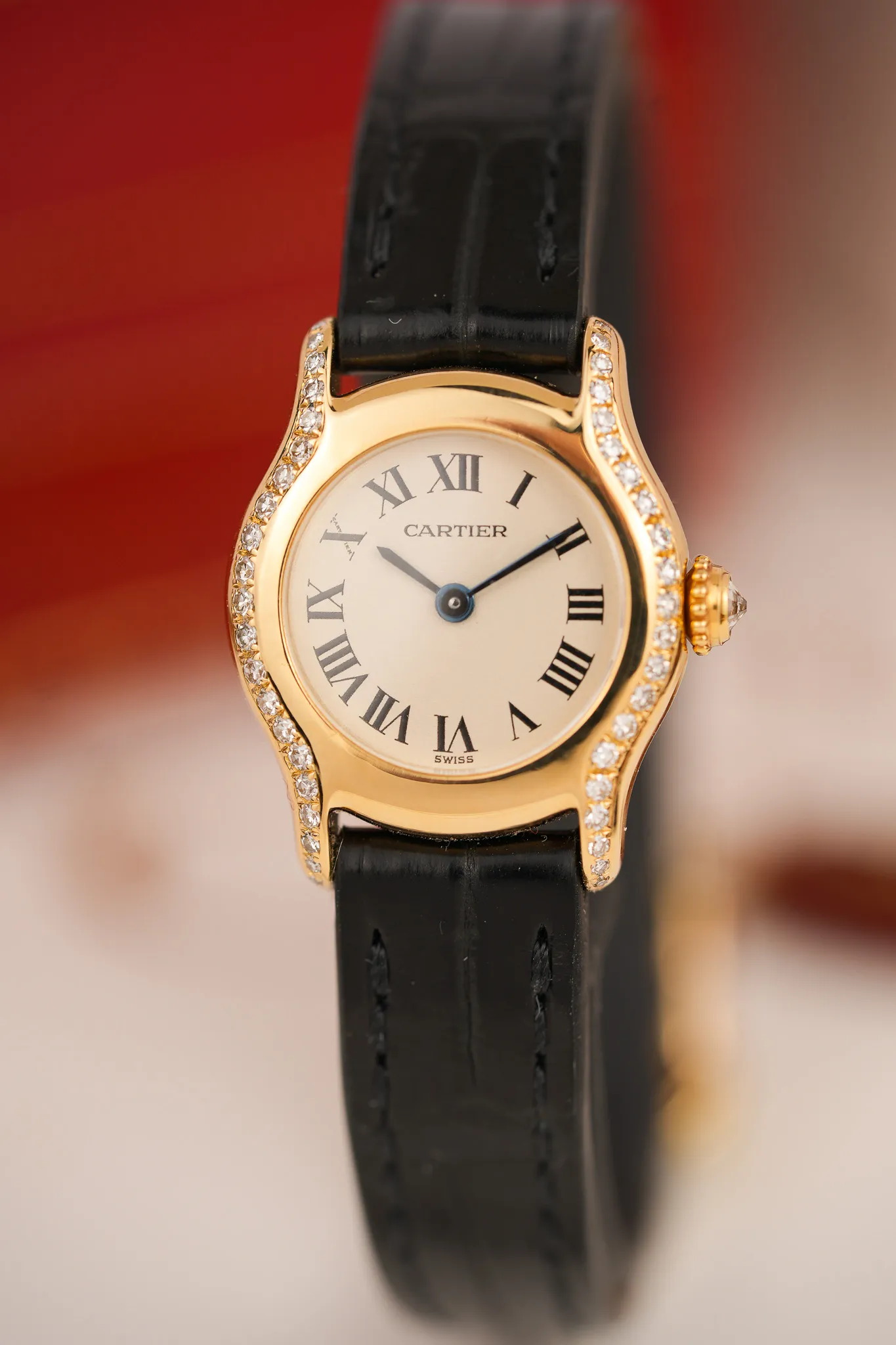 The Cartier Victoria Mini measures just 20mm across, yet it carries itself with the kind of presence that makes you look twice. In 18k yellow gold, with factory-set diamonds tracing the curves of its bezel and flowing into the lugs, it feels like a jewel that happens to tell the time. Cartier gave it a matching diamond-set crown for good measure, because at this scale, every detail counts.
