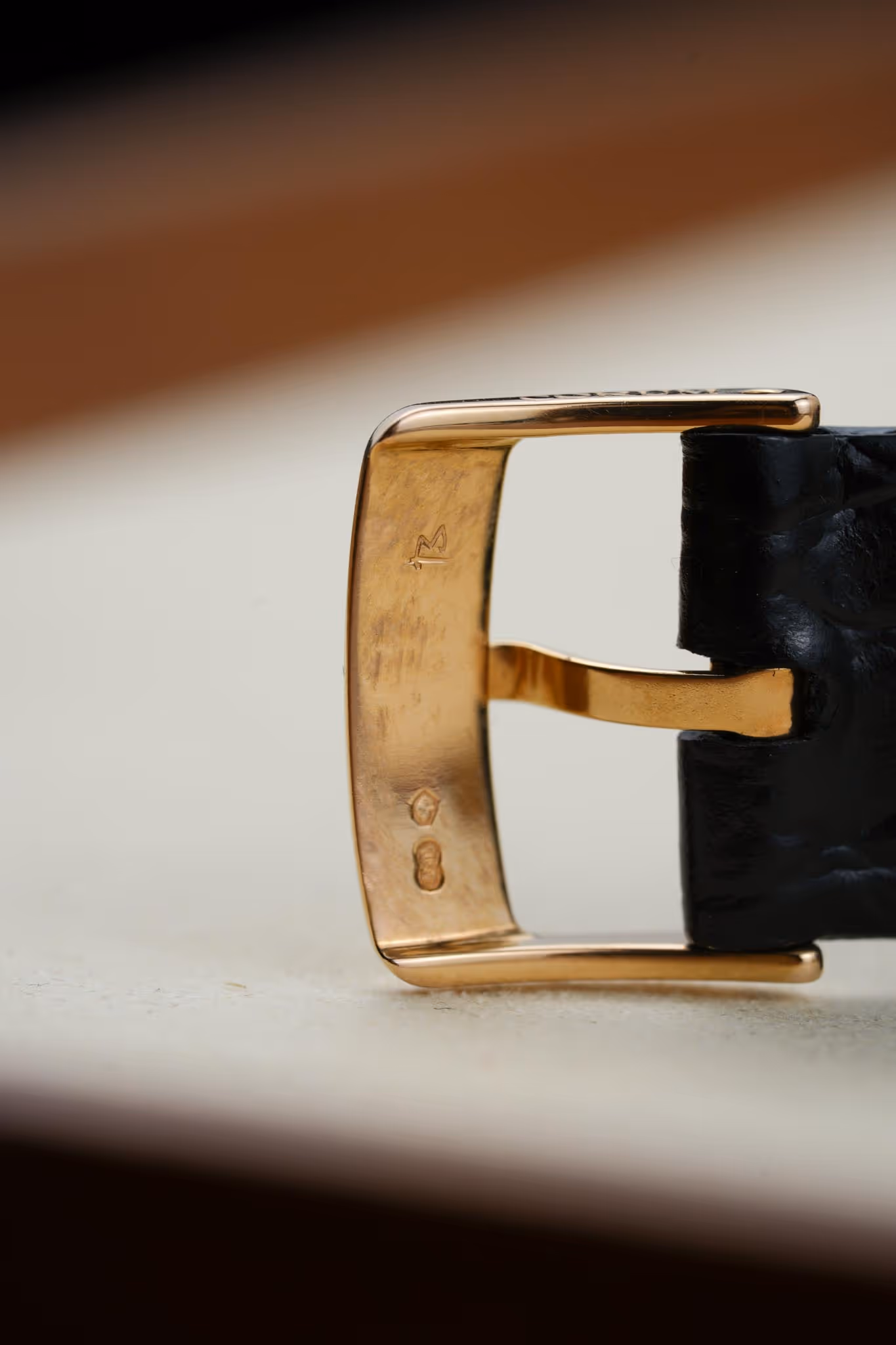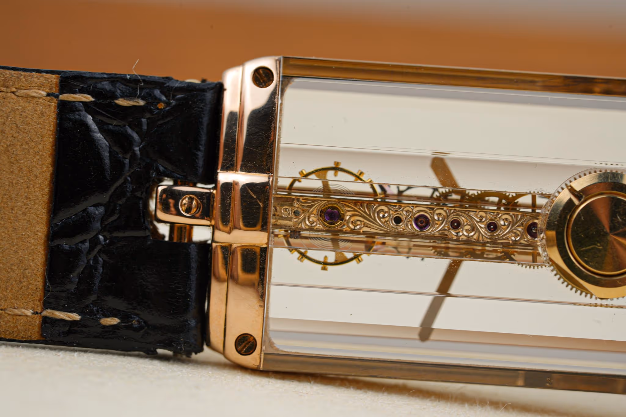 Originally launched in 1980, the Golden Bridge broke away from traditional watch designs by putting the focus squarely on the movement—a skeletonized spectacle fully visible from both the front and back. Inside, the manual-winding caliber CO 113 is the star of the show. This is no ordinary movement—it's a true feat of horological engineering. The vertical layout, with the balance wheel, gears, and mainspring all aligned on this narrow "bridge", is not only aesthetically remarkable but also an incredible technical achievement. This caliber is hand wound by a clever latch-based winder located on the back, keeping the design sleek and uninterrupted.