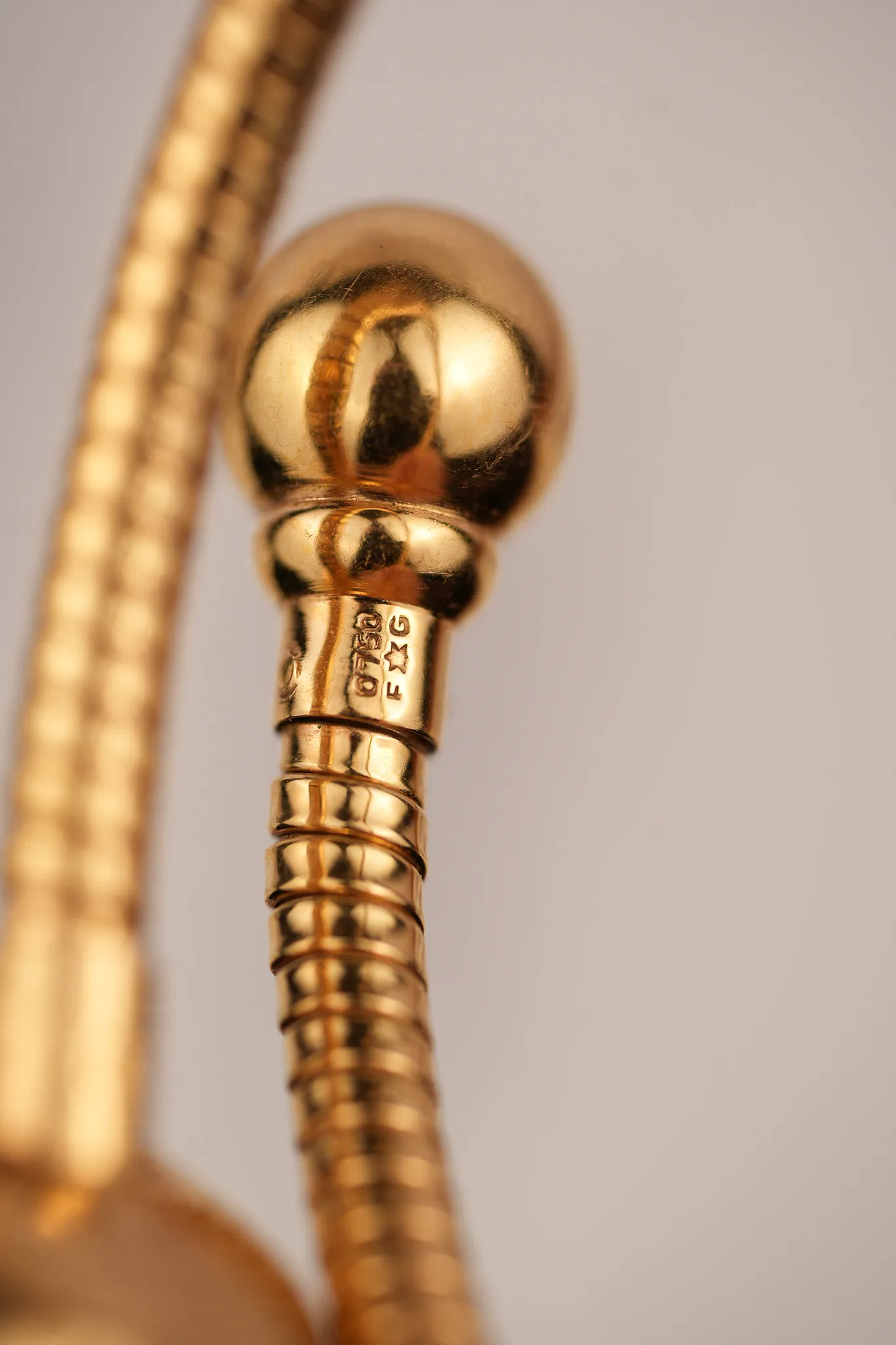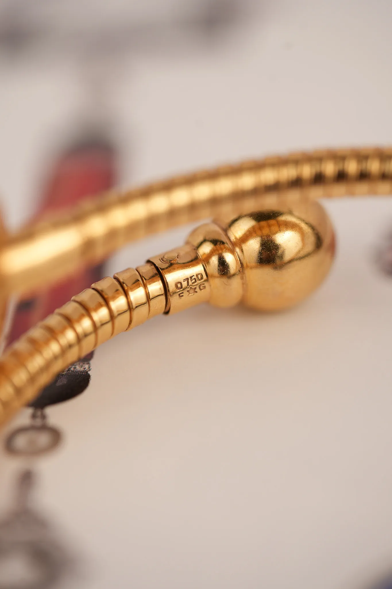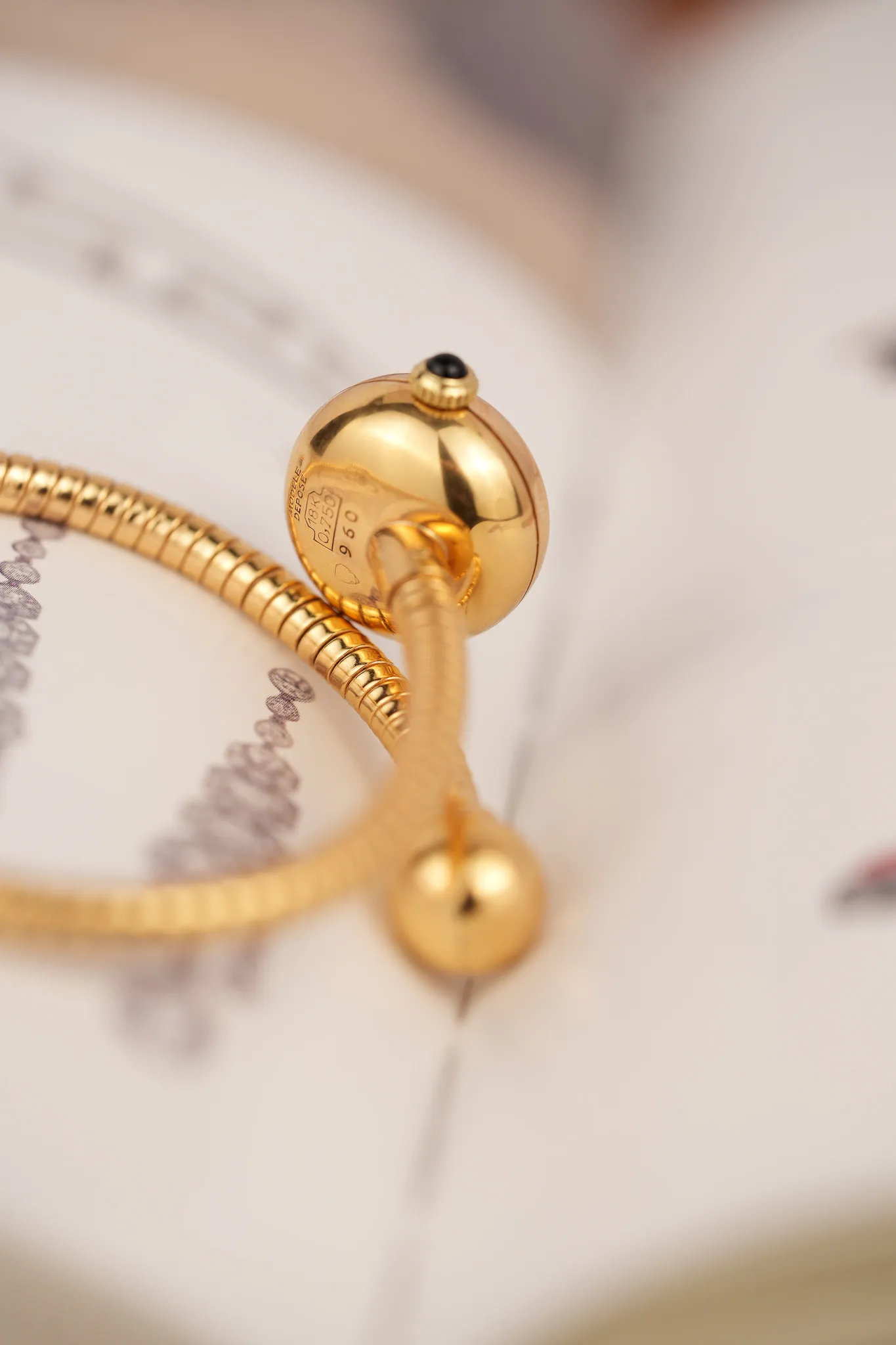 This Tubogas bracelet watch behaves like it was designed for real life. You do not fasten it. You do not adjust it. You simply slide it on, feel the gold give slightly, and let it settle where it wants to sit. The ribbed tubogas construction, borrowed from industrial gas piping, gives the bracelet its elasticity. It stretches, coils around the wrist, then returns to form with a quiet snap that feels oddly satisfying.