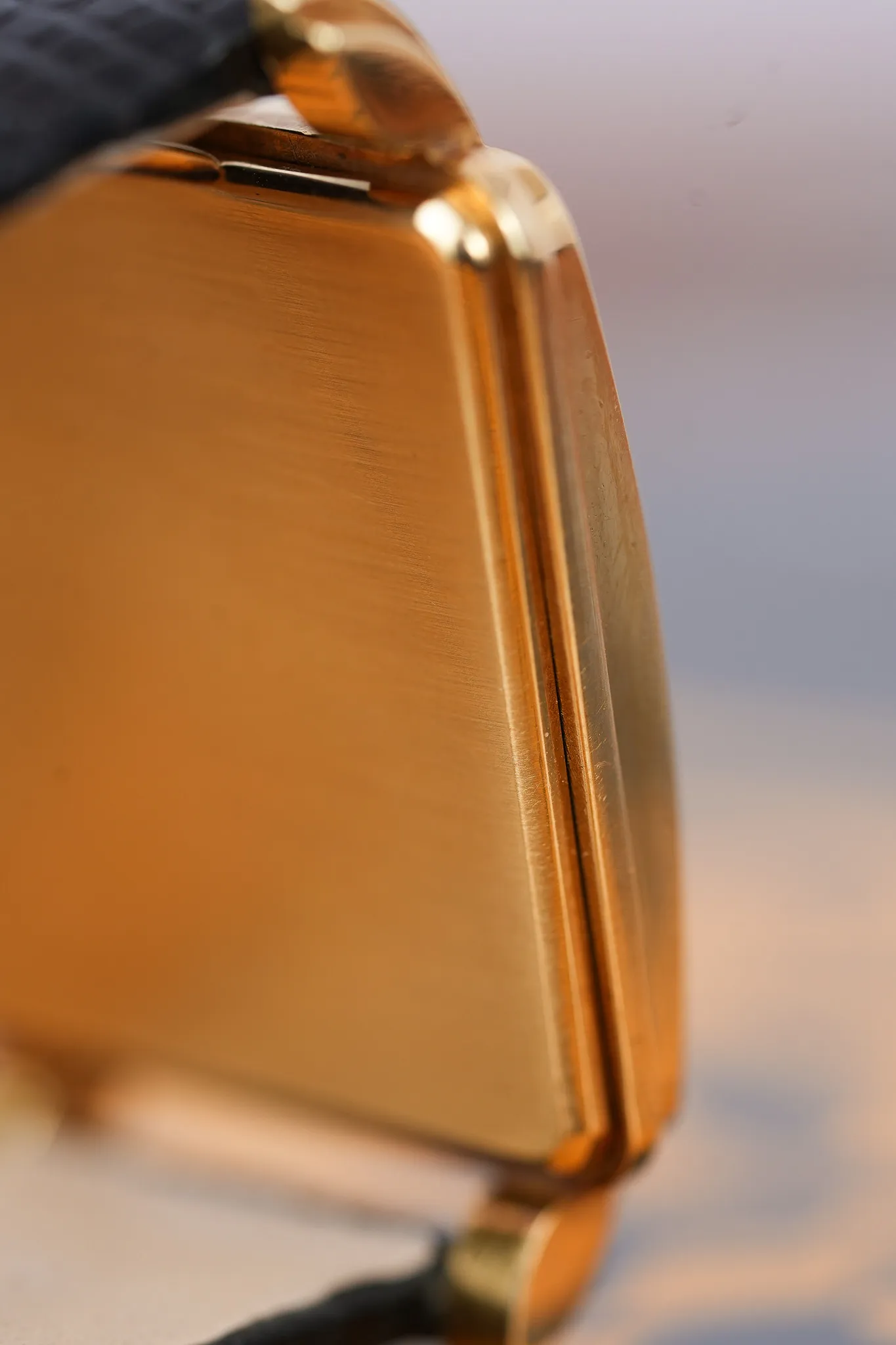 At 30 by 30 millimeters, this was a large watch for its era and still reads remarkably modern today. The proportions feel deliberate rather than loud, helped by a case that does more than hold a dial. The stepped bezel moves inward like a series of careful cuts, framing the watch face the way a chocolatier frames a bar before breaking it. The lugs curve outward with a soft architectural rhythm, then step down again, giving the entire case a sense of motion even at rest. Turn it slightly and the profile comes alive. The dramatic curved acrylic crystal swells above the dial, catching light along its edge in a way flat sapphire never could.