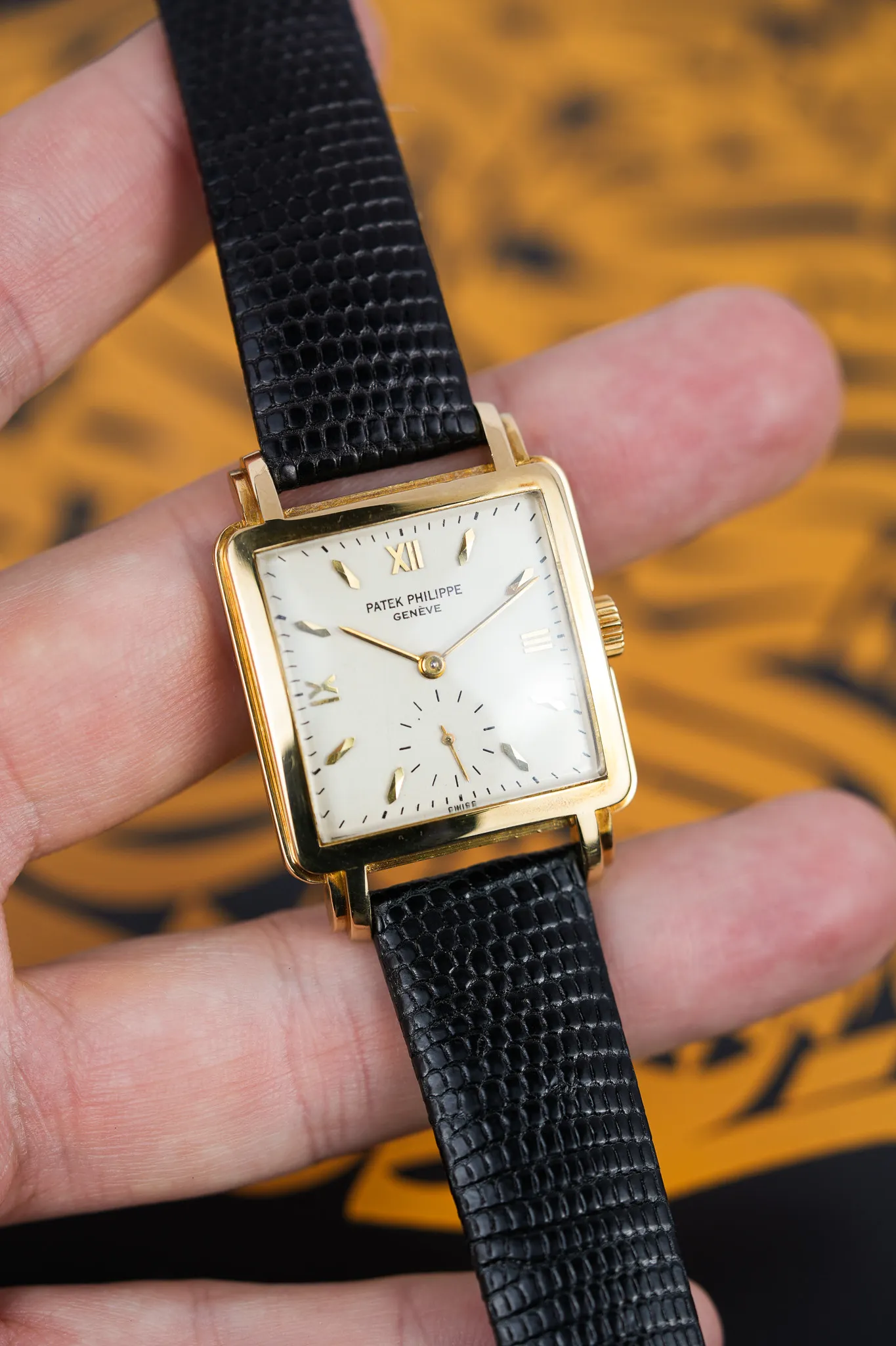 The dial rewards patience. Raised enamel printing anchors the surface with a clarity that has aged gracefully, preserving contrast and texture in a way only this technique can. The indices are the real indulgence. Faceted, beveled, and sharply cut, they behave like miniature prisms. Light doesn’t simply reflect off them, it breaks, shifts, and moves as the wrist turns. At the cardinal points, Roman numerals step in to disrupt the rhythm. They add structure, a visual pause, a reminder that Patek was perfectly comfortable mixing languages when the result felt right.