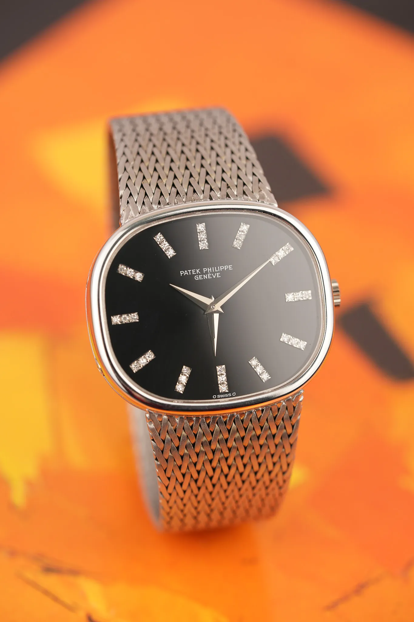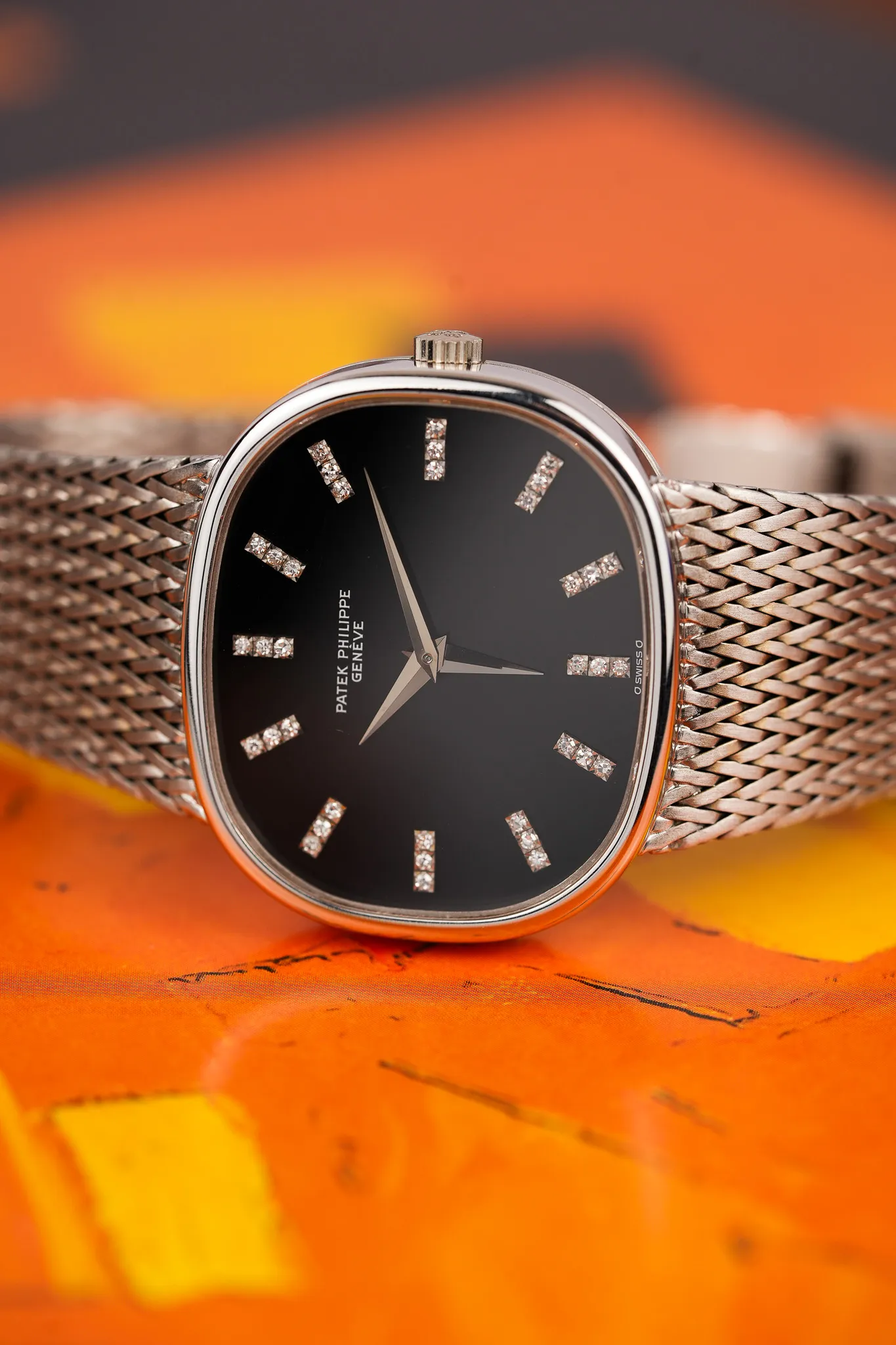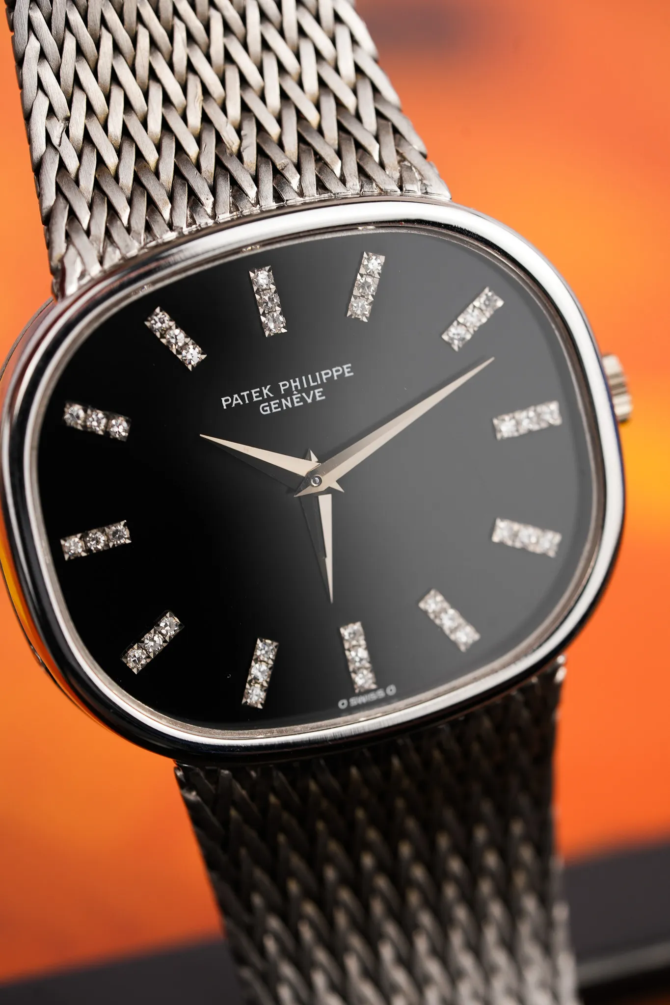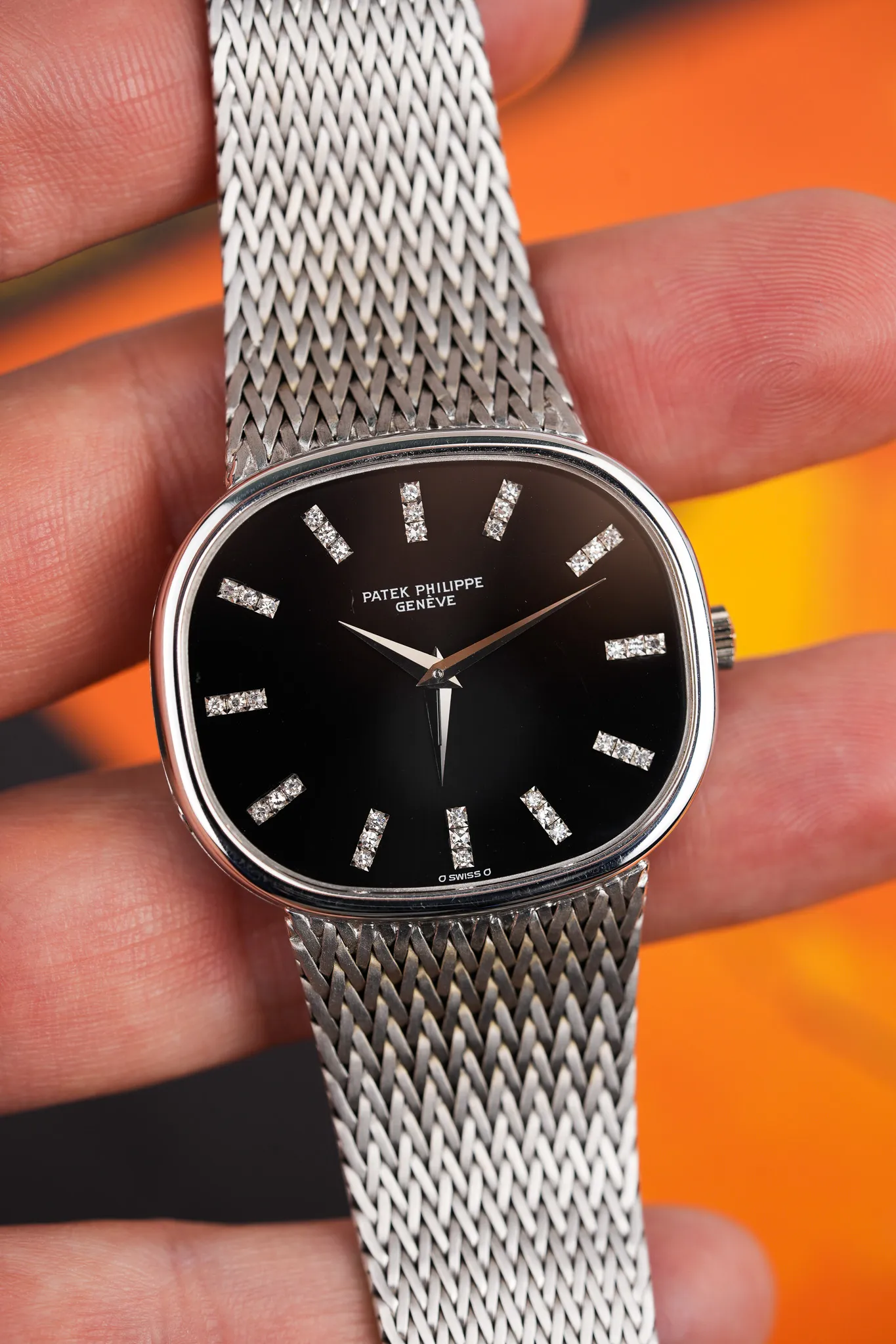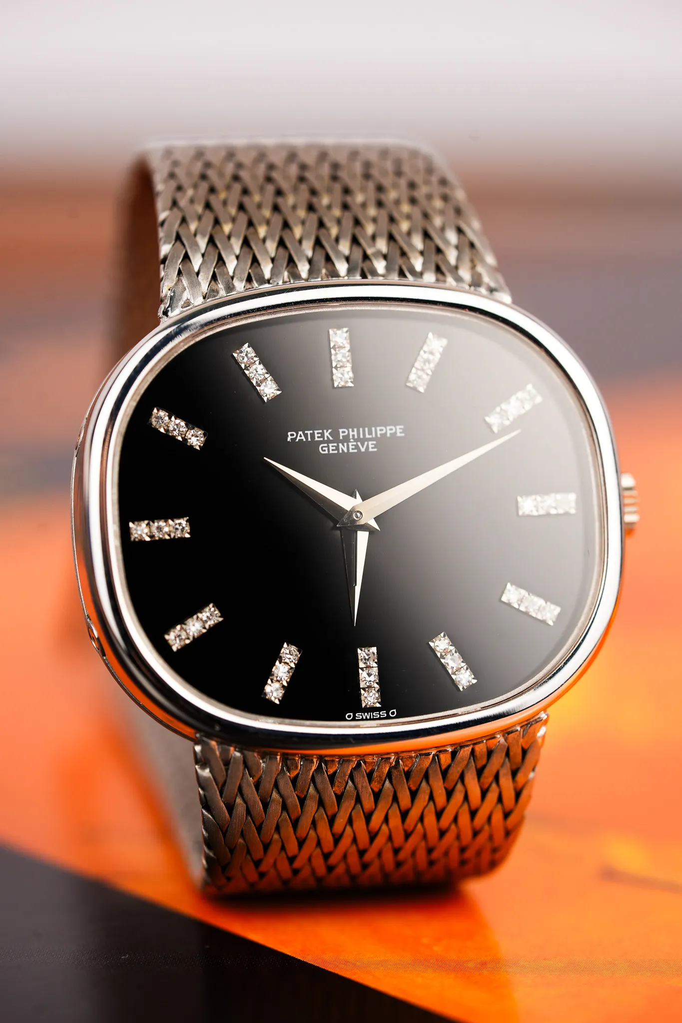 The black oxidized dial, produced by Stern Frères in collaboration with Singer, features twelve diamond markers, with triple stones marking each hour—a configuration known in only three examples of the 3619-1G. Beneath it beats the calibre 27 HS 400, a Cottier-improved movement proudly bearing a Geneva Seal. The white gold cushion-shaped case, crafted by Ateliers Reunis, measures a generous 38mm and carries an integrated chevron-pattern bracelet that feels as architectural as it is elegant.