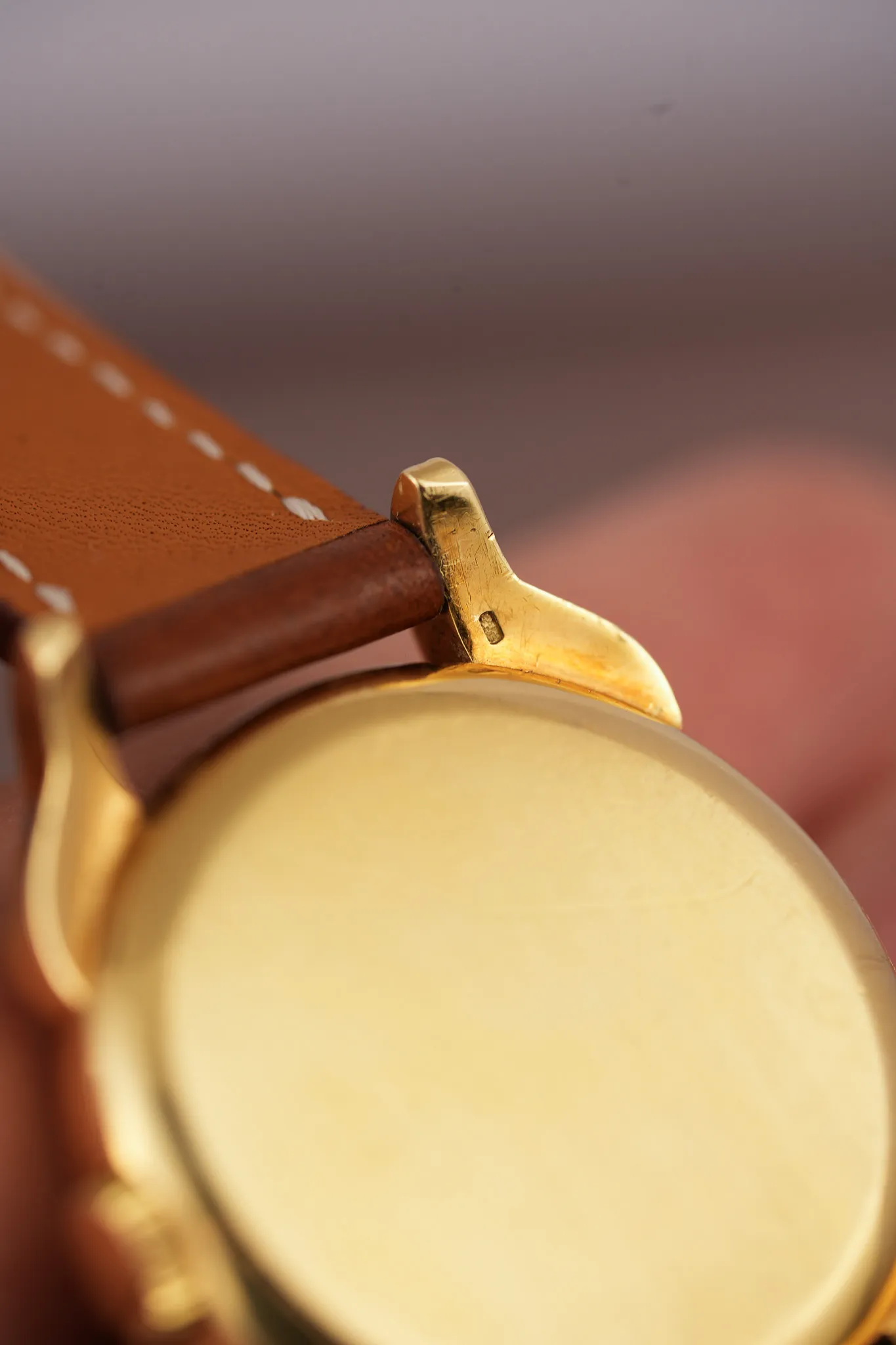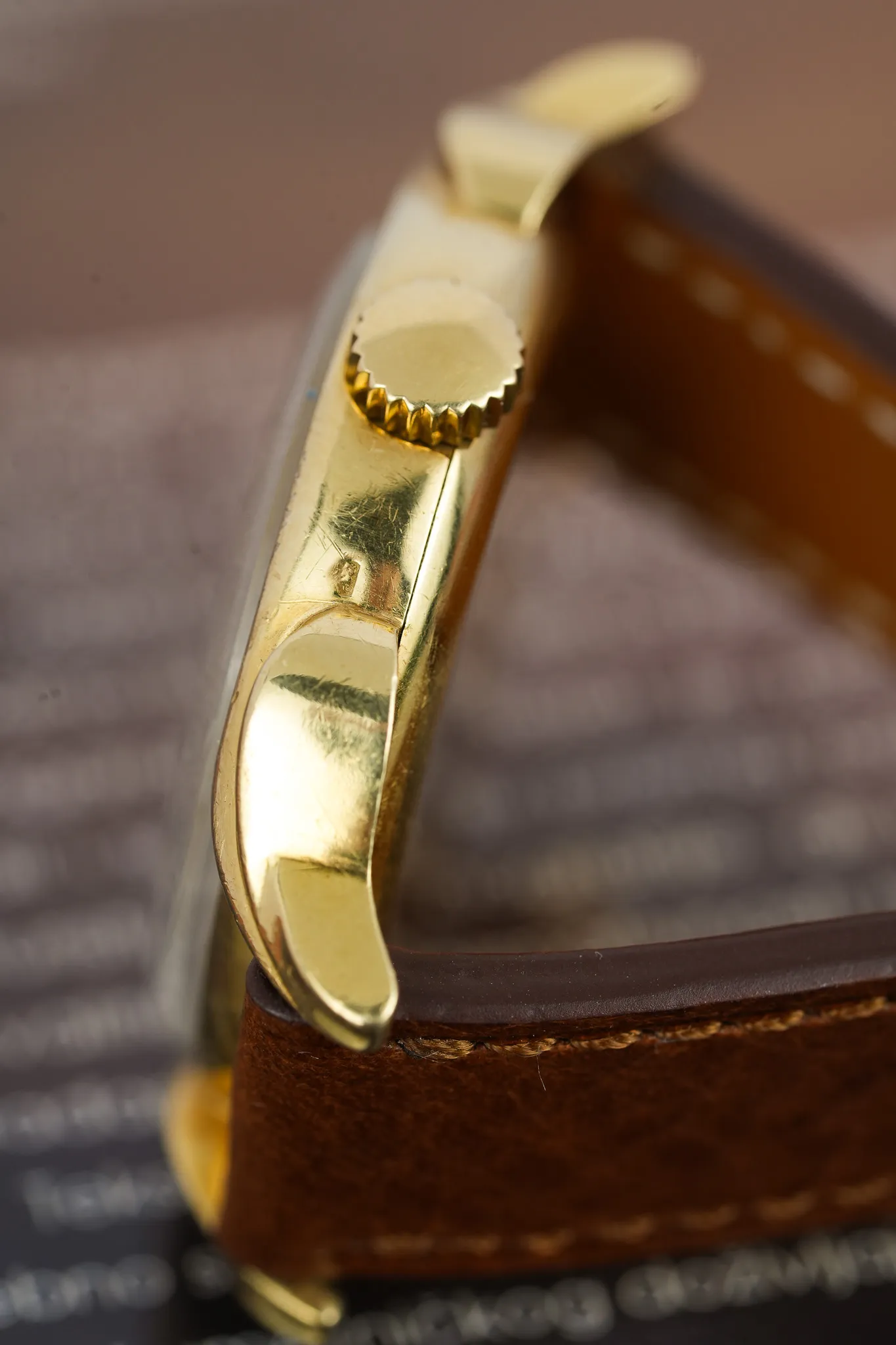 The 18k yellow gold case remains full with visible definition to the flame lugs and deep double hallmarks on the crown side and beneath the lug.