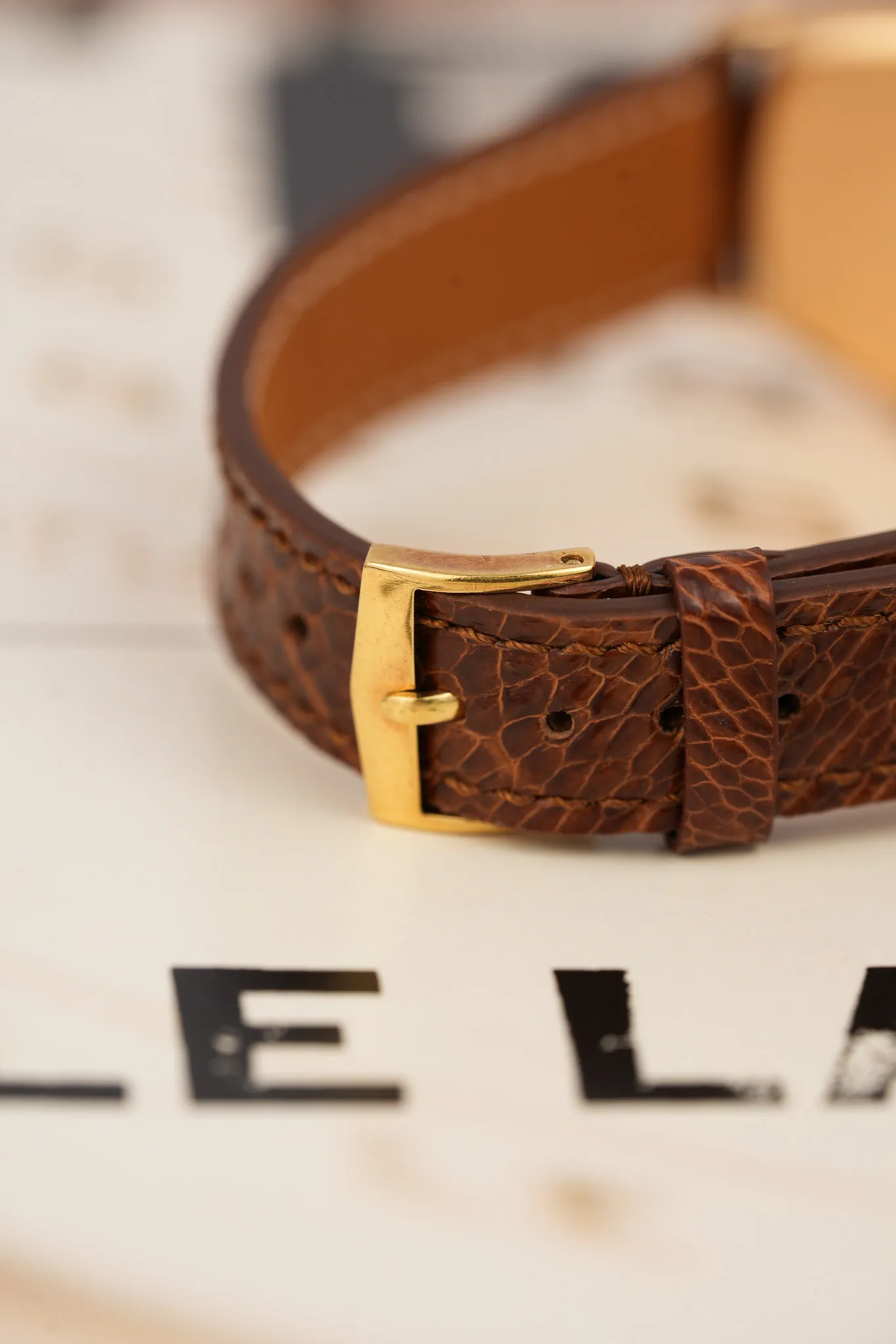 Strap is a high-quality brown alligator with a signed yellow gold buckle.