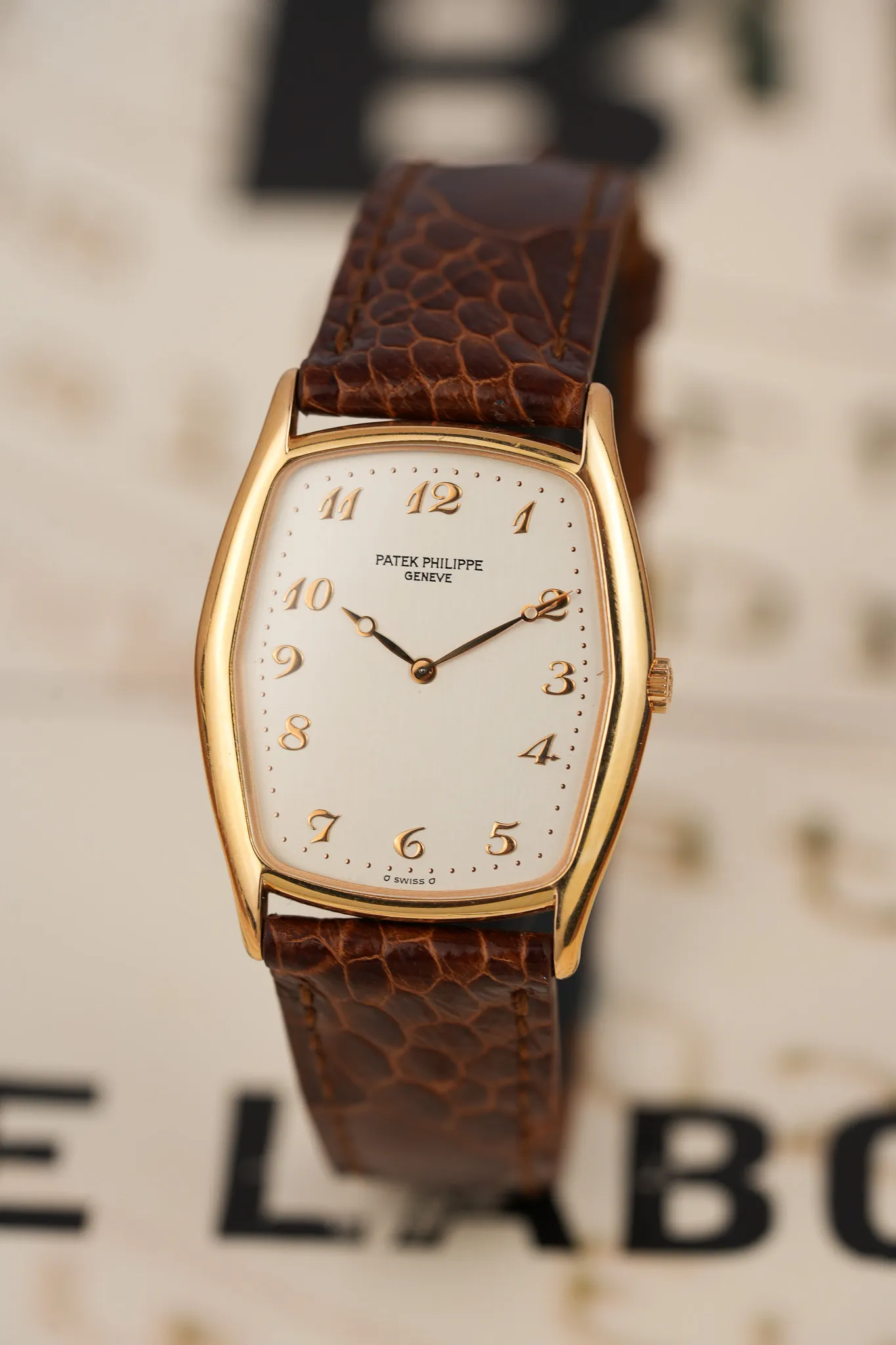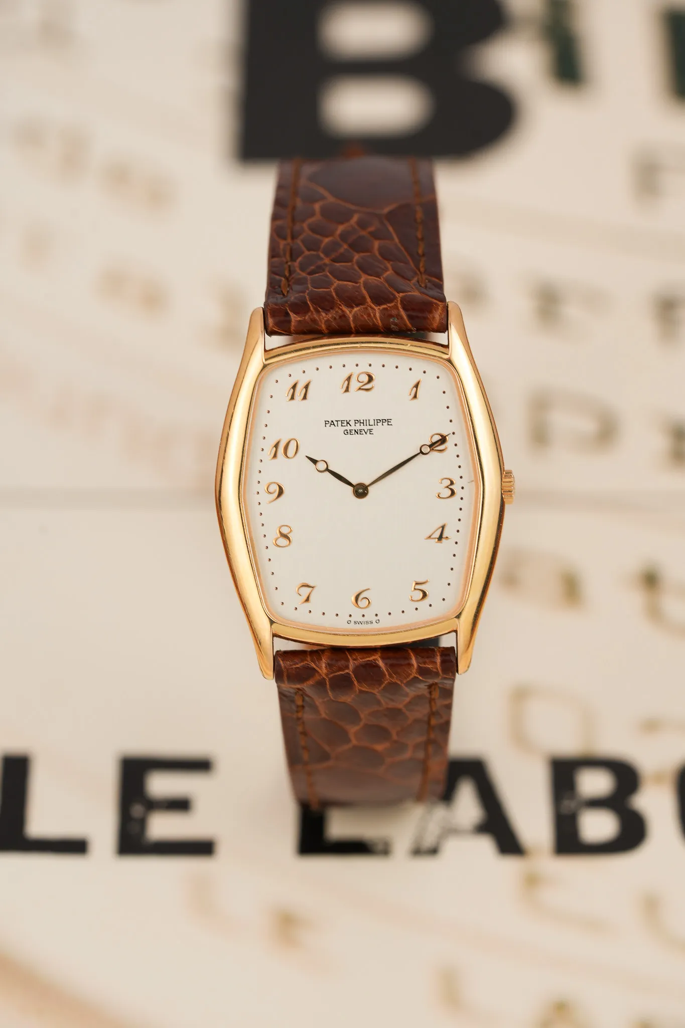 This reference 3842 is a perfect example. Cased in beautifully warm yellow gold, the form hovers between tonneau and cushion—not quite either, but just curved enough to distinguish itself from the crowd. At 29mm wide, it wears compact but not delicate, especially with a rich lizard strap and matching 18K yellow gold buckle.