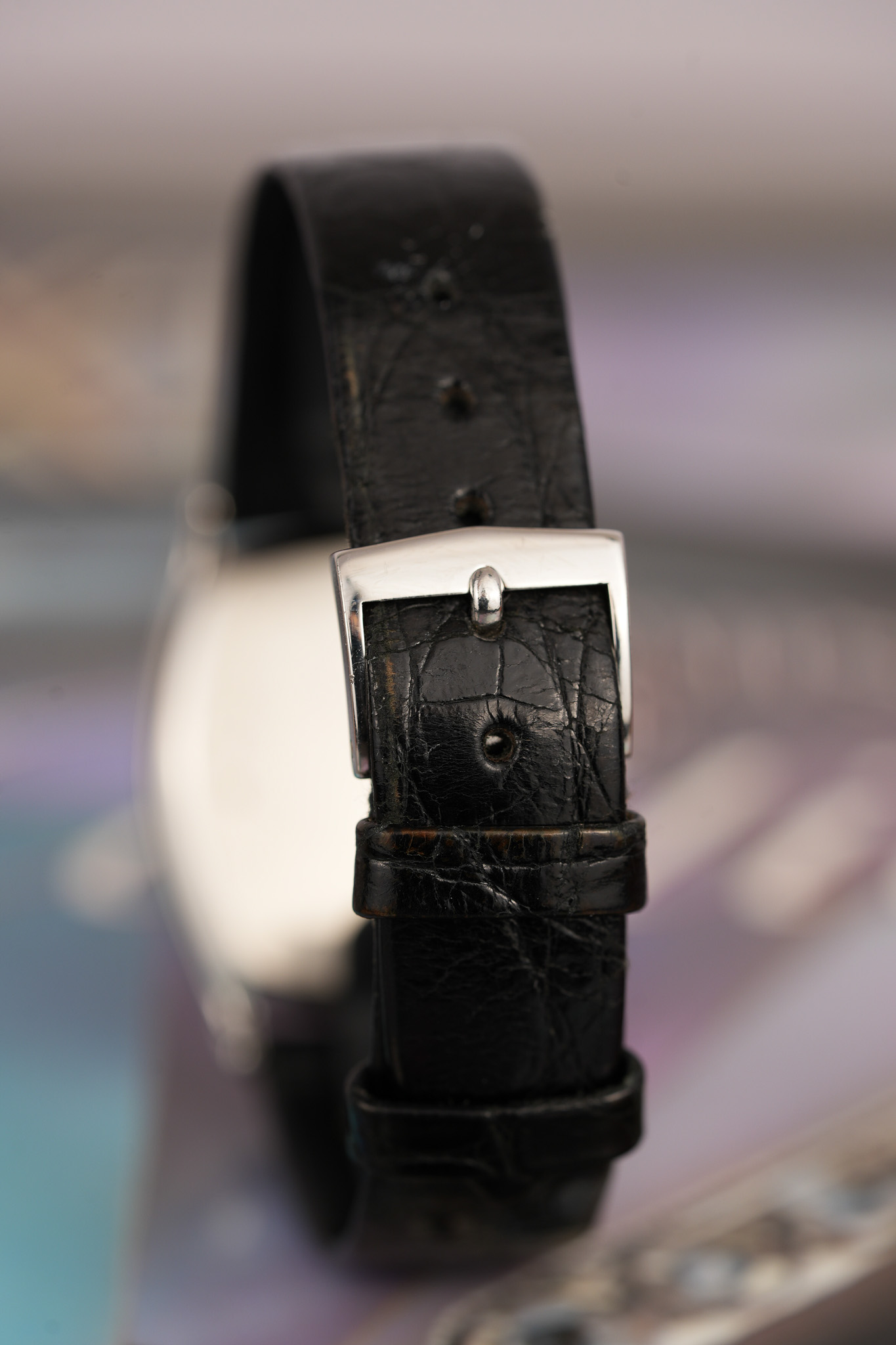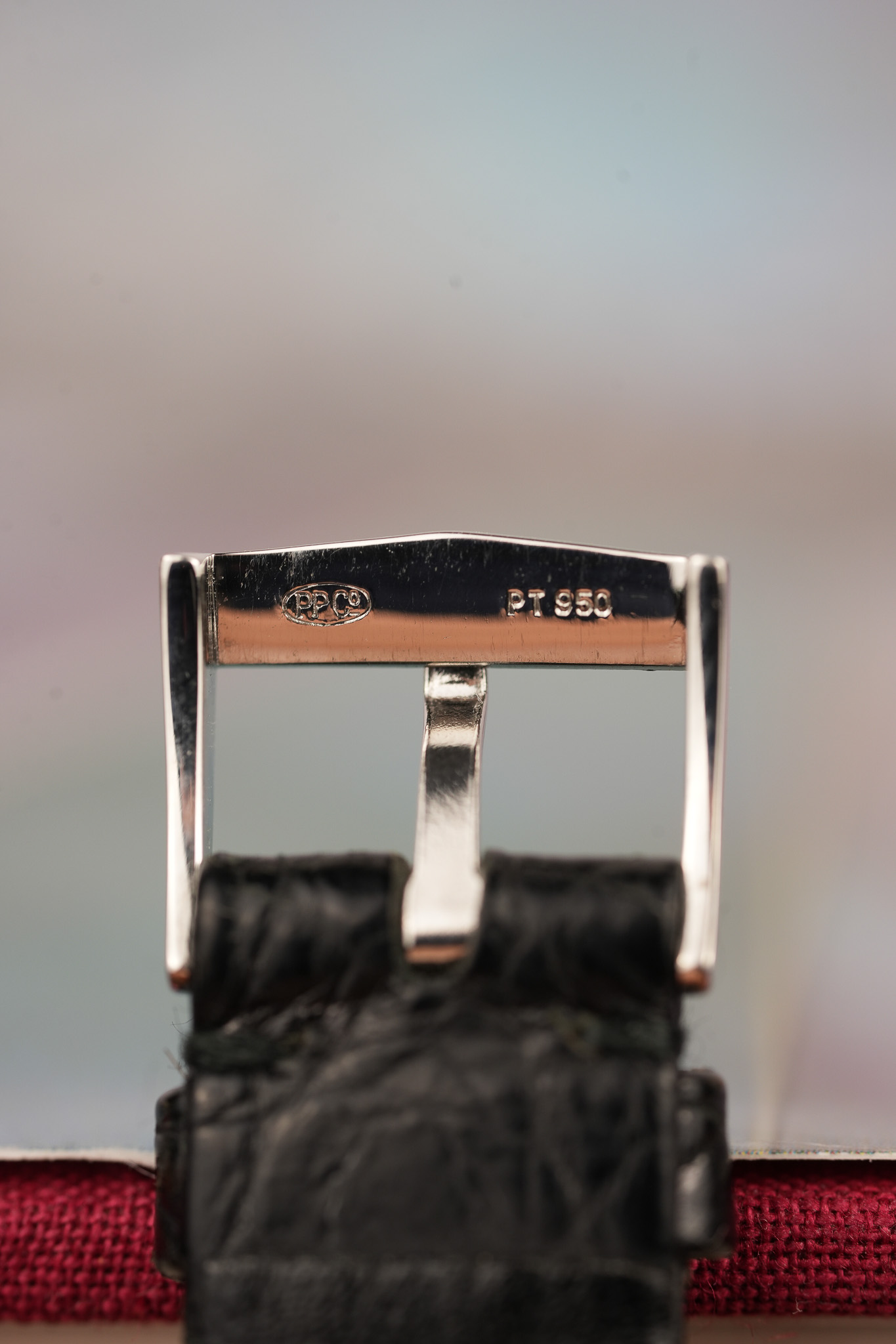 Original platinum Patek Philippe buckle and leather strap remain in excellent condition.