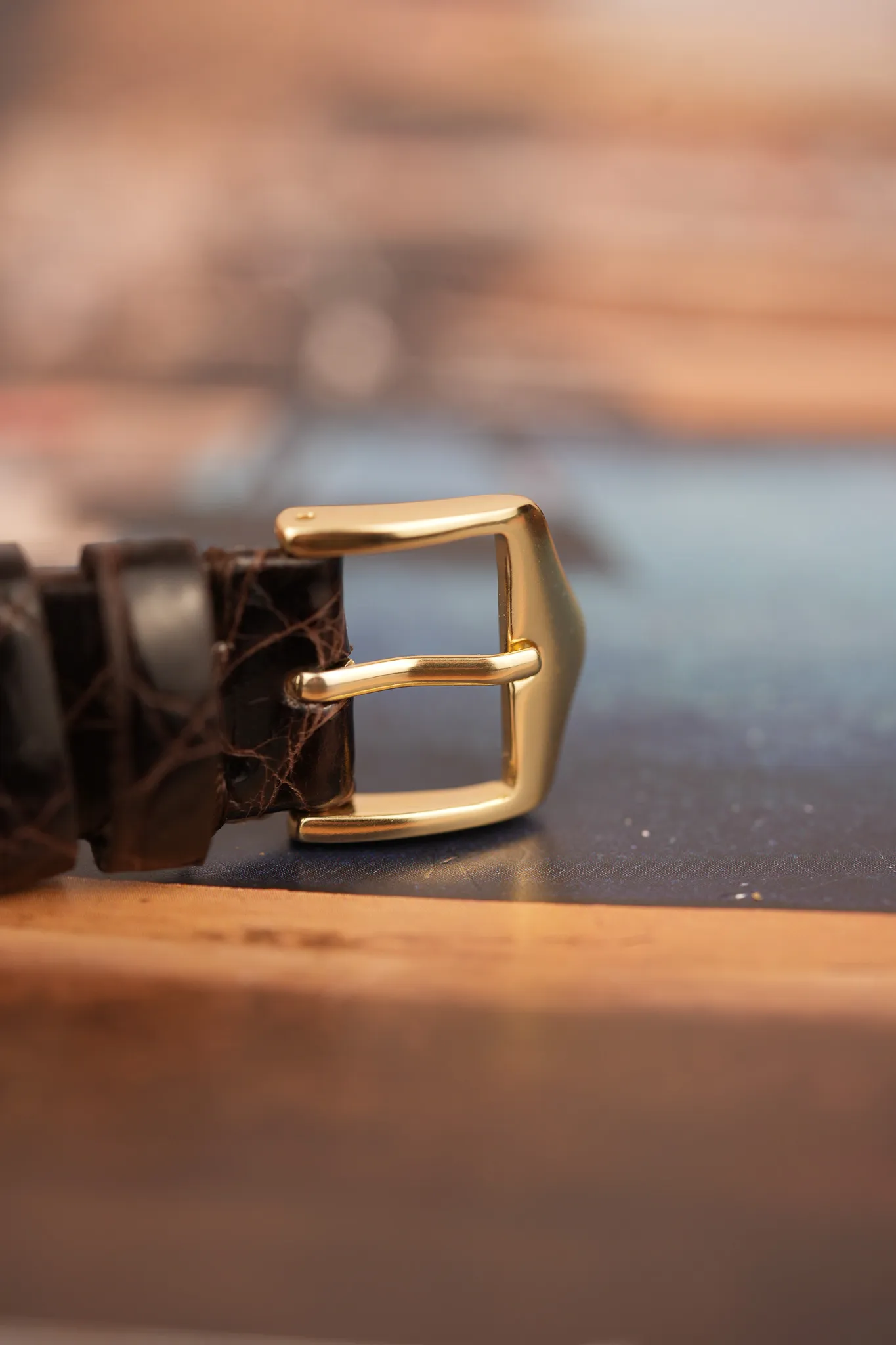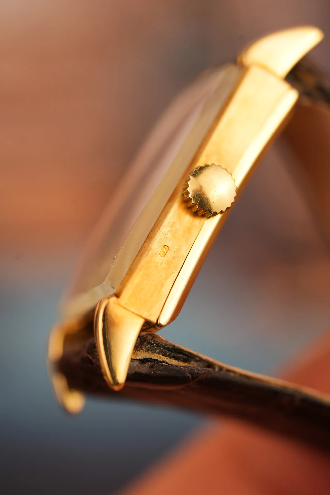 The 18k yellow gold case by Weber & Cie SA retains sharp lines, well-defined lugs, and clear proportions with light surface wear consistent with age.