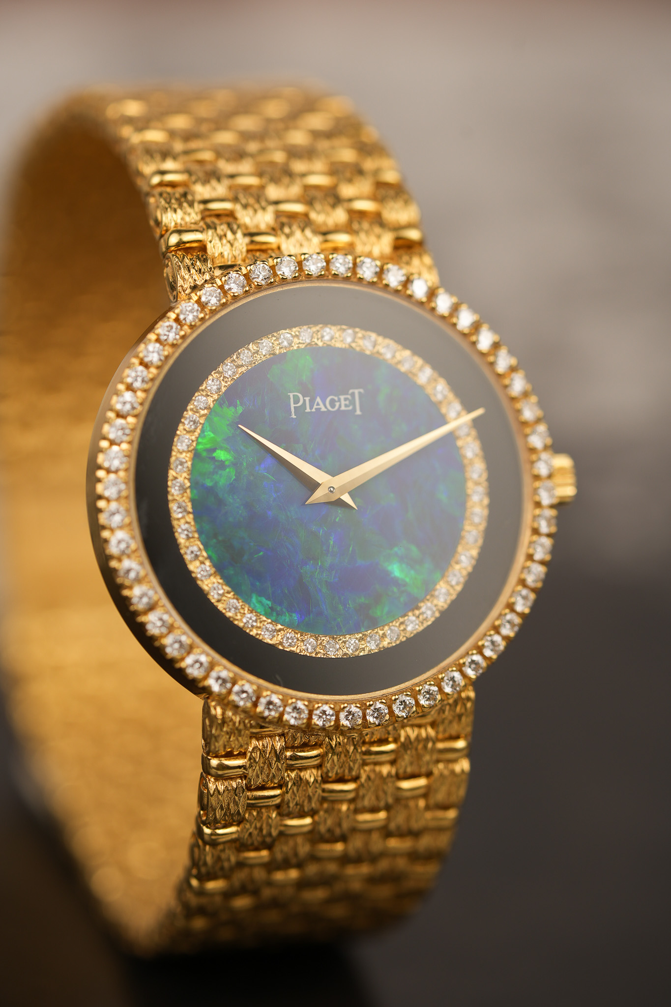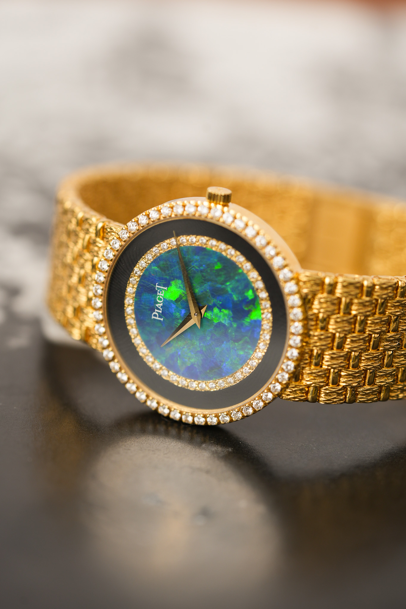 The case and bracelet are, of course, 18K yellow gold—this is Piaget, after all, the House of Gold™ (not officially, but it really should be). Circa 1980s, this model captures that golden-era Piaget mood when opulence was the assignment and they really didn’t leave any gemstone unturned. Couldn't decide between opal, diamonds, onyx, or gold? Use all four. Problem solved.