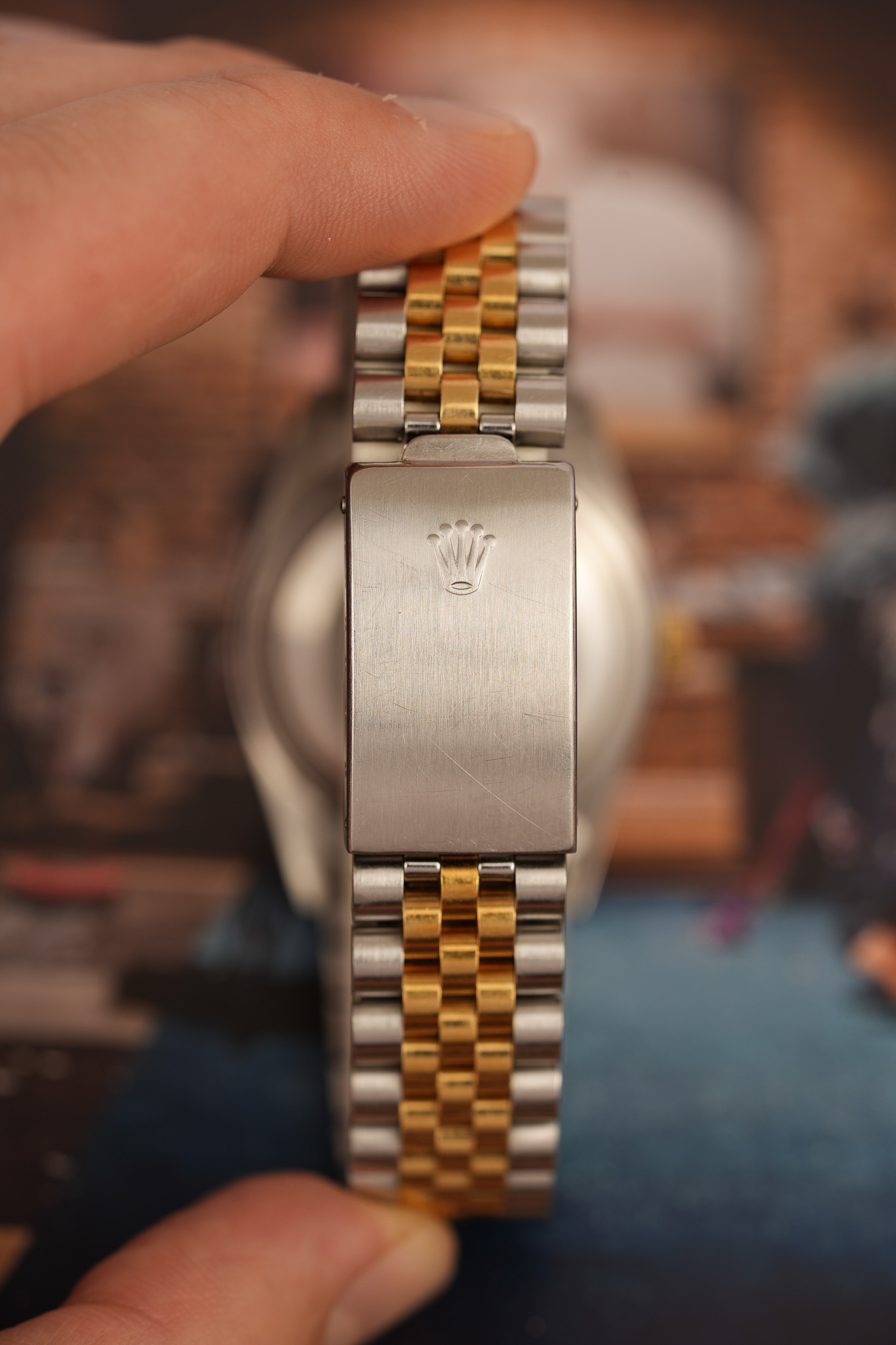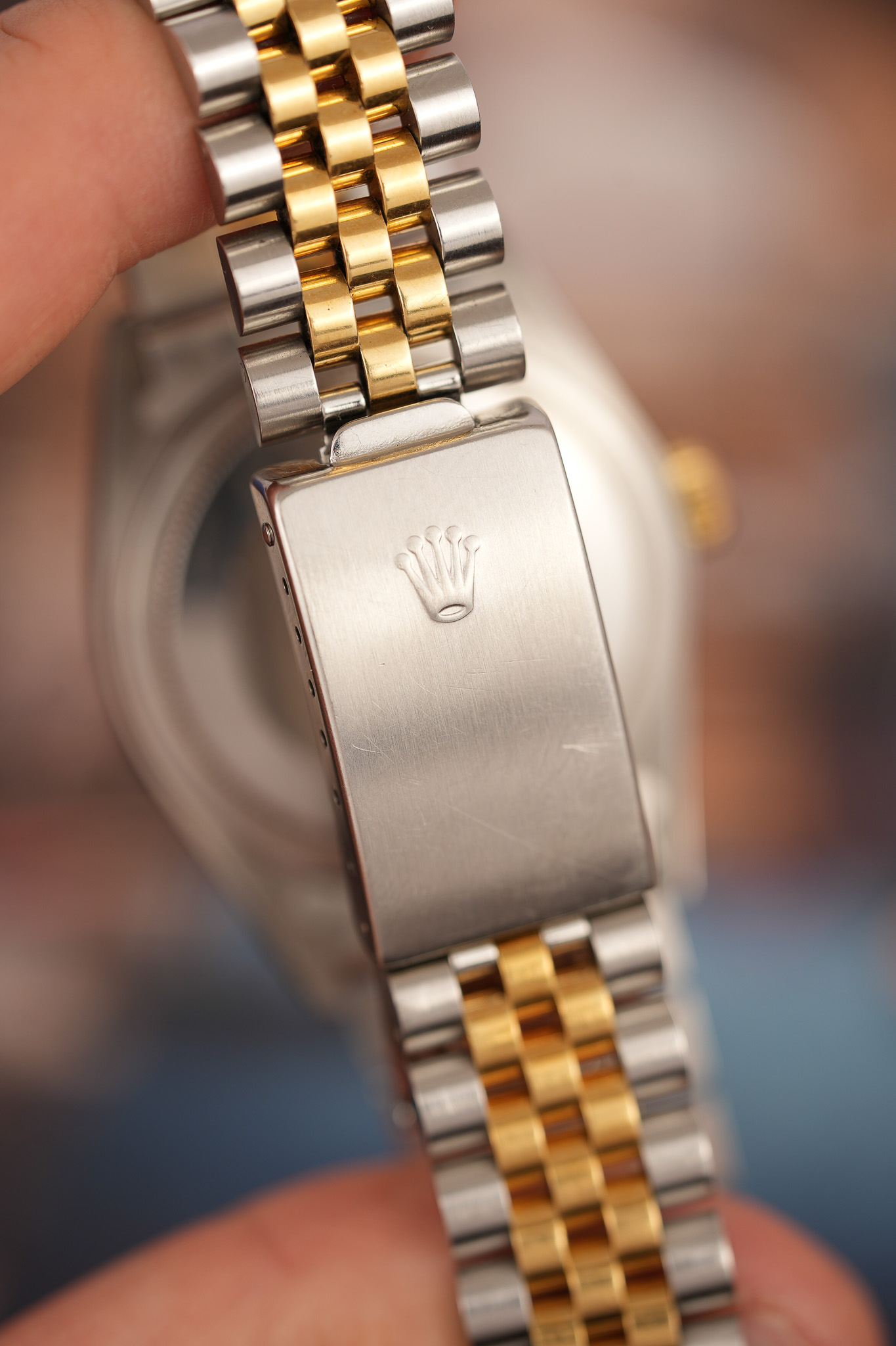On the wrist, the original two-tone Jubilee bracelet brings just the right amount of flash and still fits up to an 8-inch wrist comfortably, with minimal stretch. Flip it over and you’ll find the stamped Rolex clasp in excellent condition. Inside, the automatic caliber 3035 movement keeps things running with that familiar Rolex smoothness and quickset date functionality, making this one of the most wearable vintage references.