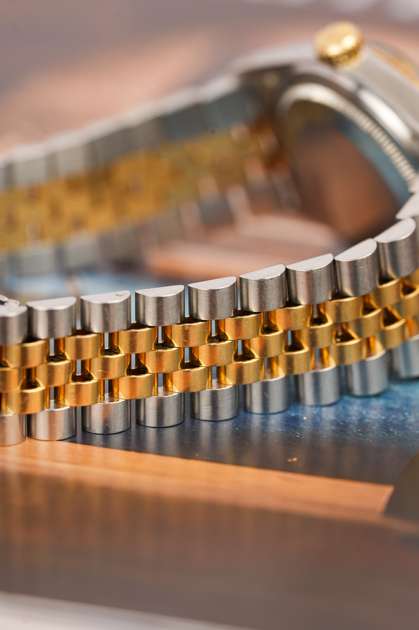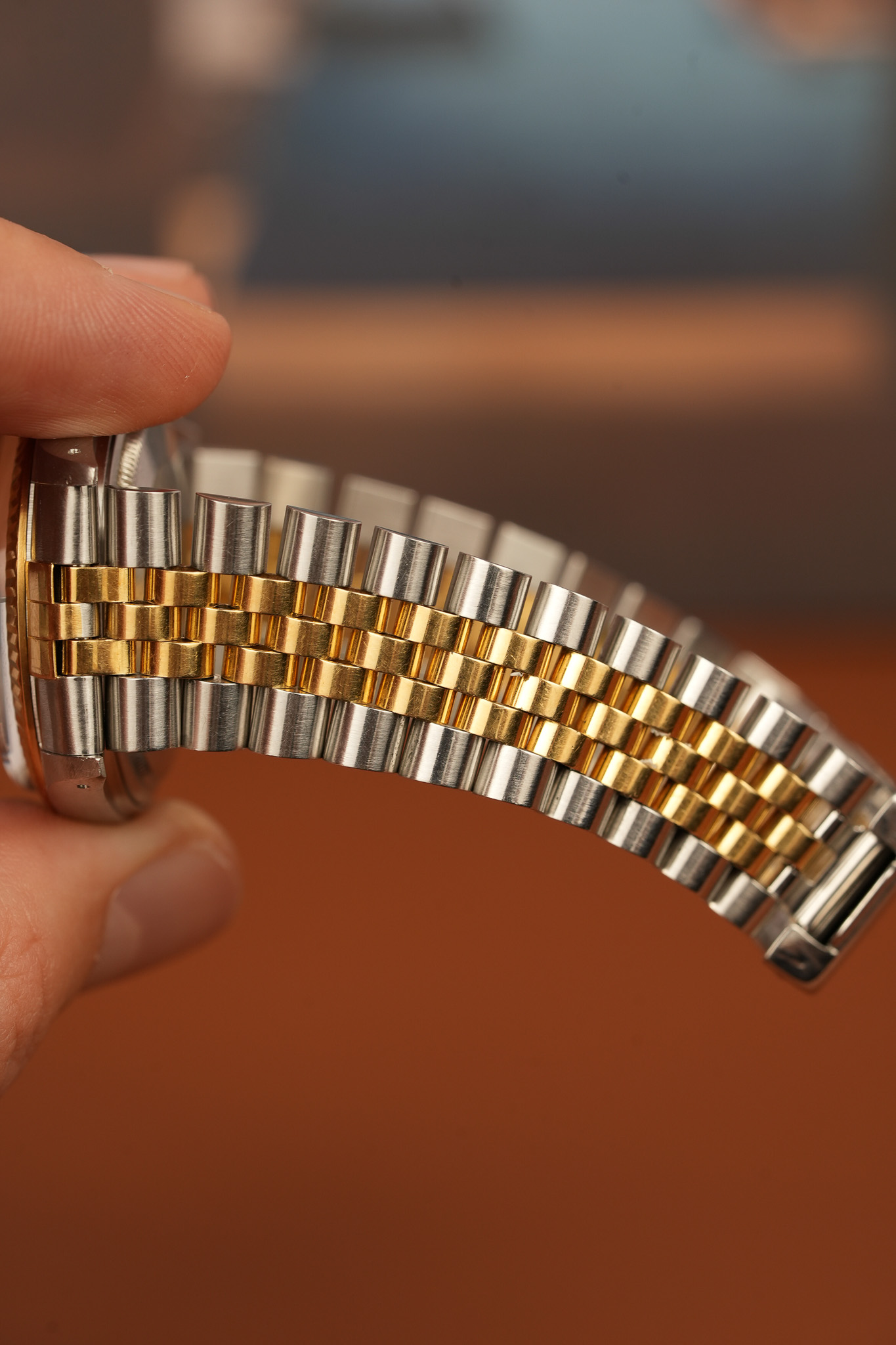 Housed in a 36mm stainless steel Oyster case, this Datejust brings balance — tough enough to be worn daily but dressed up with its 18k yellow gold bezel and matching crown. The case remains sharp with strong lines, and the bezel still shows its crisp definition, catching light with every turn of the wrist.
