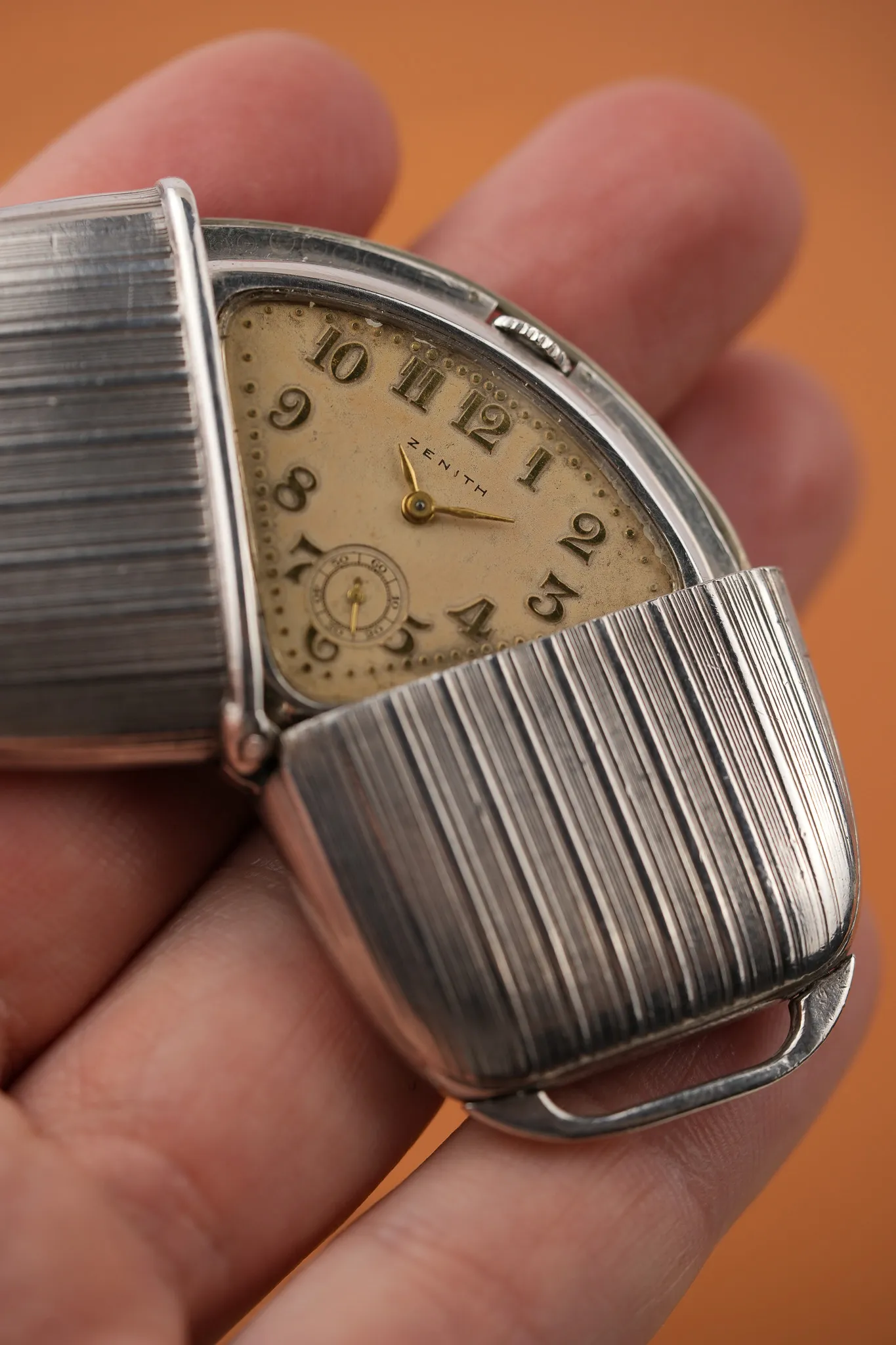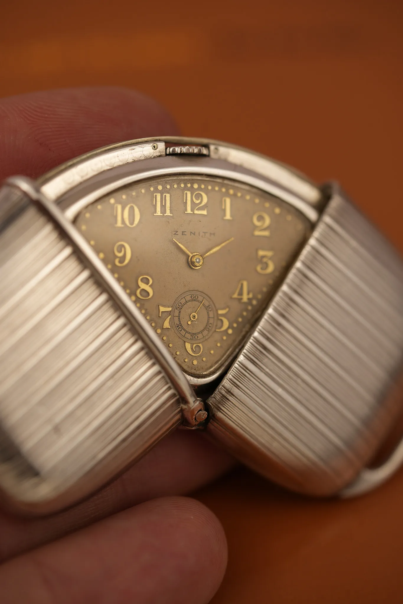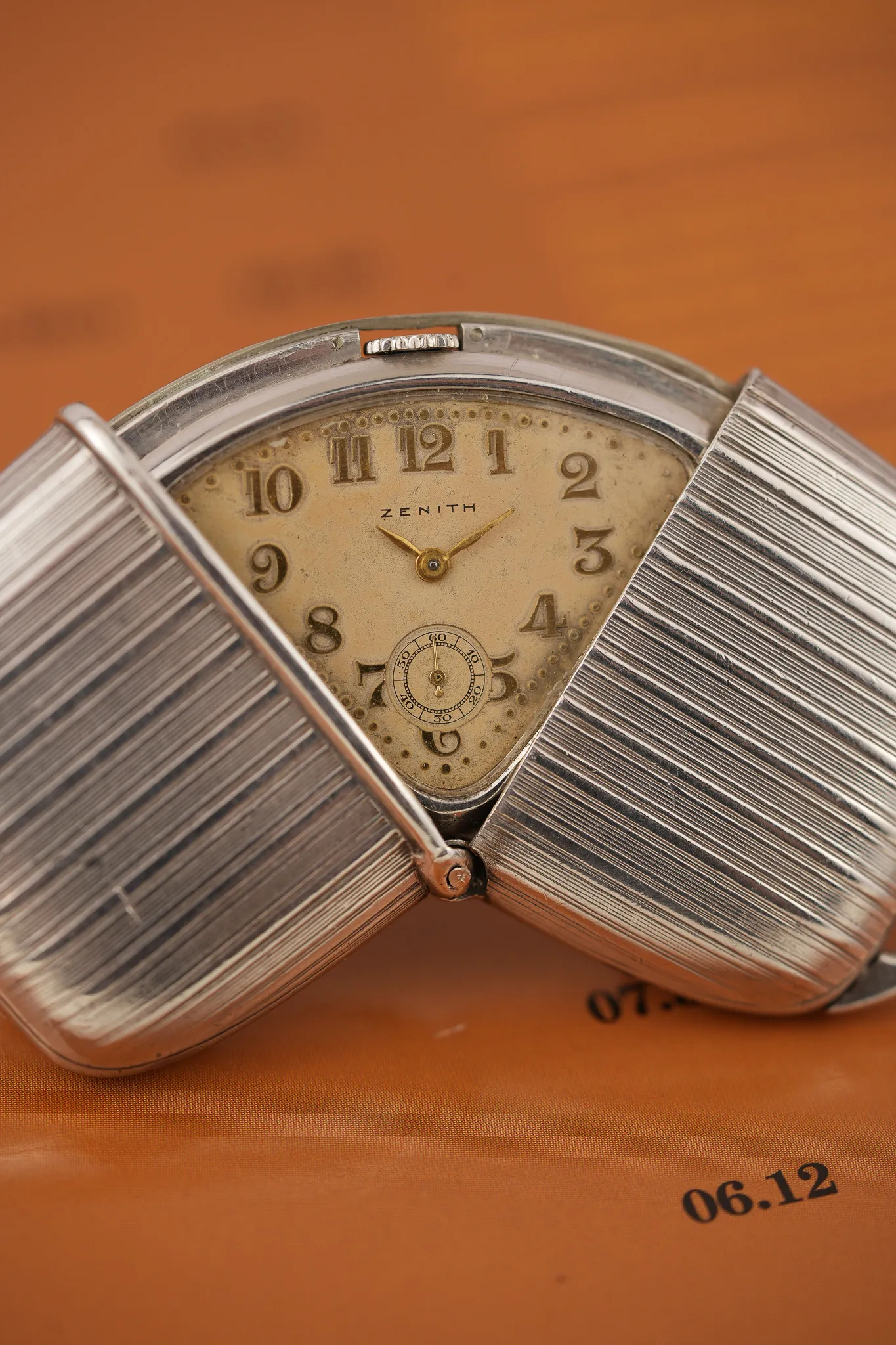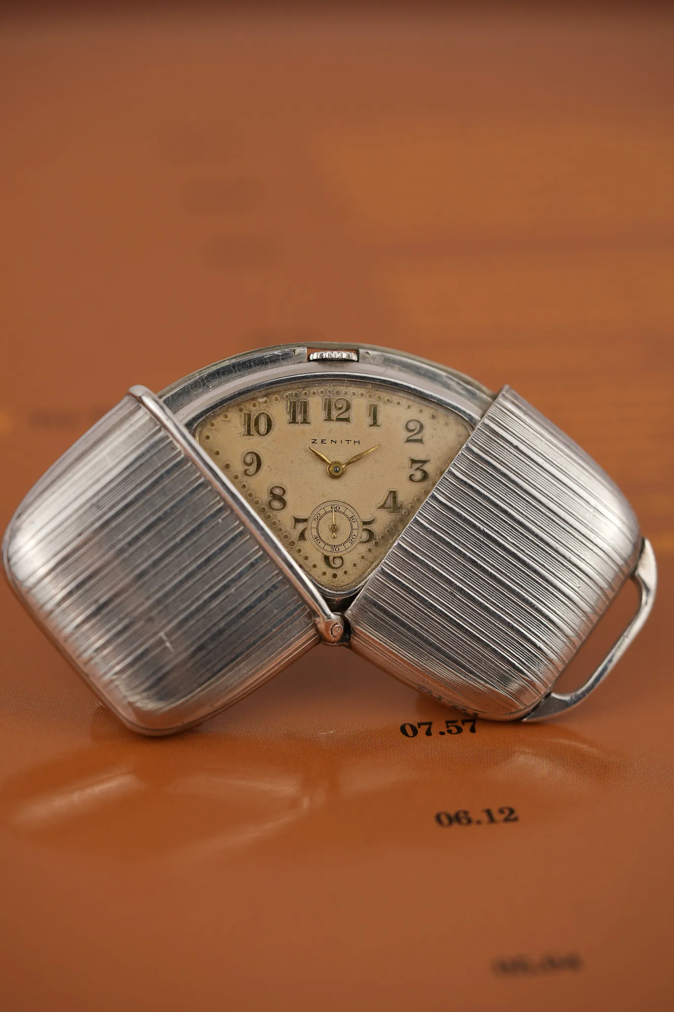 The 1930 Zenith “Crescent” travel watch isn’t shy about doing things differently. Rather than a standard pull out or flat-fold, its 0.925 silver case opens in a satisfying arc—like a croissant unfolding or a quiet nod to the early days of modern design. Fitted with a curved hinge and a snap closure, the watch is clever, elegant, and rarely seen. It speaks to an era when even the smallest object had the license to be well thought-out.