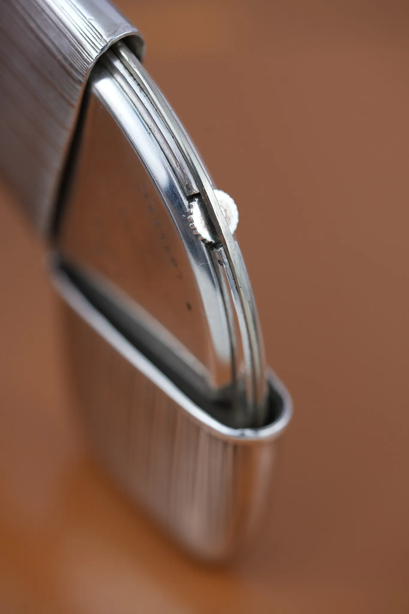 On the outside, the silver case is engraved with alternating fine and thick linear patterns—simple, directional, and quietly stylish. Flip it over and the case back is hallmarked with the Swiss bear hallmark and the letter “L,” placing its silver assay in Le Locle, a small town with a large footprint in Swiss watchmaking. It's also signed “Brevet” with the Swiss Federal Cross—a mark that indicates a granted patent. No number here, but the design says plenty on its own.