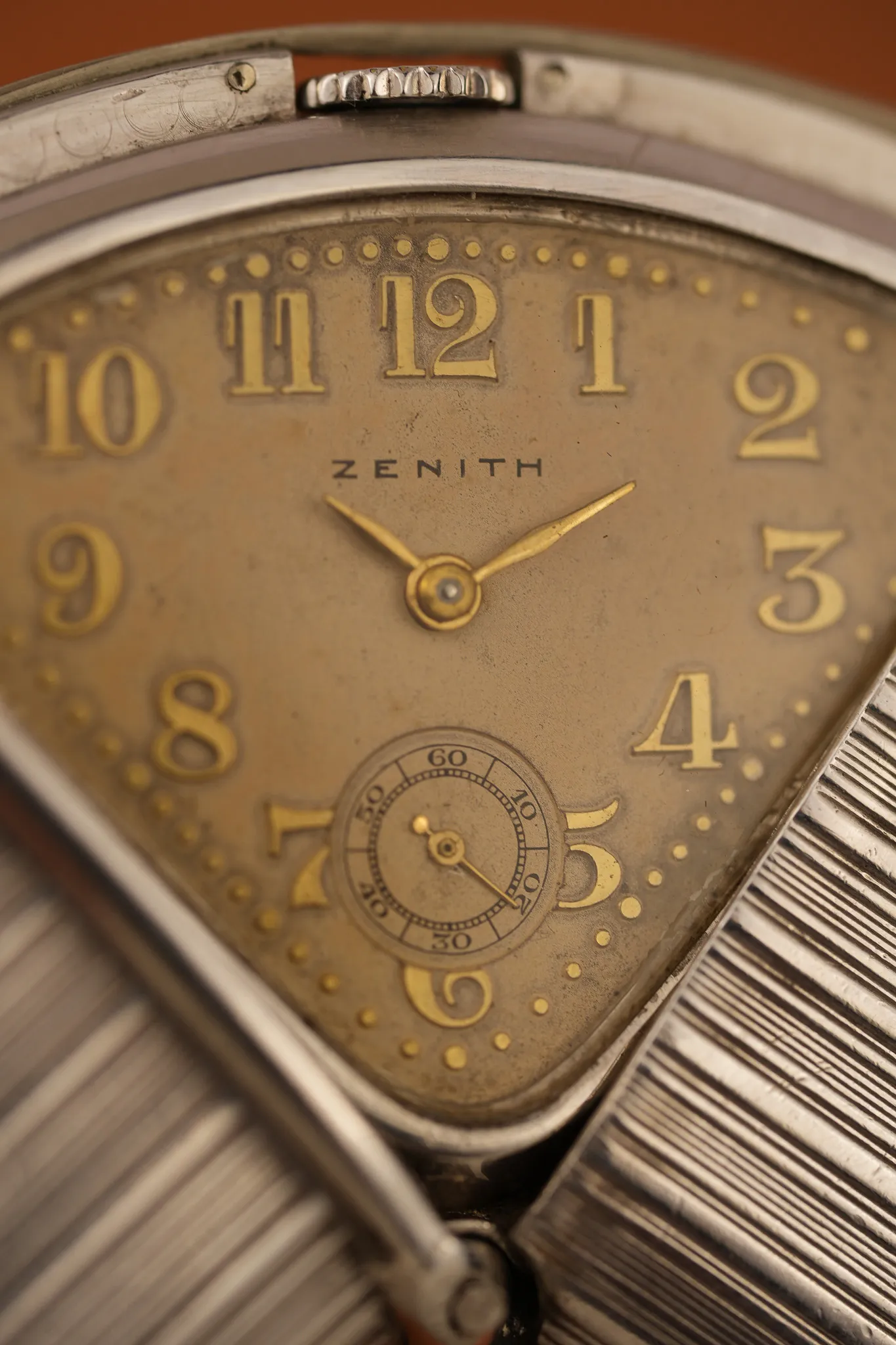 The dial is all charm. Creamed over with age, but clean, clear, and classically styled with Breguet numerals in warm gold. The outer track is a series of matching circular markers, delicately placed. The Zenith logo remains sharp in black, and the gold-tone hands catch just enough light to remain legible but never loud. A sub-seconds dial, tucked neatly between the 5 and 7 markers, rounds out the composition. Painted crisply, with no signs of overuse.